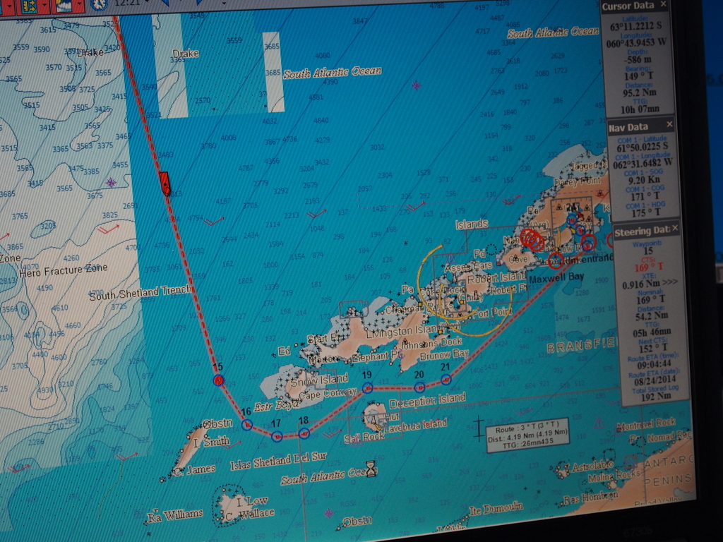 The plan of the day, such as it ever is, has shifted. The winds last night precluded doing another CTD at Station 2, so our chief scientist decided we’d try to catch it on the way back, and instead make a direct course for the South Shetlands to drop off freshies for a couple of research bases in Admiralty Bay. If I’m reading the charts correctly, we ought to be there by nightfall. No idea who, if anyone, gets to go ashore, but I do believe I’ll be off shift then, so if they need any volunteers to help haul freshies, I do have prior experience. Just saying.