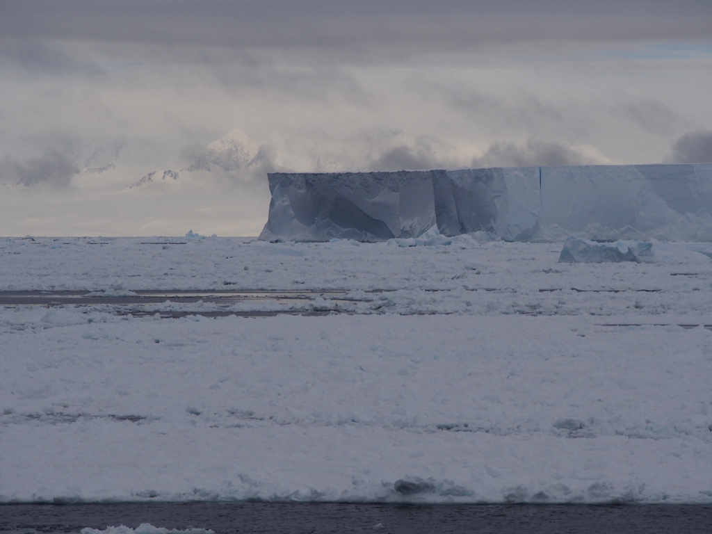 We’re all feeling lucky to be here, even the old-timers – it’s a constant topic of conversation, the way most people might make idle talk about the weather. I was out on the starboard rail of the 01 deck with Cliff yesterday afternoon as we motored through the bergy water to a station just off the tip of Graham Land (yeah, that’s what they call it: “bergy water”). Enormous flat-topped islands of ice, fifteen stories high and a mile on any side paraded past us among the jumble wreckage of old glaciers that had bled out into the sea. And every minute or two there’d be the sound of the hatch opening and another squee as Rachel or Elliot or Sara emerged, camera in hand to try to capture the uncaptureable scale of our surroundings. We were Gullivers afloat on a sea of ice.