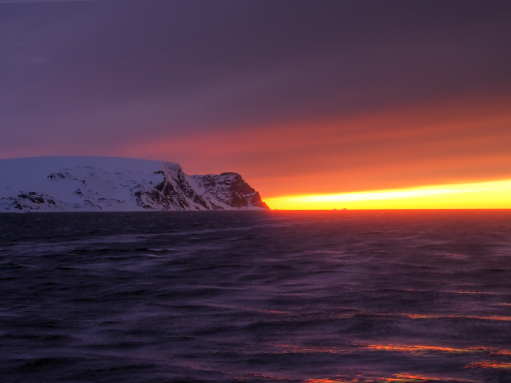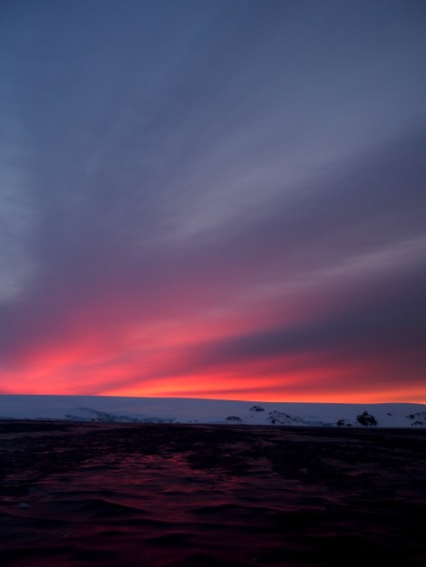 We don’t have windows on my side of the ship, but at some point around 5:00 I happen to peer out the portholes in the Dry Lab and see that we were navigating the mouth of Admiralty Bay to a glorious, glorious sunrise. We don’t get enough actual sun to (briefly) discern a big round ball of fire in space until afternoon, but what a show it is right now: red, orange and yellow light over the pink shadow on snow, reflected as blues and purples in the mottled grease ice of the bay. Freakishly cold by wimpy California boy standards, but I stay out there with frozen fingers and shot until my battery dies.