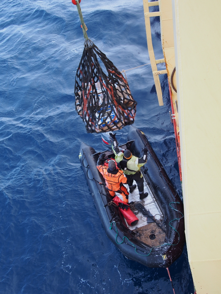 The Poles have apparently had a good evening the night before, so we churn around the bay for a little before they’re able to muster a Zodiac to come out and pick up the goods. There’s a brief exchange of hospitality over the side of the boat – folks here have chipped in a few special gifts like a hard drive of music and movies and a couple pounds of spare Peet’s coffee beans – and Alec lowers the goods from our starboard crane. These encounters seem to be a well-developed ritual in the Antarctic: Betz, our hardcore MLT, has worn shorts for the occasion and Tom, ever the showman, has mustered a tuxedo to preside over the honors.