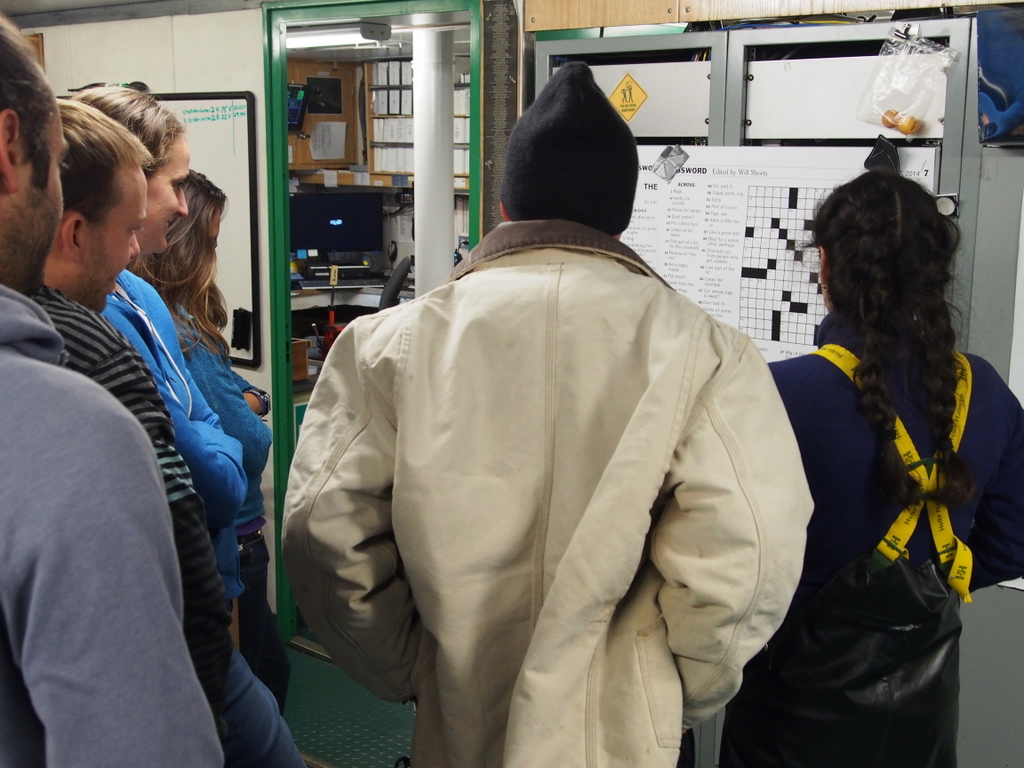 There’s a different rhythm on the ship when we’re waiting. Running the grid, we’ve got maybe an hour or two between stations while the zoo folks sort and classify the critters from the last stop. Once the GPS tells us we’re at the next point, we hold position for 20 or so minutes while Tom or Alec drop a CTD and haul it back up (I wrote about those in a previous post, I think – a sensor pod for measuring conductivity, temperature and depth, surrounded by a big array of PVC tubes that capture seawater samples at various points on the way up). Once the CTD is stowed, folks head to the back deck to deploy the net, which we tow slowly for about 10 minutes at depth to get an idea of who/what’s living there. As soon as the net’s up, samples go to zoo lab for sorting, and we’re on our way to the next station. Wash, rinse and repeat for two twelve-hour shifts, 24 hours a day.