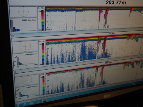 We’ve made our way back into the protection of the South Shetlands to have another try at setting up some calibration equipment for future research teams. So much of what we’re doing depends on inferring what’s under the water from the reflected signals we send down, so it’s important to have some ground truth to use as reference. Ground truth for this particular calibration will be to a two-inch spherical target made out of unobtainium or such that gets suspended beneath the boat by fishing line. We (meaning someone other than me) know the acoustic properties of the ball, so bouncing the multi-band sonar off it allows us (again, someone who isn’t me) to tune the fiddly bits of the transducers to make sure what we (yeah, yeah) think looks like a two-inch metal sphere at 20 fathoms really is one.