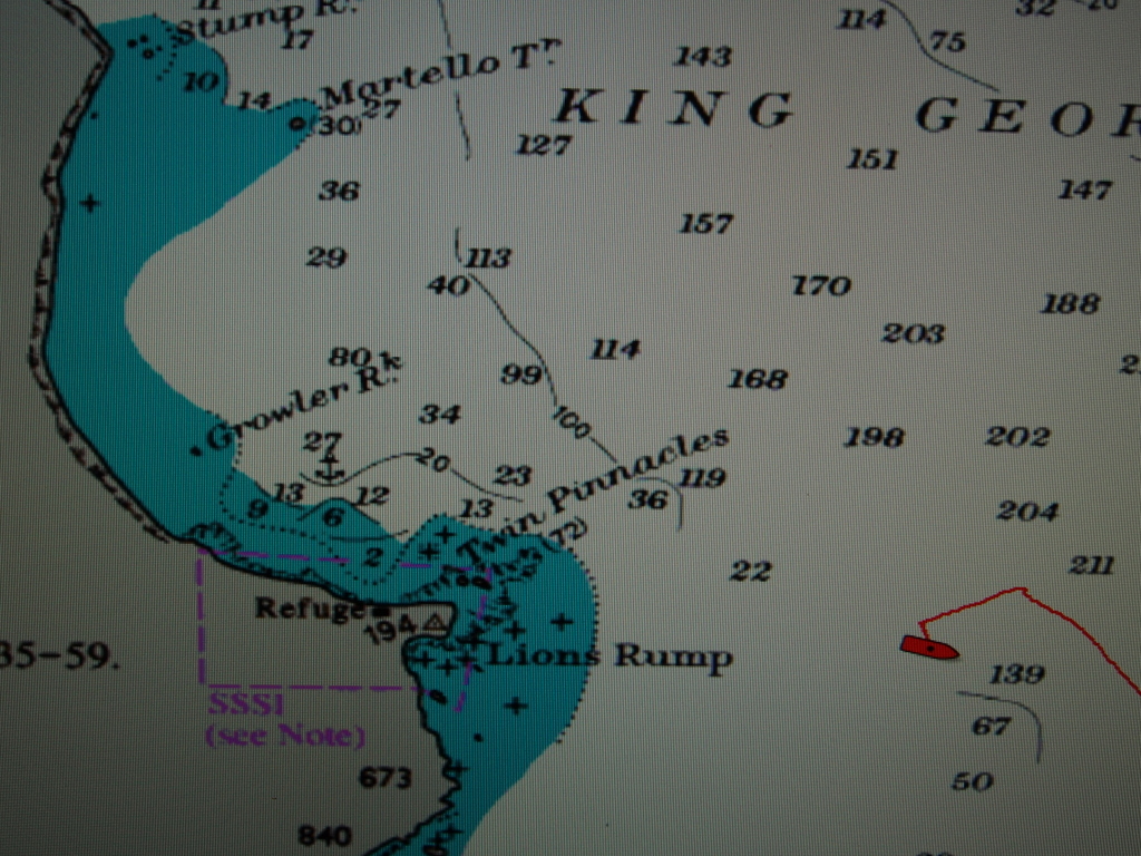 That’s where King George Bay comes in – a hundred years of nautical trial and error discovered a sandy bottom 27 fathoms down at the west end of the bay, just north of the Twin Pinnacles and the (apparently distinctive) Lion’s Rump. But Captain doesn’t want to try getting in so close to land in the dark, so we’re holding station, turning circles out here until sunrise.