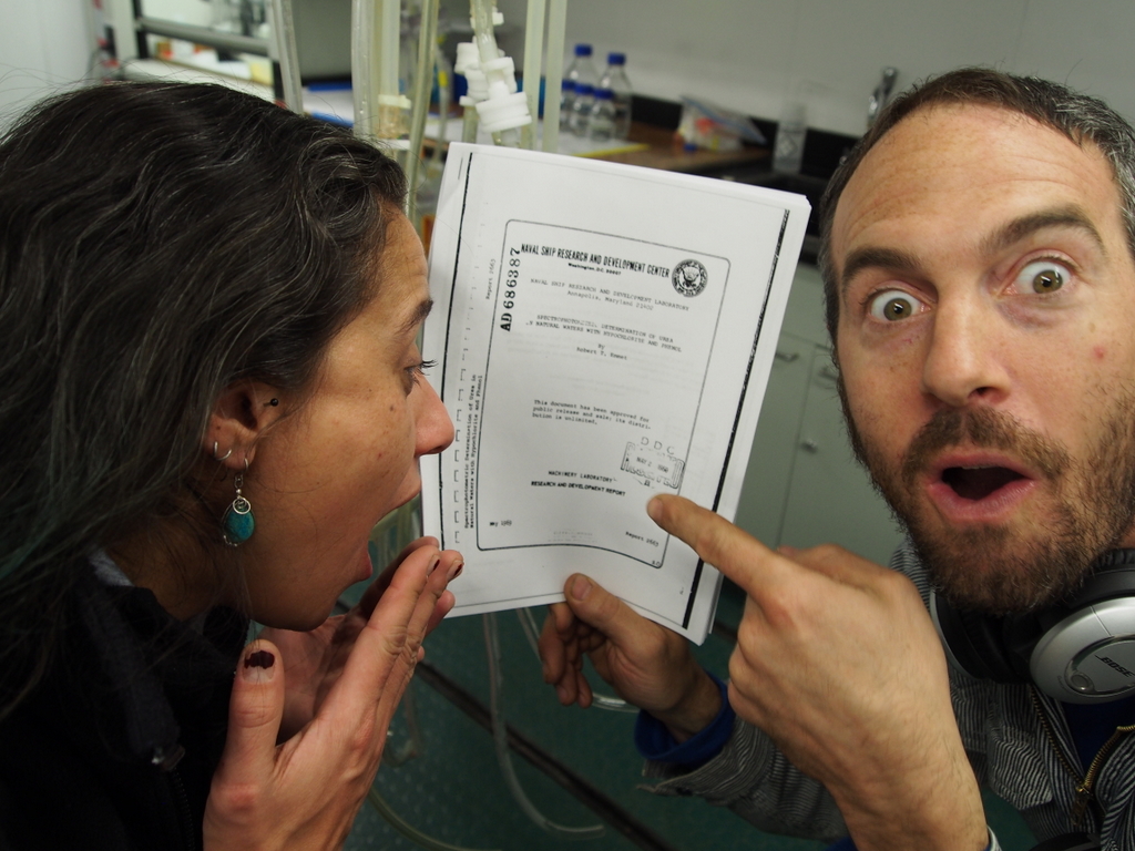 My routine seems like the only one that hasn’t changed much: I run the dailies and reboot the ship’s wifi when it locks up (a couple of times a day, at least). Restock the printers and helped Emilio recover a doc lost in the bowels of Windows Tempfile hell. My one bit of excitement was Carla needing to find a procedure for chemically detecting urea in sea water. Going to Google with our daily 15MB quota gives 7 clicks at most, not counting trying to actually download any results (I knew the web was bloated, but 2MB per query?!? I mean – really!). First click was behind a pay wall tease, but I nailed it on the second try with a mostly-legible scan of a 1969 Naval Research Report (NRC#2663): The Spectrophotometric Determination of Urea in Natural Waters with Hypochlorite and Phenol. Download, print and handoff (“Excuse me Ma’am, I think this is the report you’re looking for”) to a squee of happiness – yeah, that’s what I live for – and I still had enough quota left to check XKCD and Gunnerkrig Court. Felt like a total websearch ninja, I’ll tell you.