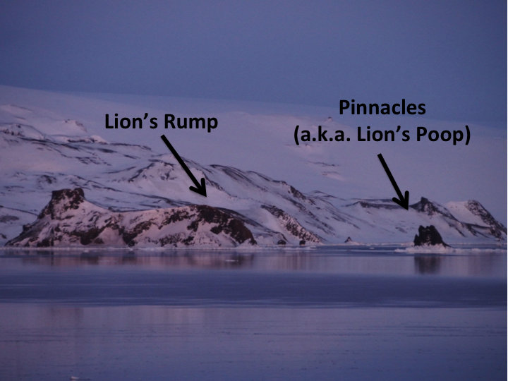 You remember how I wrote yesterday about the geographic features of King George Bay? How the Admiralty Guide referred to The Pinnacles, and the “distinctively shaped” Lion’s Rump at the head of the bay? Well, here they are.