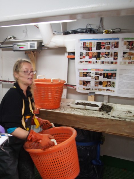 Christopher and Emilio are after the vertebrates – the fish – who don’t have as happy a fate. Once they’ve been weighed, etc., most of them get opened up to see what they’ve been eating and what condition various organs are to infer age and health, to get a sense of how life in general is doing at the bottom.