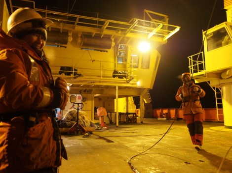 Patricia and Tom get the net ready while Rachel waves from Aft Control (under the spotlight)