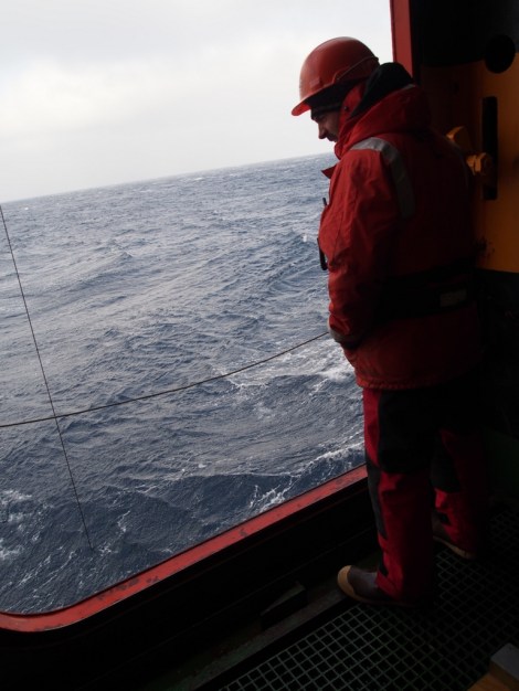 The weather itself is a thing of beauty. Today it’s blowing 40 knots in blowing snow (wind chill -32). It’s nice and warm inside, but given how much windage the Palmer carries, we’ve all just gotten used to walking at a constant angle from the tilted floor. When I need to get away from my code these days, I’ve been hanging out in the Baltic with Tom when he does CTD casts, trying to help out and not get too much in the way. There’s something very grounding about leaning against a life line out the side of a ship as you lower a honking big scientific contraption down to the bottom of the sea, looking out at unthinkably cold sea of ice churning and crashing a just a few feet below you.