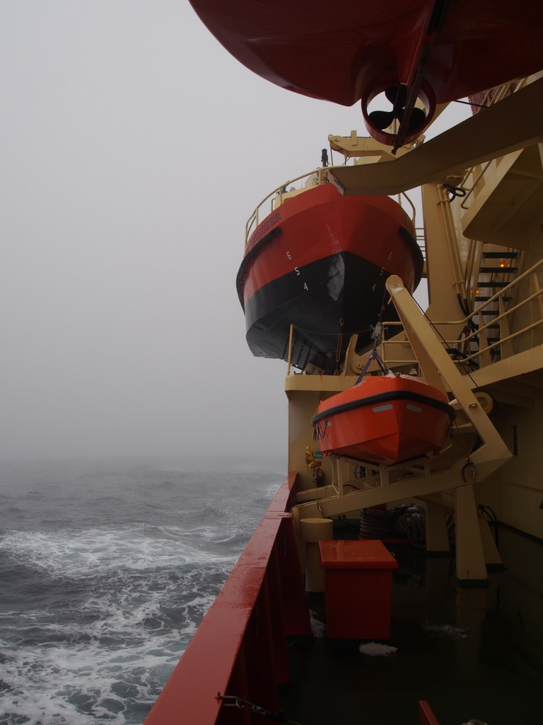 A hundred miles north of the King George Island on our homeward run there’s no question that we’re back in the Drake. The deck is pitching enough to make walking anywhere a somewhat statistical matter, and anything that could roll, tip or slide when it really gets rough is already battened down. Even so, the ship is alive with sound and motion: office chairs squeak and spin in slow unison, as dangling coats and cables sway to the rhythm. Cabinets creak with every change, and the forward corridor on main deck whistles hauntingly with a wind from somewhere whenever the starboard slips into a trough.