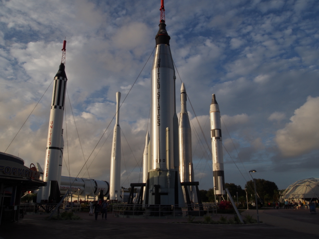 Only complaint – other than the glorious blue skies and fair winds down at KSC – was that the tour guides were tuned for the Disney World crowd. So there was no one to ask about how the F1 engines gimballed, why they chose kerosene for the lower stage but liquid hydrogen for the upper two, or why the H2 tanks of the upper stages were much larger than you’d expect for a simple 2 H2 + 02 -> 2 H2O reaction. Fortunately, out at the “Rocket Park” area, I noticed a couple of guys pointing knowingly at the fiddly bits of an engine they had mounted outside. I guessed that they were actual rocket scientists and pummeled them with questions (Answers, by the way, are: 1) two electro-hydraulic struts per engine, 2) weight and ease of handling, and 3) not sure, but may be to allow for boil-off, given that the O2 on the other side of the common bulkhead was over 100 degrees warmer, so it would have been like the H2 was sitting on a stove.)
