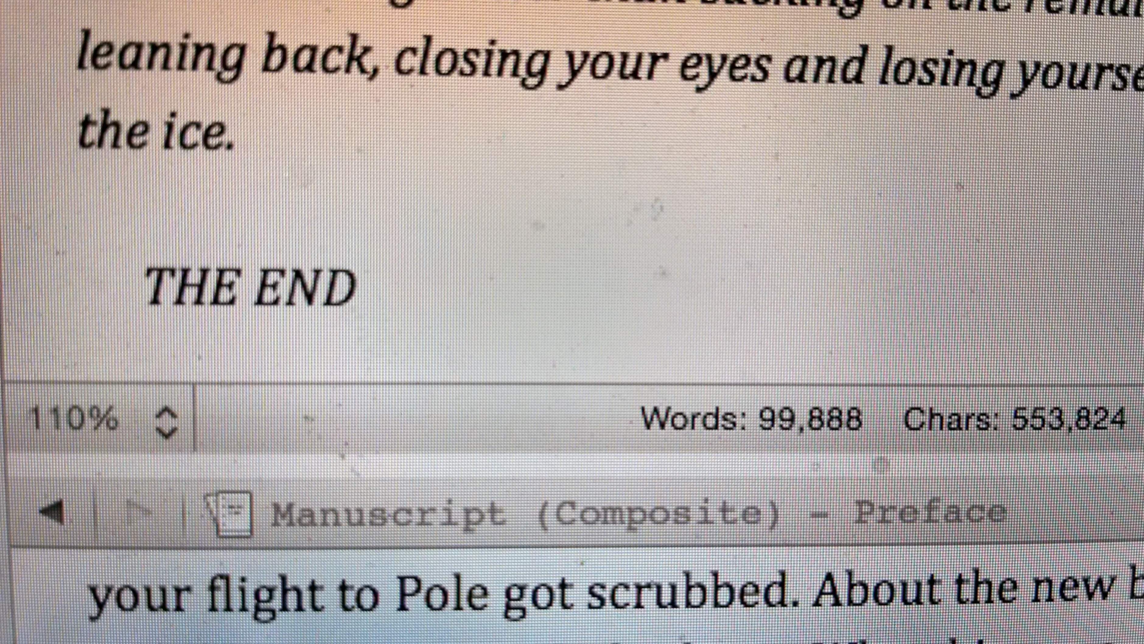 So, a little over four years from when I set the first words down, five and a half months after I threw out my third draft and started again from scratch, a mere 112 words shy of that magic six-figure word count, I found myself at my favorite table in Coupa Cafe typing something entirely unexpected: “The End.”