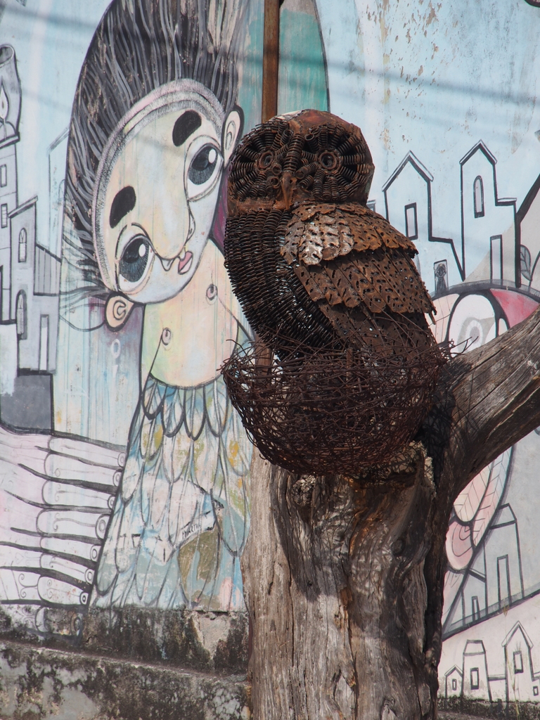 We spent a morning in Muraleando – an artists’ community in the hills above the harbor, built on the land grant of an old dump. I’ve forgotten how many truckloads of trash they said they had to haul away before they got down to street level, but now those same streets are decorated with gorgeous painting and sculptures.