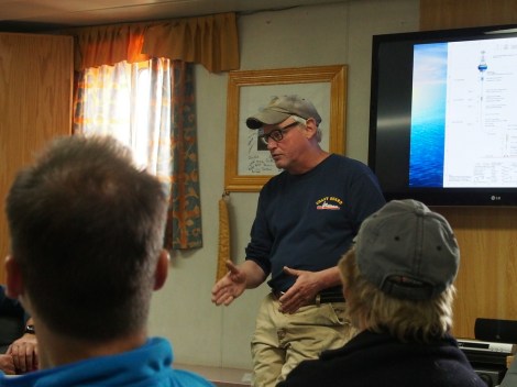 At the moment we’re waiting for the seas to calm enough for us to deploy SUMO2 (surface mooring 2), the honking big piece of science at center stage on the back deck. It’s one of four moorings we’re deploying this cruise, and the only one that has any actual bits above water. The other three all take undersea measurements that get relayed to SUMO by gliders and magic. I’ll write more about them when the time comes, but for now, we’re mostly biding our time.