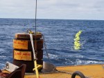 The procedure that WHOI and OOI have developed entails marking the target site for the anchor, then drifting about six miles downwind/current before “pushing” the buoy out with the aft A-frame. We then motor slowly upwind to (and a little past) the anchor site letting out line and instruments. Once it’s all played out and stretched along the surface, the anchor goes overboard, sucking the entire string under and dragging the SUMO buoy along the surface like it’s trying to waterski behind a submarine.