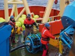 The big challenge, of course, is getting this whole 3.5 mile long electronic pearl necklace – along with the 9000 pound steel BFA (Big Friendly Anchor) at its end – into the water without breaking anything.