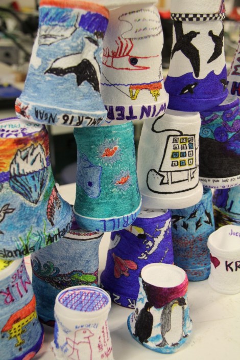 Fortunately, the AMLR folks are resourceful. Beyond fifteen billion kinds of coffee they’ve brought in their personal stashes, there are the usual card games (yes, Cards Against Humanity, but also two decks of Exploding Kittens), and music – the disco ball in aft dry lab has not been underutilized – and art and silly hats. Lots of art, most often executed with the astounding arsenal of multicolored Sharpies that the zoo team keeps at hand. It shows up everywhere: on hands and clothing, on station reports and in the zooplankton and oceanography coloring books (yes, that’s a thing). But nowhere is it more elaborate than on the cups.