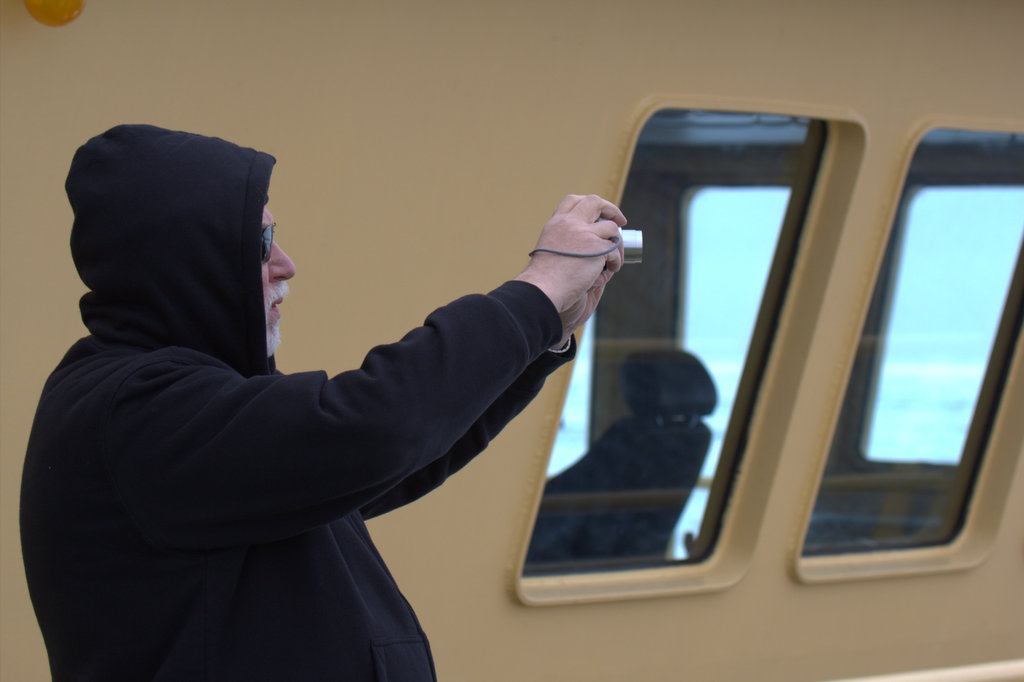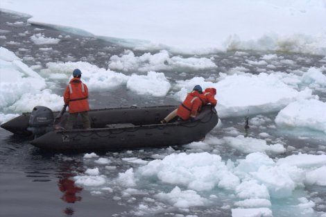 Captain Brandon spots the imperceptible float’s antenna from an ice field a quarter mile off. That’s why he’s captain. Tom, George and Caitlin do the retrieval.