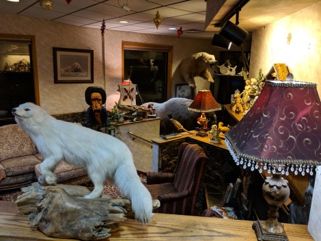We’re clearly out of season here – the drive down from Anchorage was empty save for a half dozen caution-taped cars by roadside, some on their side, some fully upside down. Apparently the road was a bit slick the day before. And downtown Seward was deserted – you could have napped undisturbed on the centerline of what passes for Main Street. Most shops were closed for the winter, and those with lights on seemed wistful at best. The Hotel Seward, as quirky as any I’ve seen, did its best to make us feel comfortable.