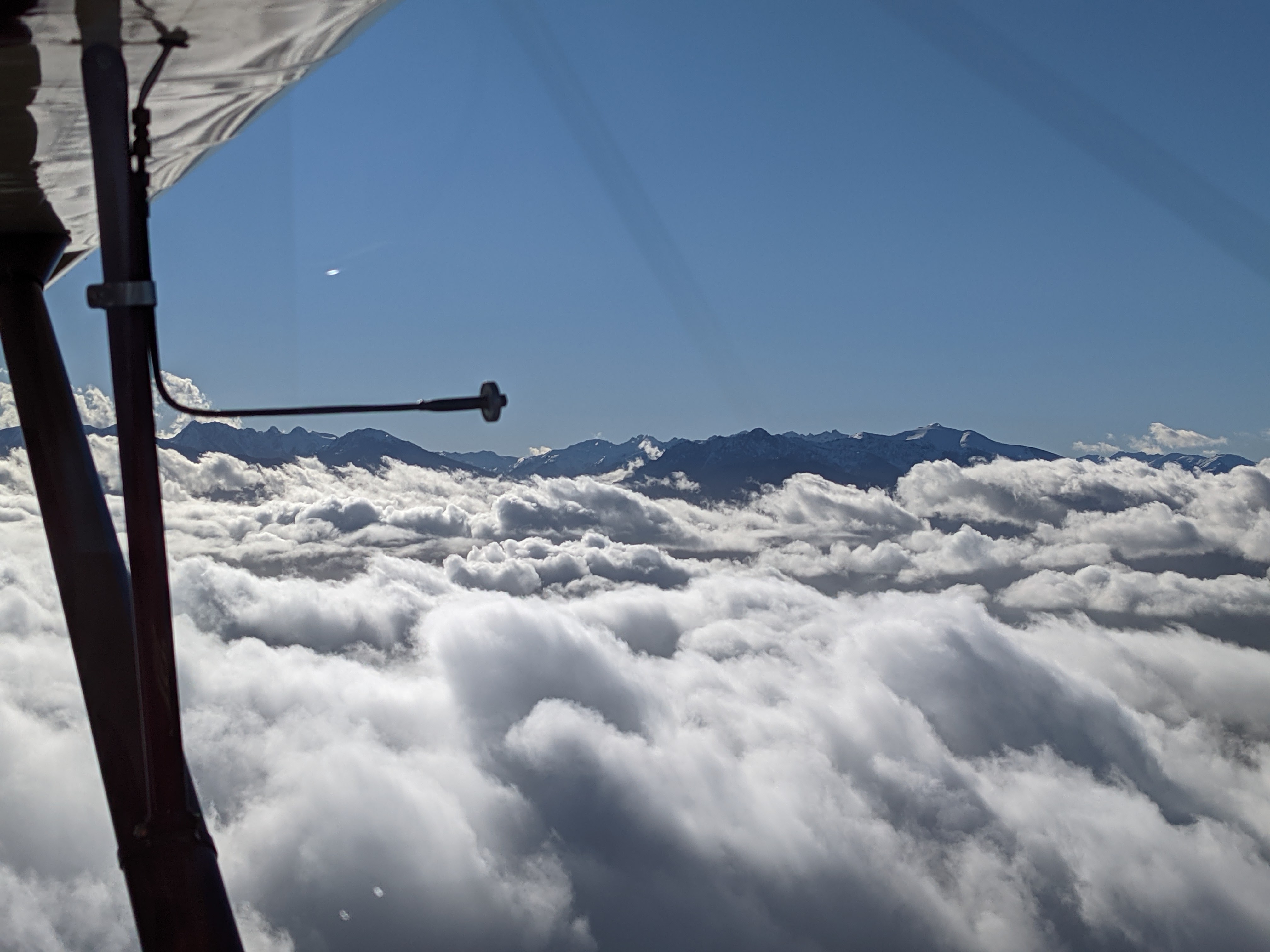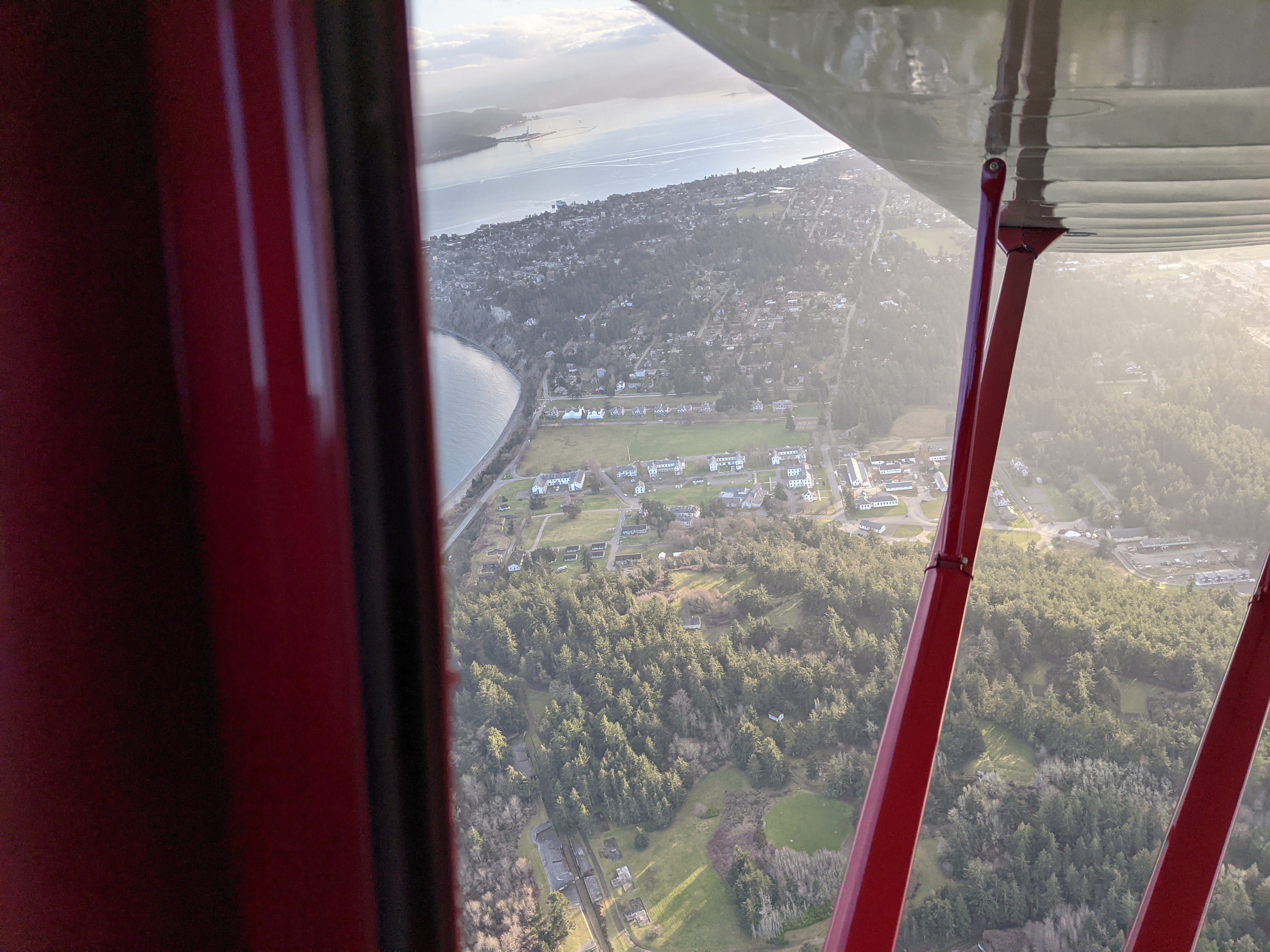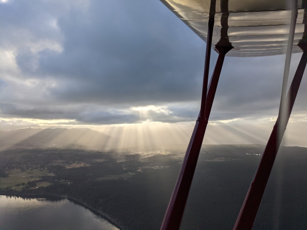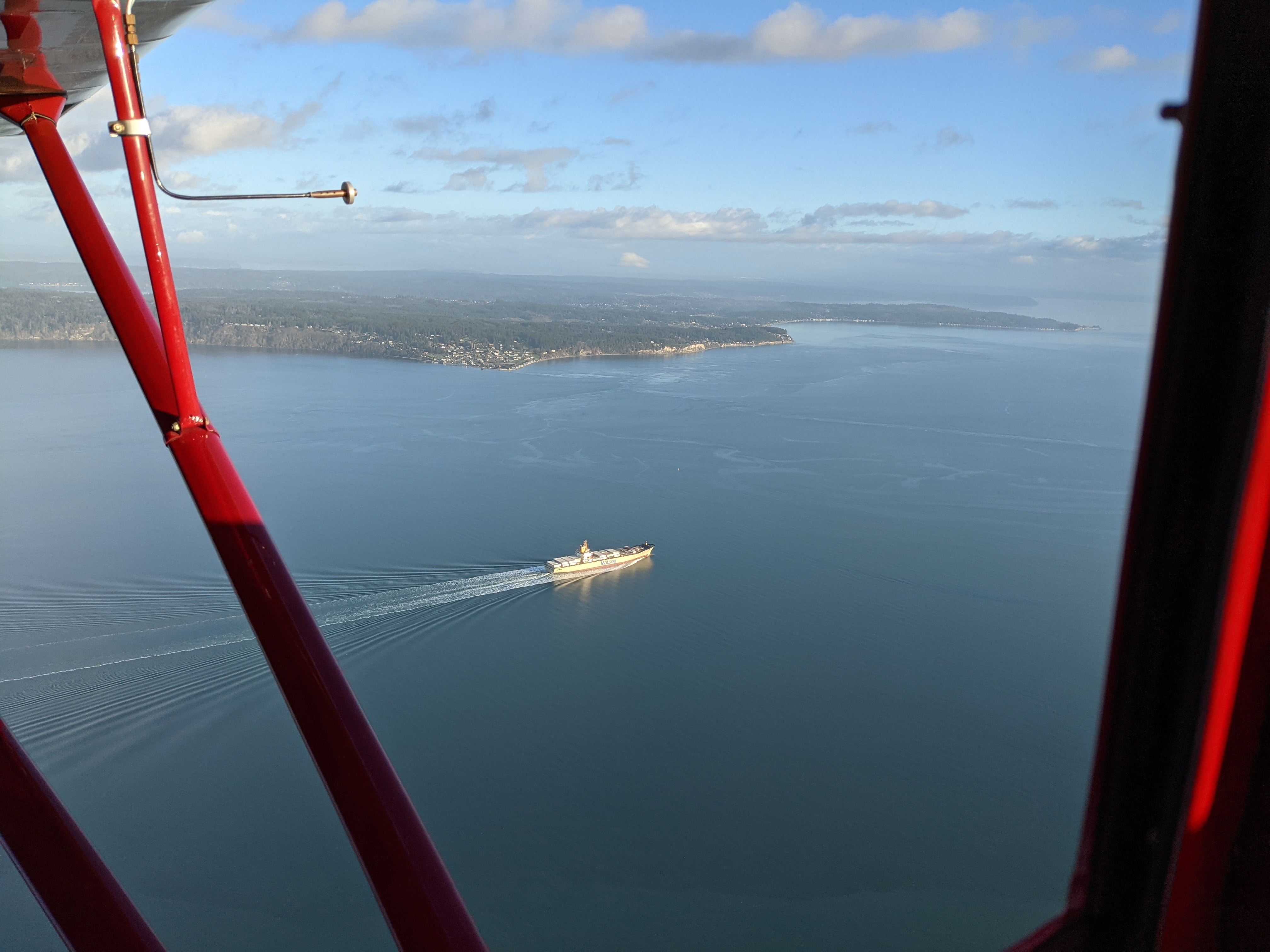 But I digress. Again. Short story, NC33395 and I got to take to the skies for the first time in a couple of months to celebrate the 75th anniversary of her first frigid flight. Felt good, of course. Brisk clear air over a scattered marine layer, mountains shining out in all their winter glory. Put her through the paces: steep turns, lazy eights, chandelles. Cruised west over Clallam County farmland, back east over the coast to the Admiralty Inlet, chased inbound freighters and traced island shorelines. We weren’t going anywhere in particular, just stretching our legs.