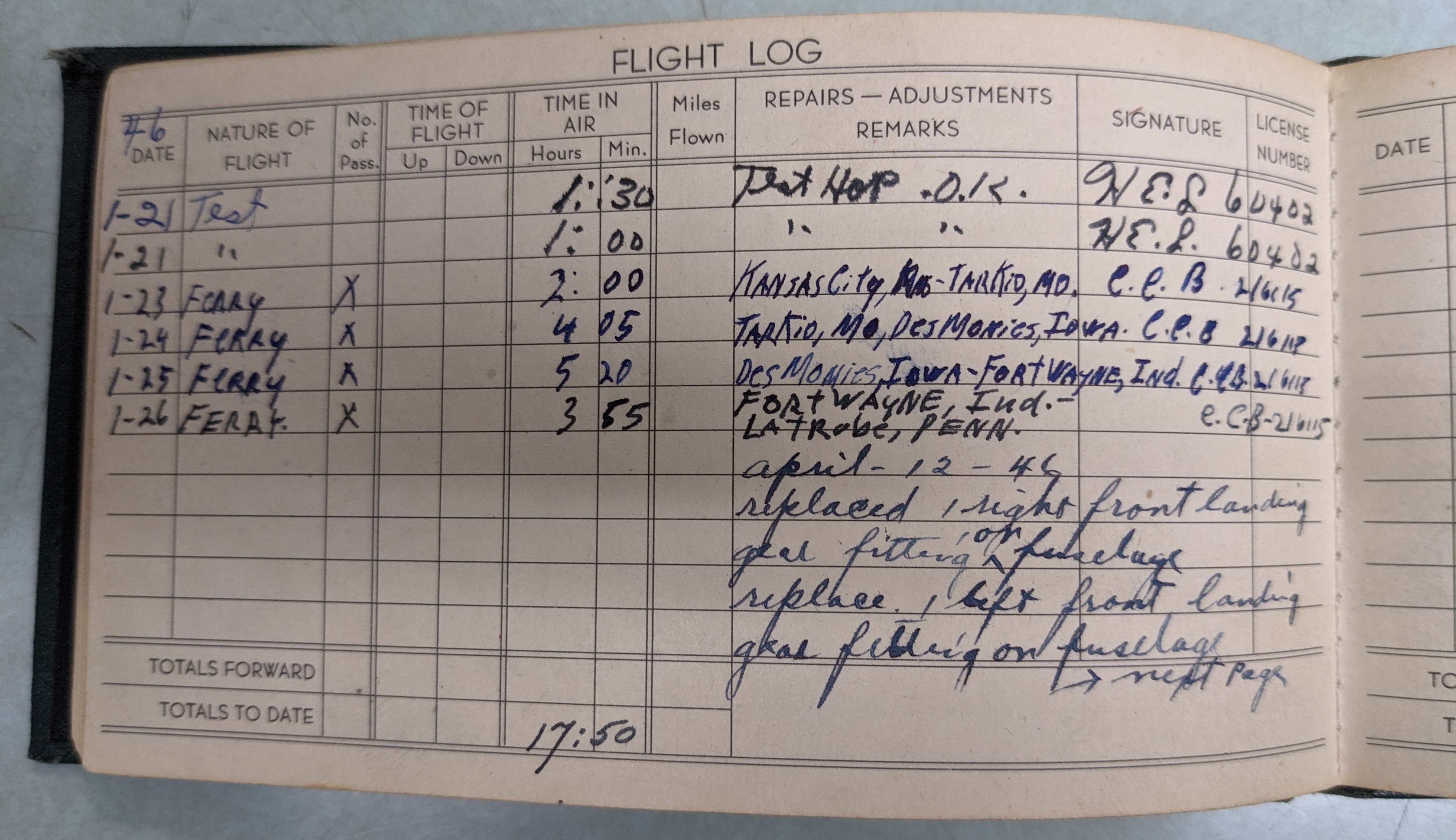 Jack had to wait a little longer, however, as the record of ferry flights (Kansas City – Tarkio, MO – Des Moines – Fort Wayne – Latrobe) stops in western Pennsylvania on Jan 26th. The next entry, on April 12th, records a return to flight after “replacement of left and right front landing gear, cowling, propellor, leading edge and outboard ribs of left wing,” along with other miscellaneous parts. The delivery pilot (mercifully remembered only by initials C.C.B and license #216115) clearly botched the landing in Latrobe with what we tailwheel pilots know as a “ground loop“.