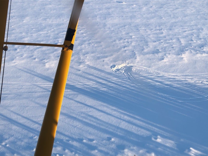 Come in flat, like a glassy water approach in a floatplane, aim for the tracks you’ve packed, let it settle, keep the tail up, up, bring the power back. No, really, bring the power back (I was having just a touch of sensory overload, and had kind of frozen up on the throttle until Chris jiggled it). Then tail comes down, crunch crunch crunch, and you’re stopped. Shut down the engine. Shut down the engine? Yeah, shut down the engine. Climb out. Climb out? Sure, climb out.