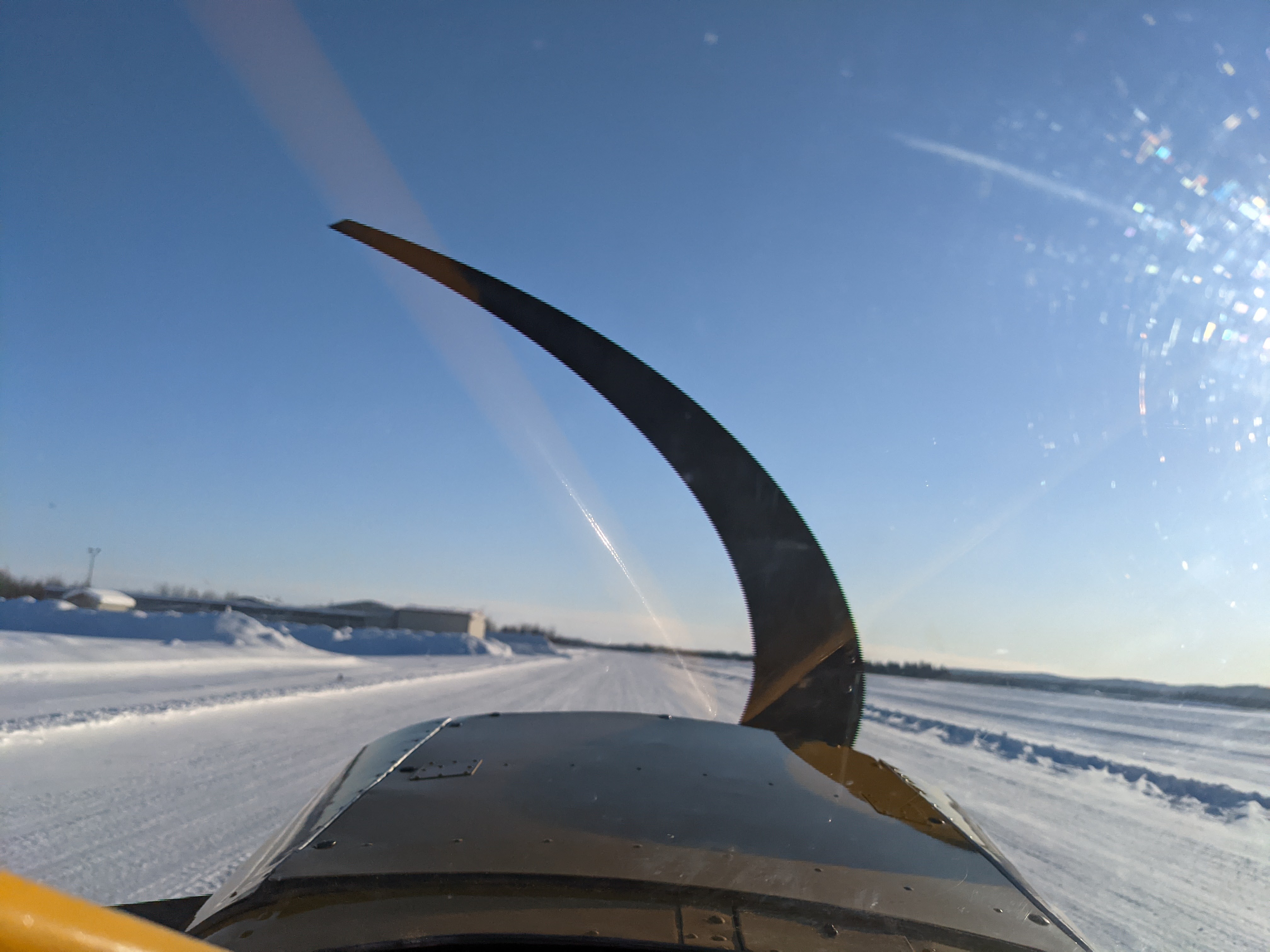 Taxiing out was a bit of a new exercise for me as in a ski plane on hardpack snow/ice, you have pathetically little steering and exactly zero brakes. You can only turn by adding enough power to get airflow over the rudder, but of course, that same airflow starts you moving forward in a hurry, and remember what I said about no brakes? I still found myself pressing down as hard as I could on the (disconnected) brake pedals all the way out to Charlie; Chris says that’s normal when you’re transitioning to skis.