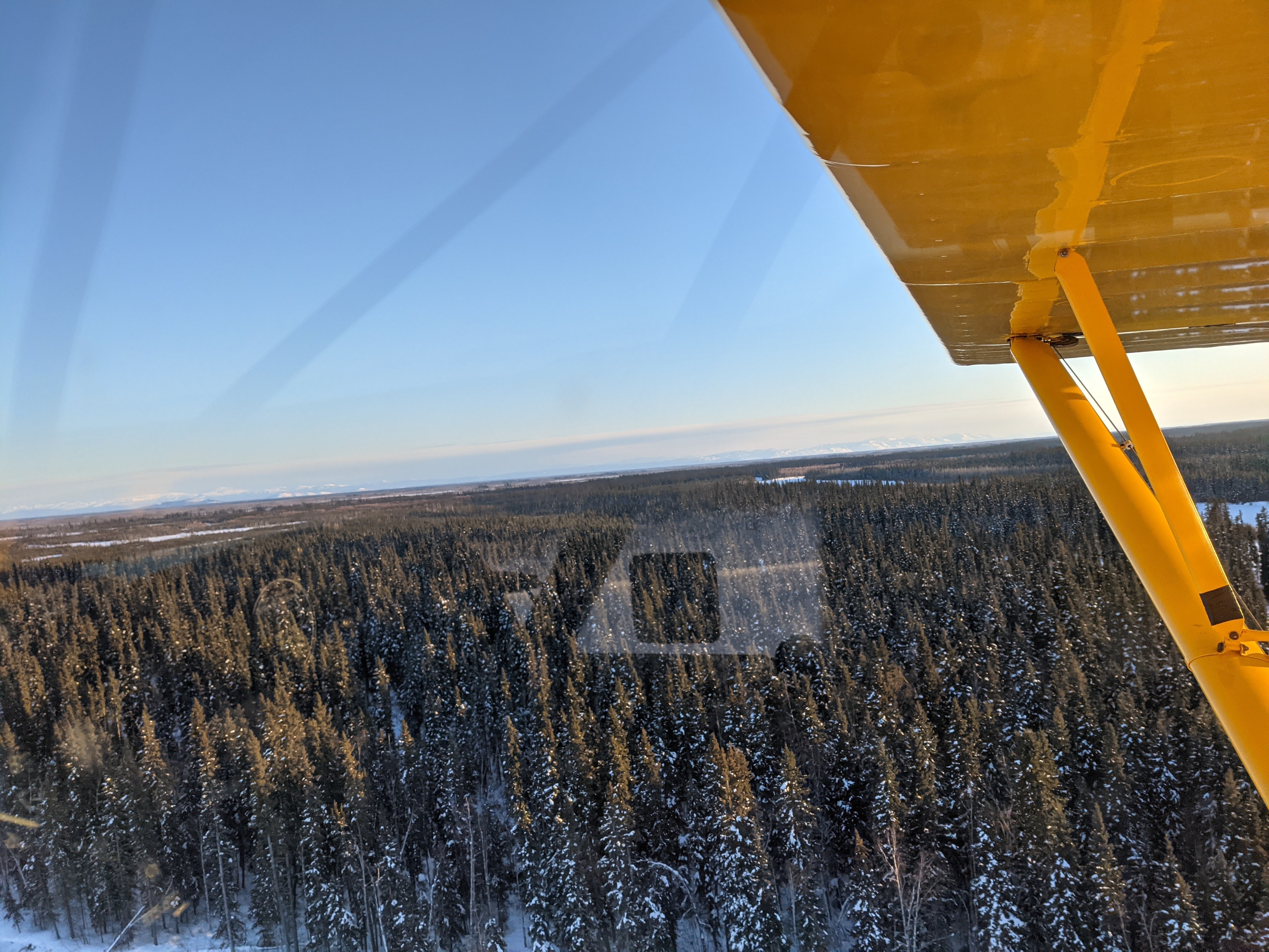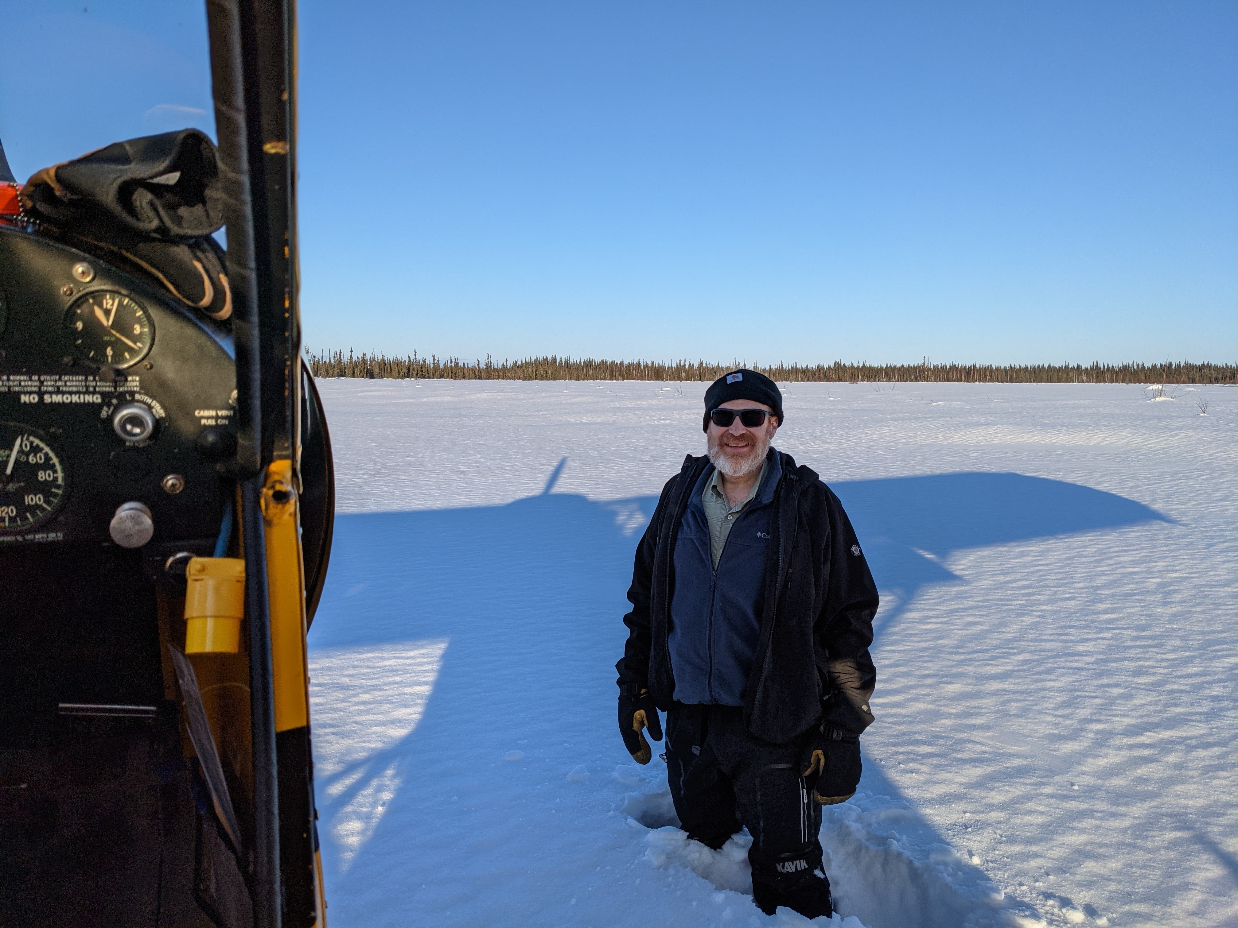 Short story is that when Chris promised me the full skiplane experience, he meant it, so when we got wedged in a spot that had drifted deceptively, we got to shut down, dig the plane out with the shovel and snowshoes tucked in the belly, then turn it around around by hand and do some fancy footwork to power turn back into more even ground. Er, snow. We were both thoroughly covered in snow, laughing heartily at the little adventure by the time we both climbed back in and strapped in for our return, winding our way, this time upriver, low and not-so-slowly.