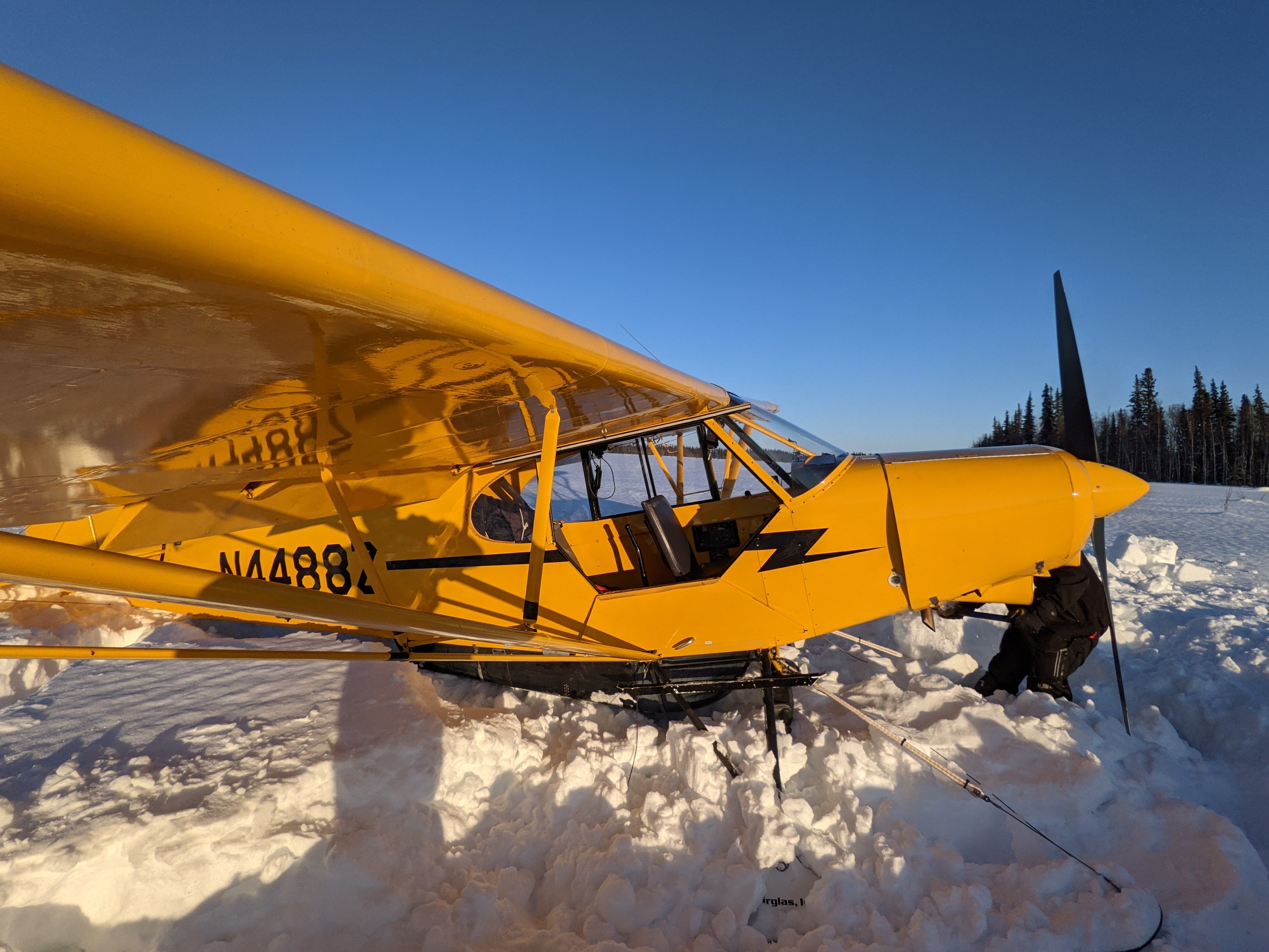 We had to start out late because on weekdays, Chris has a day job. So we met at ProFlite around 5:30, pulled the covers off and preflighted the plane. Chris has all sorts of goodies on this Cub – big belly pod for gear, big prop for climb, big gear so as to not dig the big prop into the (bigger) ground. Skis that could float a plane twice its size.
