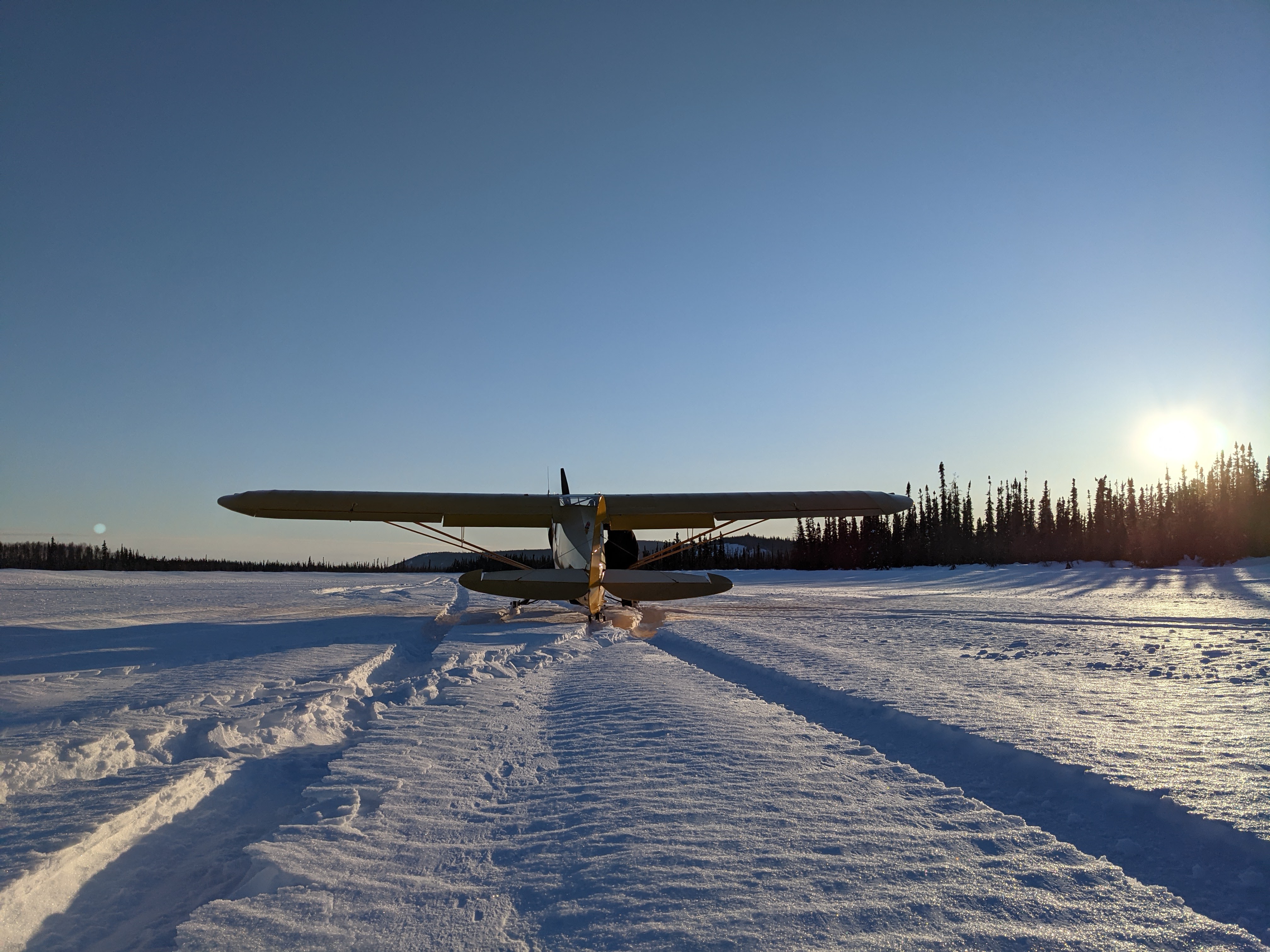 On the third pass, he had me do a light tap and go, putting tracks down for maybe only 20 feet, not even letting the full weight of the plane settle on the snow. Did it hold? (this would be good) Did the tracks fill with water? (this would not be good). Another drag, this time putting the skis down for as long as we had on the runway, packing down a strip. Then another from the other direction, trying to hit the same two stripes, packing ourselves a runway. Only then would we come in for a final approach.