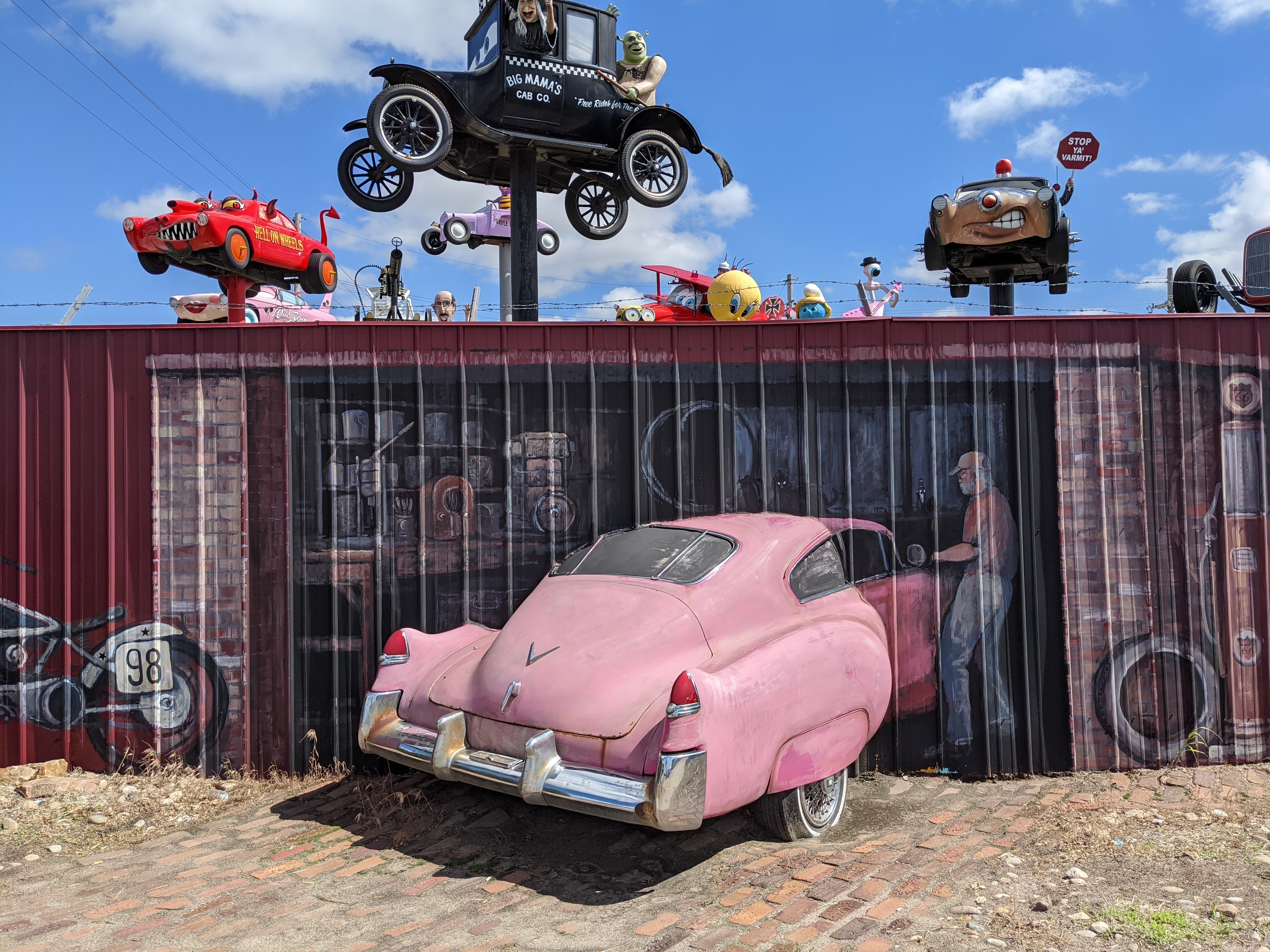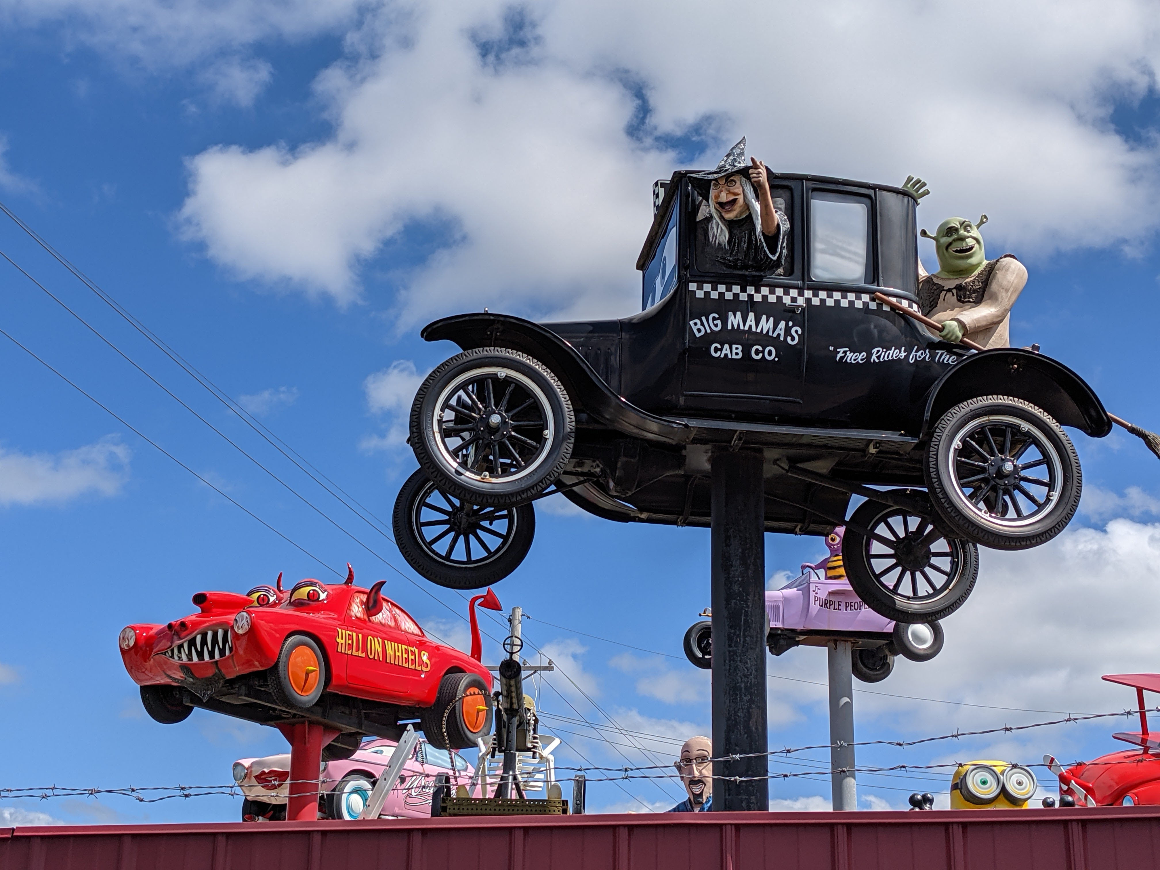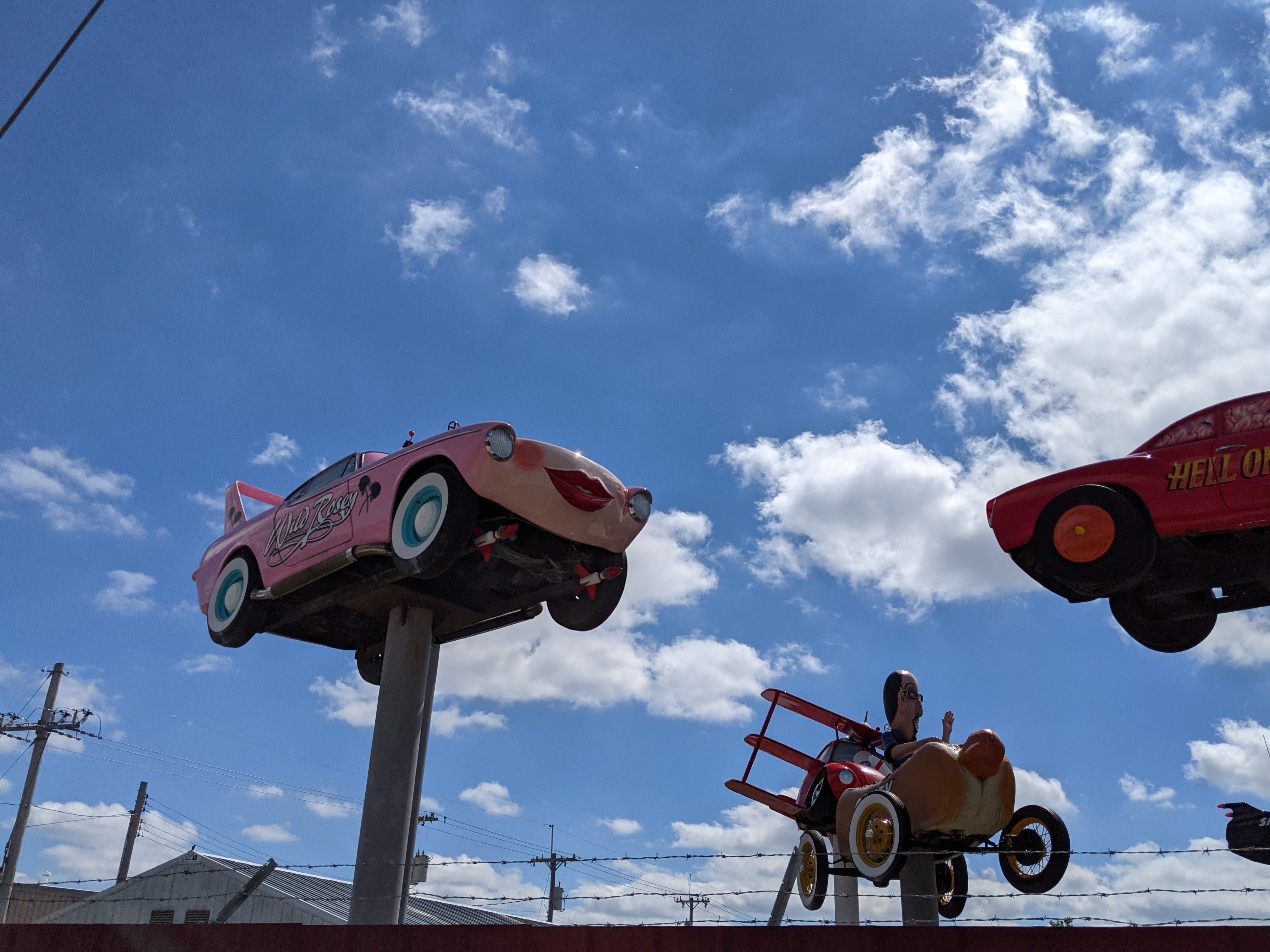 It was sounding like I’d get to spend my spare hours here typing away, but I was not five minutes from the airport when I passed the first cartoon car up on a pole in front of the Grand Island Humane Society. Two minutes later, I passed a whole passel of them surrounded by a fence declaring them “Fred’s Flying Circus.”