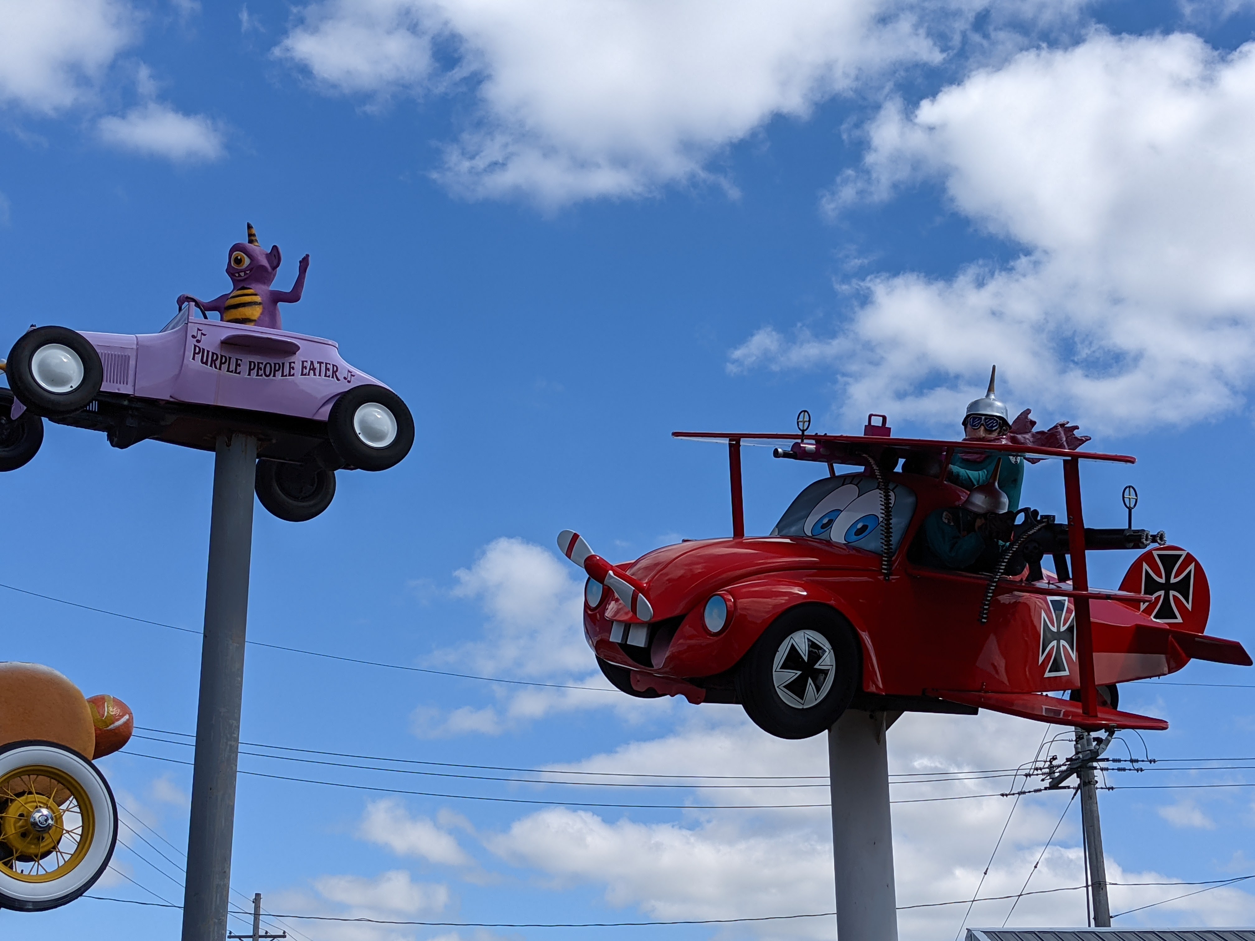Apparently cars-on-a-stick are sort of like potato chips (or heroin): once you get started, it’s hard to stop. Schritt next got the idea of converting an old Volkswagen into the Red Baron and put it on a post as well. Snoopy followed, on the building’s roof, well positioned to return fire. And then another and another. So now there’s also a purple people eater, and a Coney Island hot dog car and…well, a lot of them just defy concise description.