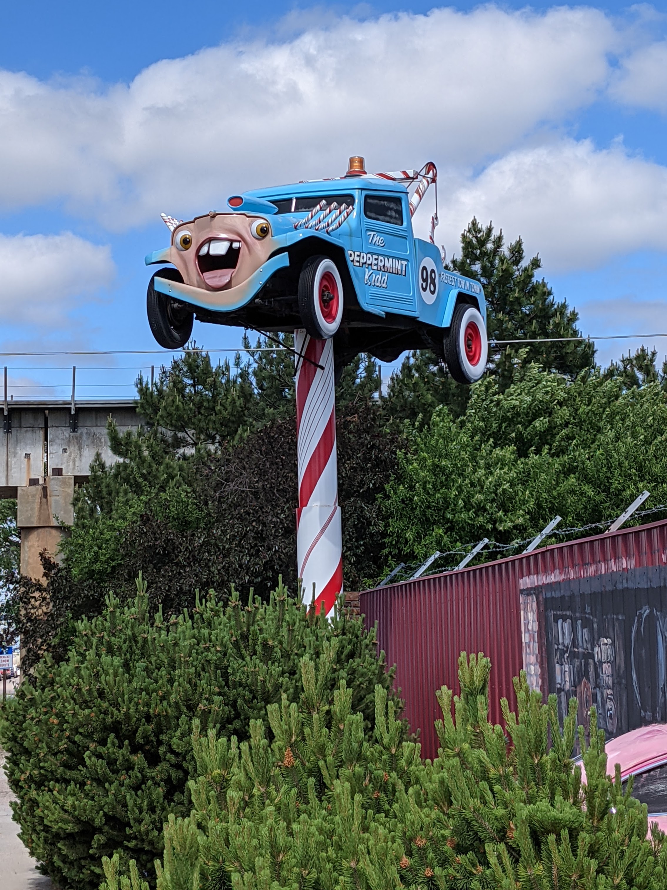 His grandfather was named Fred Schritt, the young man told me. After retiring from building custom bikes, the elder Schritt was apparently itching for a creative outlet. When he came across a tow truck that reminded him of vehicles from the movie Cars, he decided to make that vision manifest. He called the result “the Peppermint kid,” and, lacking anything better to do with it, stuck it on a post outside the garage once he was done.