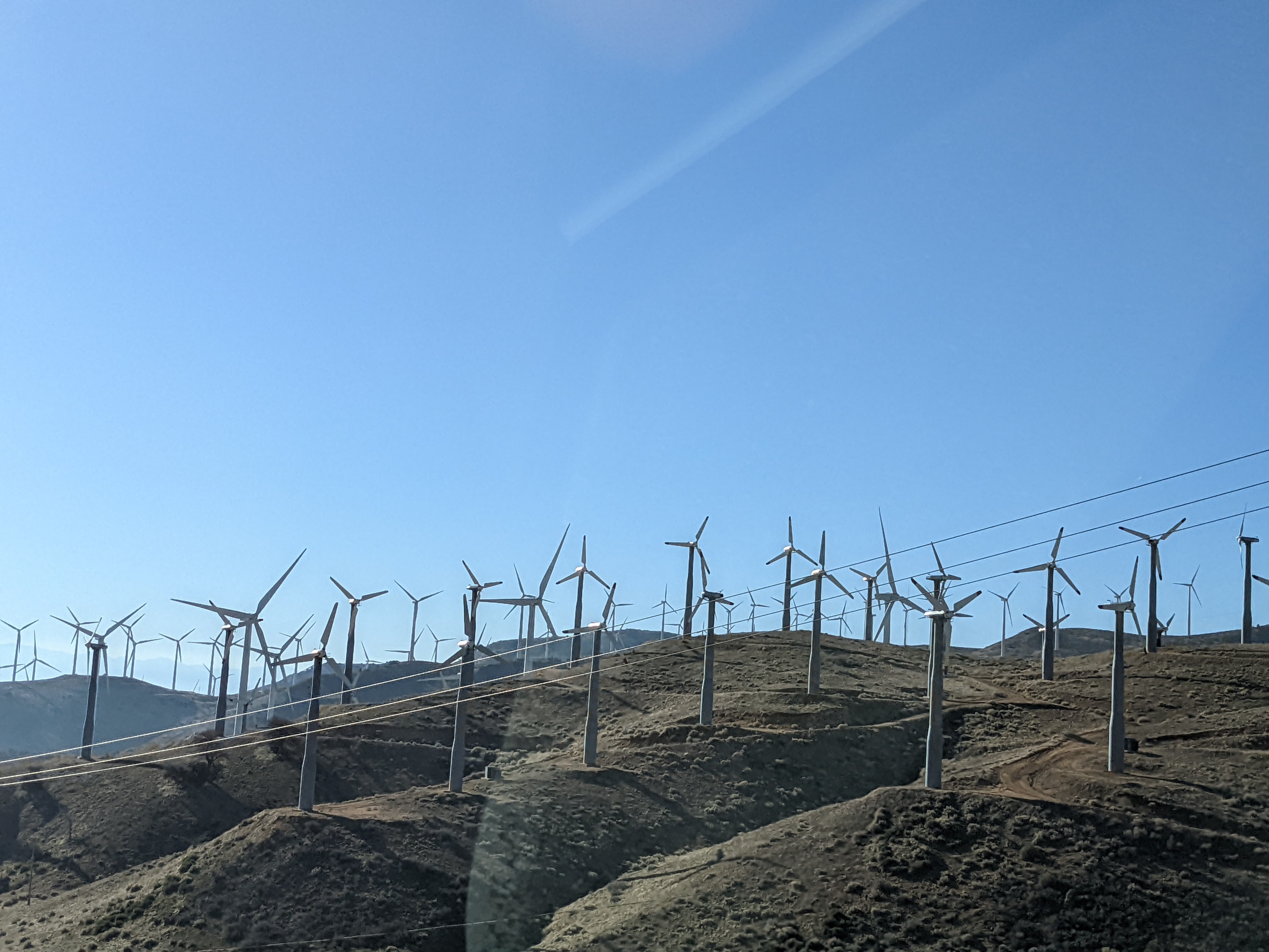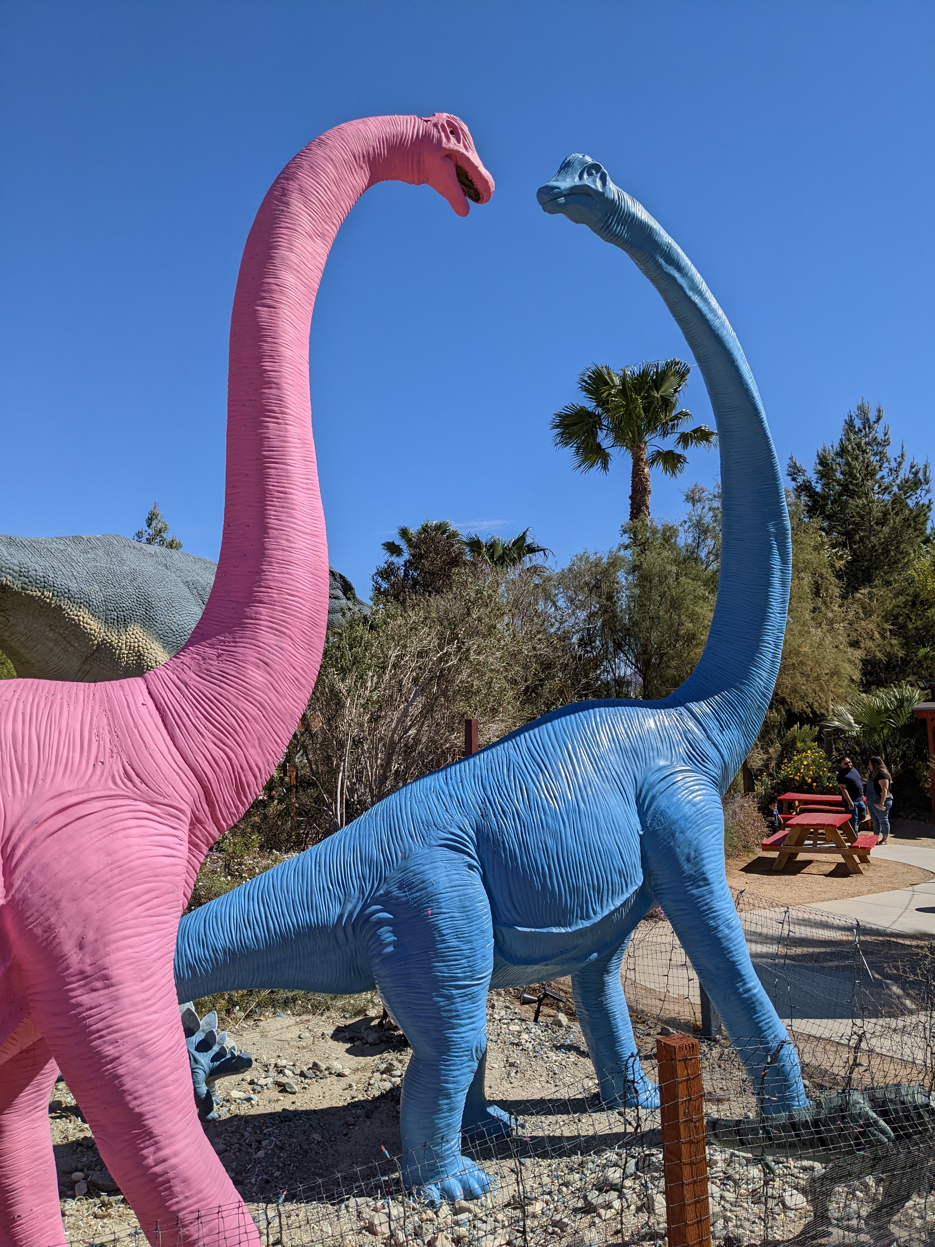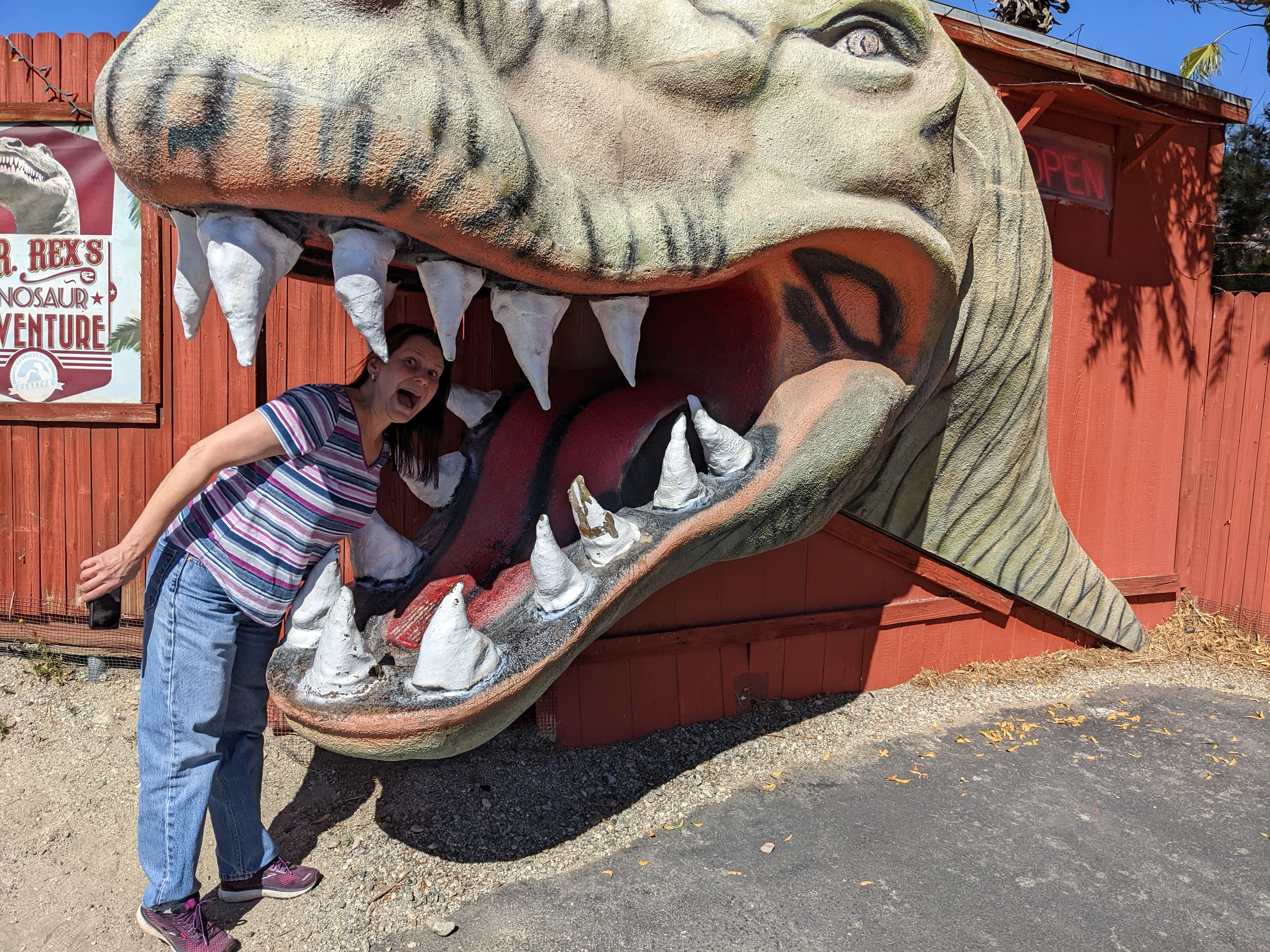 We camped last night in the driveway of one of my best buddies from the South Pole, the indefatigable and intrepid Linda McDermott (see the Pablo and Linda’s South Pole Water Experiments, scientifically answering the question, “If you pee off the deck at the South Pole, does it freeze before it hits the ground?”). We got to see the famed Tehachapi Railway Loop (sorry, pilots, not that kind of loop – it goes around a horizontal circle to handle the steep grade). Bypassed the Last Woolworth’s Counter Diner (closed, temporarily), and drove through miles and miles of wind turbines. Put our money down at the self-proclaimed “Greatest Gift Shop Ever” in Little Rock, also claiming to have the hottest beef jerky in the world. Roamed the desert with fiberglass dinosaurs (a sign kindly requests, “Maximum one minute in the T. Rex’s mouth when other guests are waiting.”)