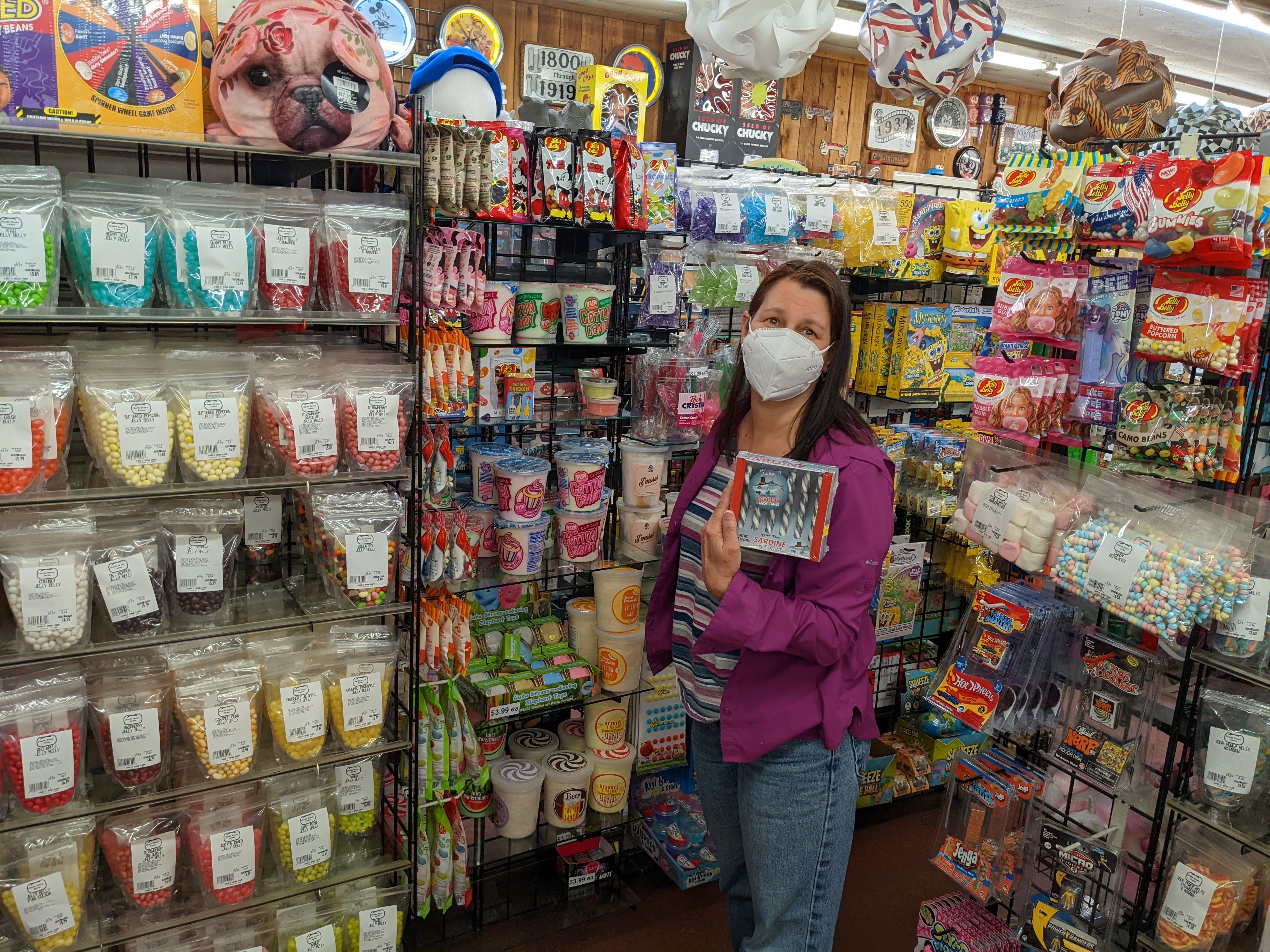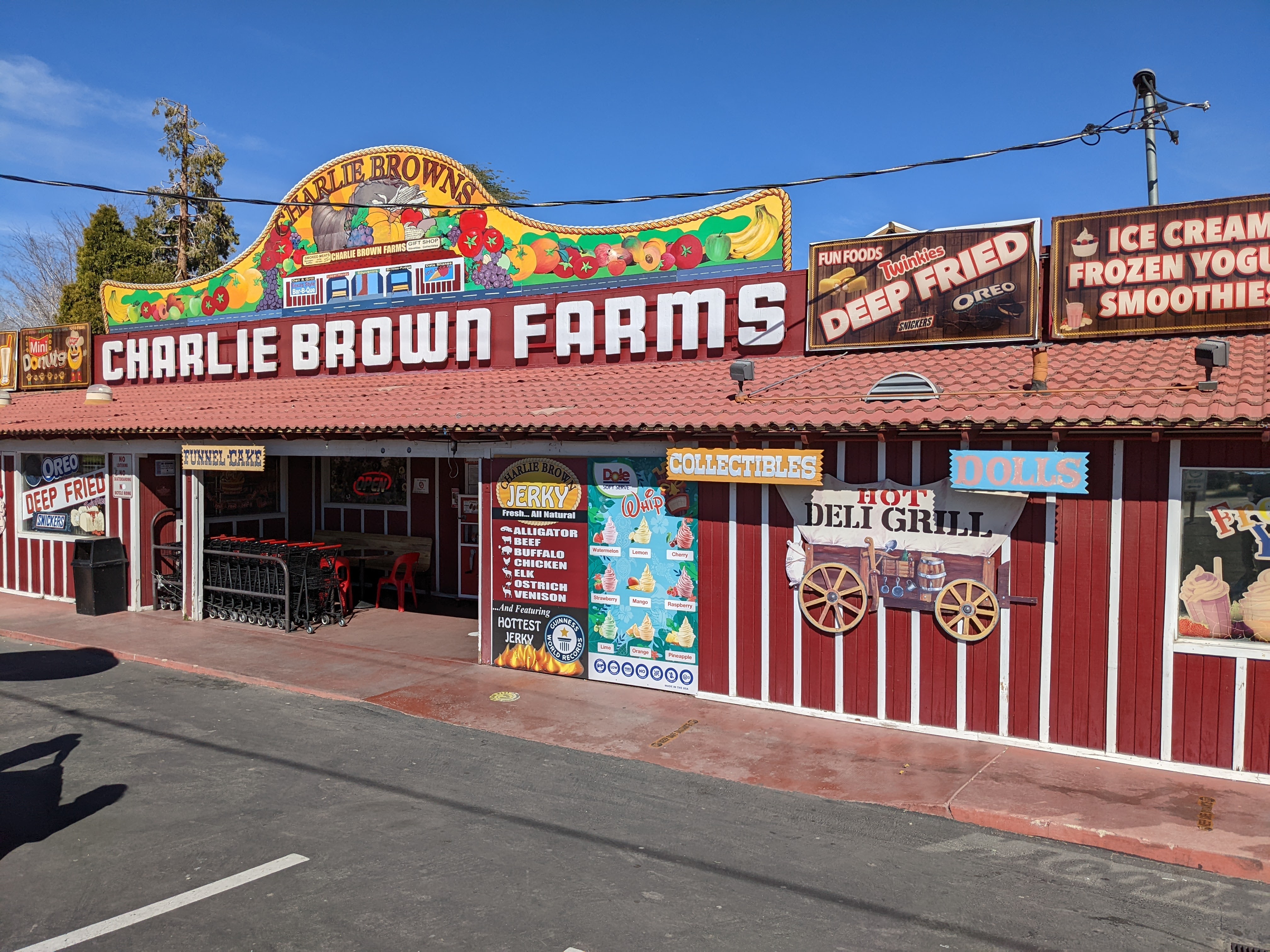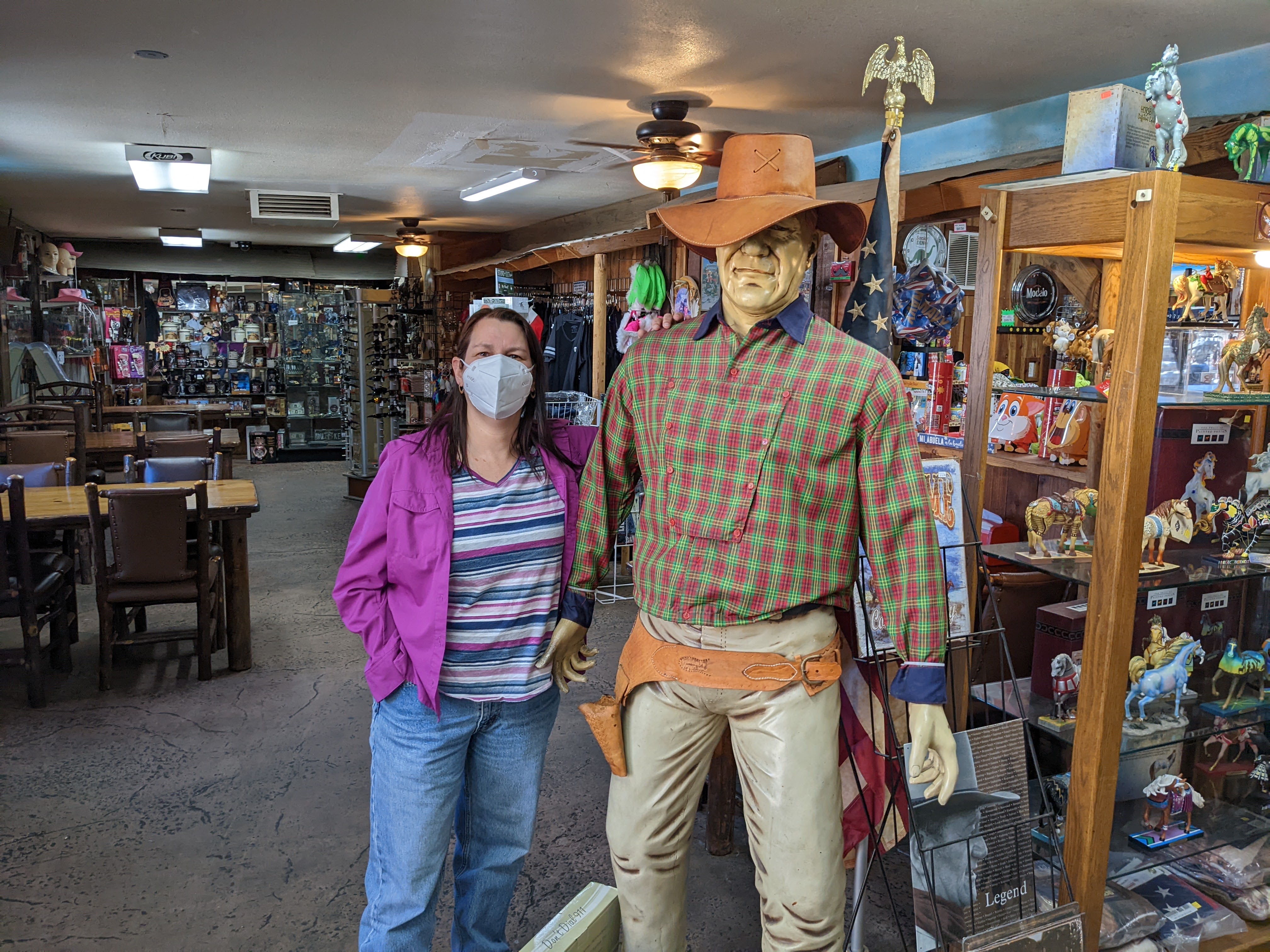 We camped last night in the driveway of one of my best buddies from the South Pole, the indefatigable and intrepid Linda McDermott (see the Pablo and Linda’s South Pole Water Experiments, scientifically answering the question, “If you pee off the deck at the South Pole, does it freeze before it hits the ground?”). We got to see the famed Tehachapi Railway Loop (sorry, pilots, not that kind of loop – it goes around a horizontal circle to handle the steep grade). Bypassed the Last Woolworth’s Counter Diner (closed, temporarily), and drove through miles and miles of wind turbines. Put our money down at the self-proclaimed “Greatest Gift Shop Ever” in Little Rock, also claiming to have the hottest beef jerky in the world. Roamed the desert with fiberglass dinosaurs (a sign kindly requests, “Maximum one minute in the T. Rex’s mouth when other guests are waiting.”)