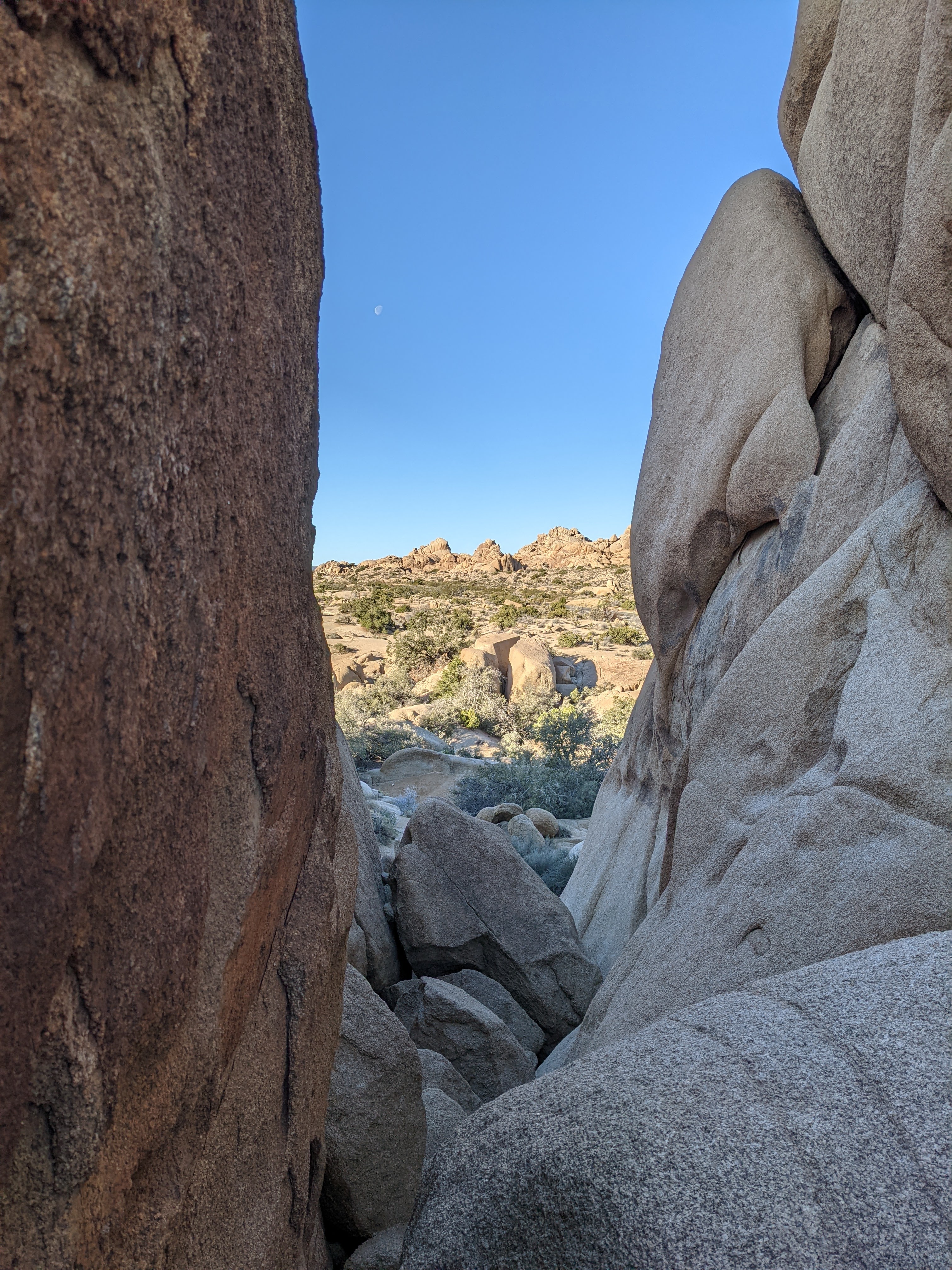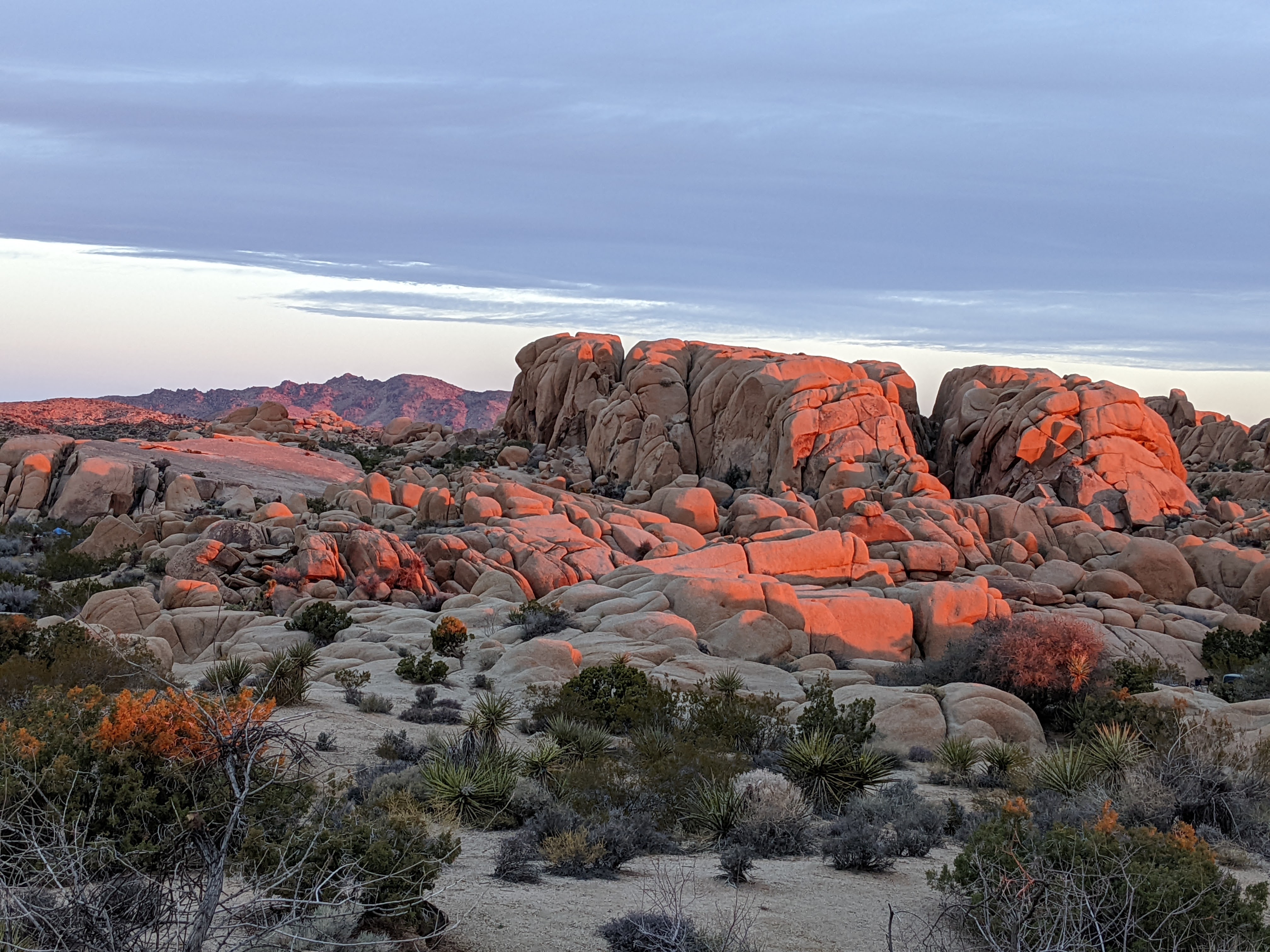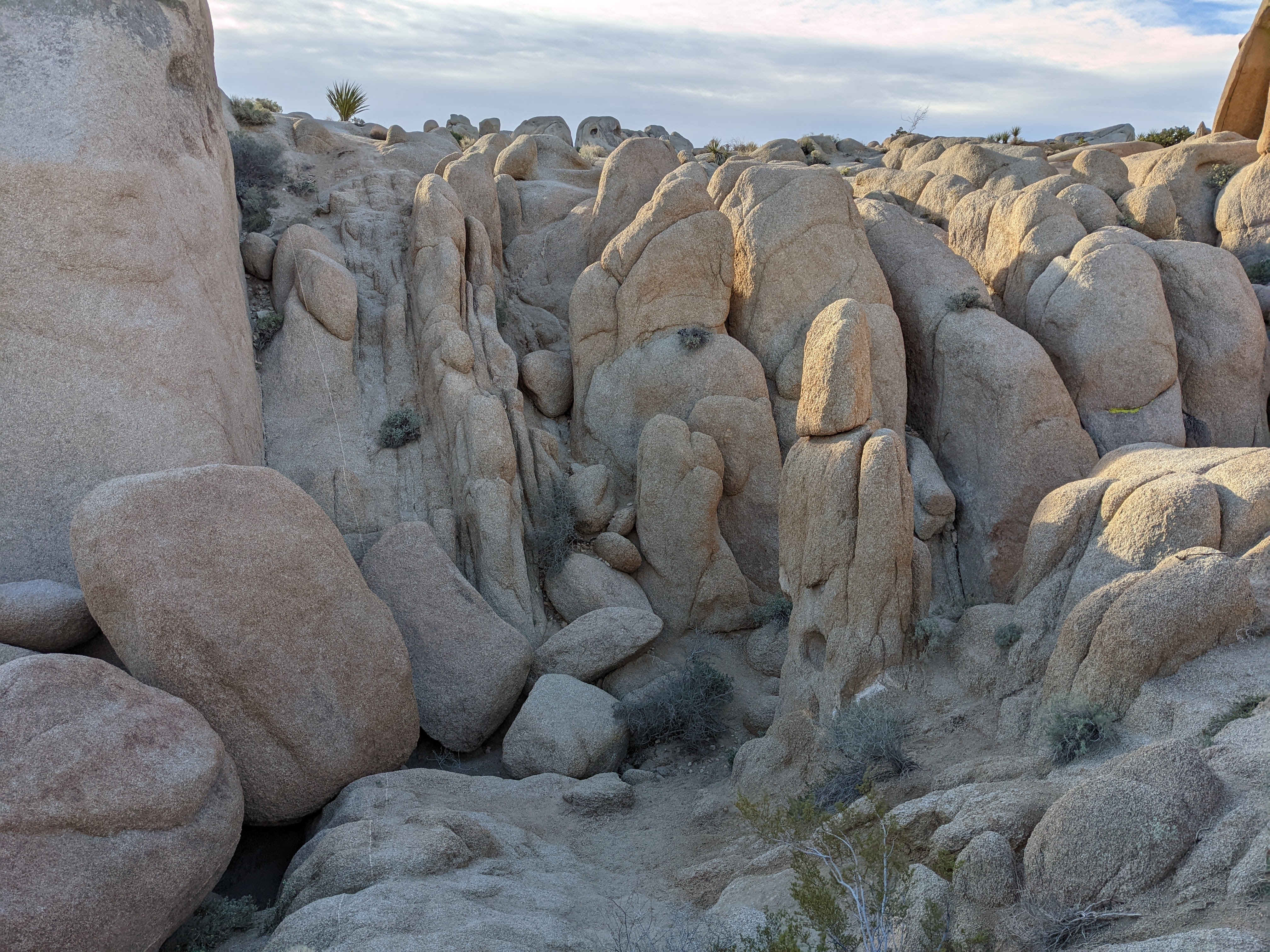 Woke to dawn stillness and a sunrise so red and purple you could be forgiven for worrying that you were alongside some sort of nuclear test facility. Ate a quick breakfast and strolled over to the neighborhood of Skull Rock, the appeal of which isn’t so much that there’s a rock there that looks vaguely like it could be an enormous sculpture of Homer Simpson’s skull, but that there is an unending labyrinth of piles of rocks that look like cyclops, dragons, ghosts, ancient sentries and otherworldly monsters. +1, but bring your scrambling shoes, and knees that are younger than 59 years.