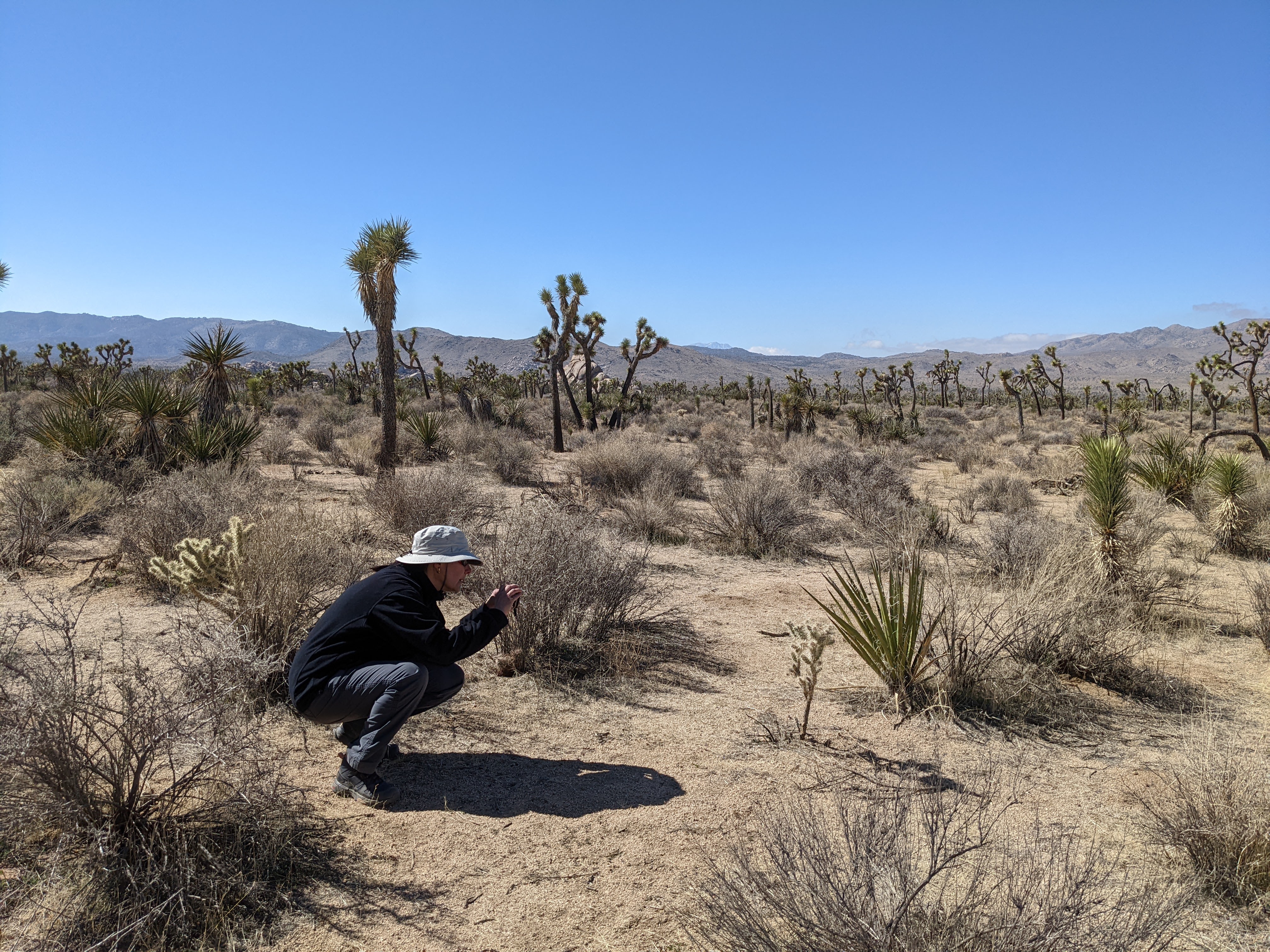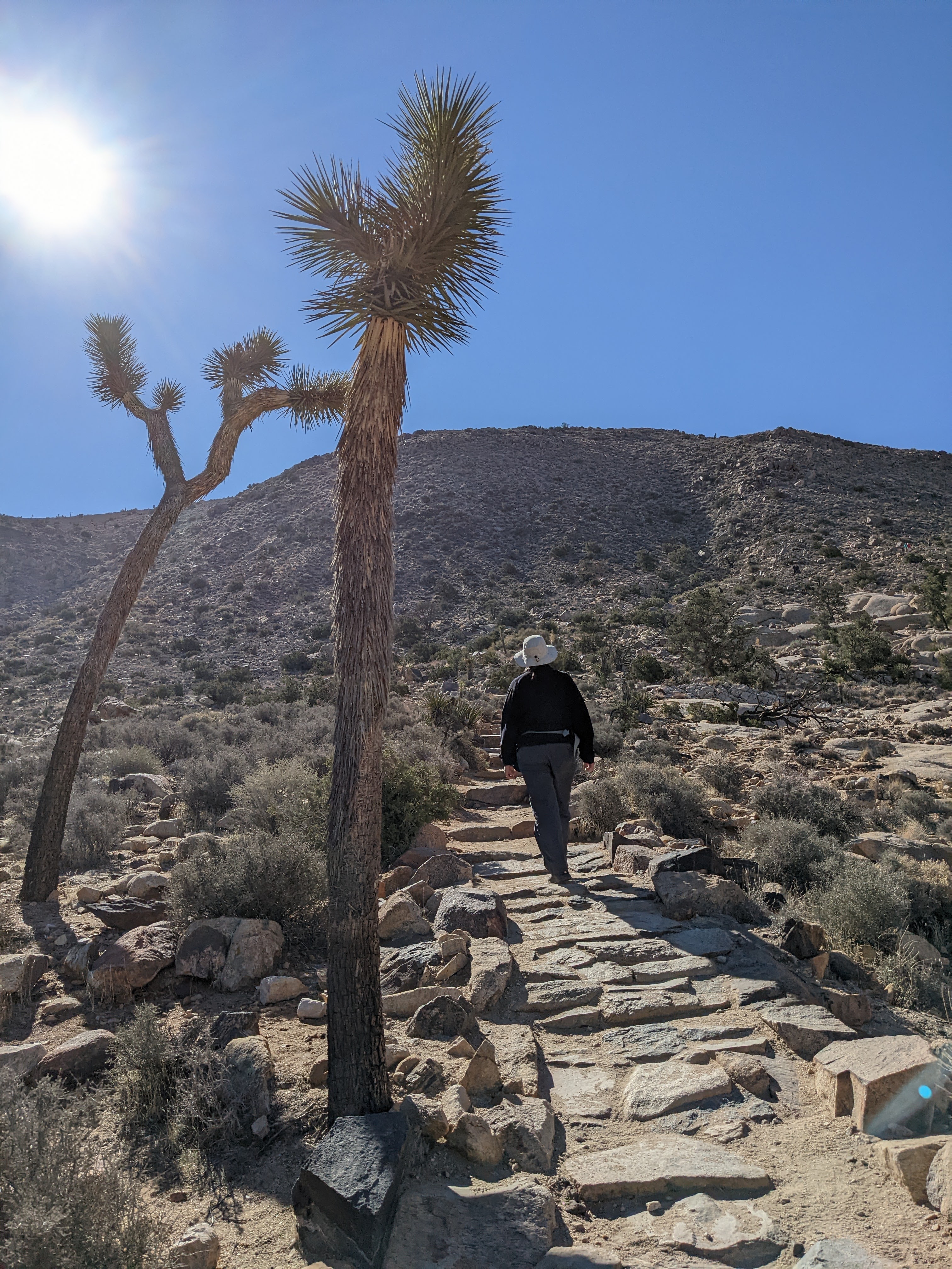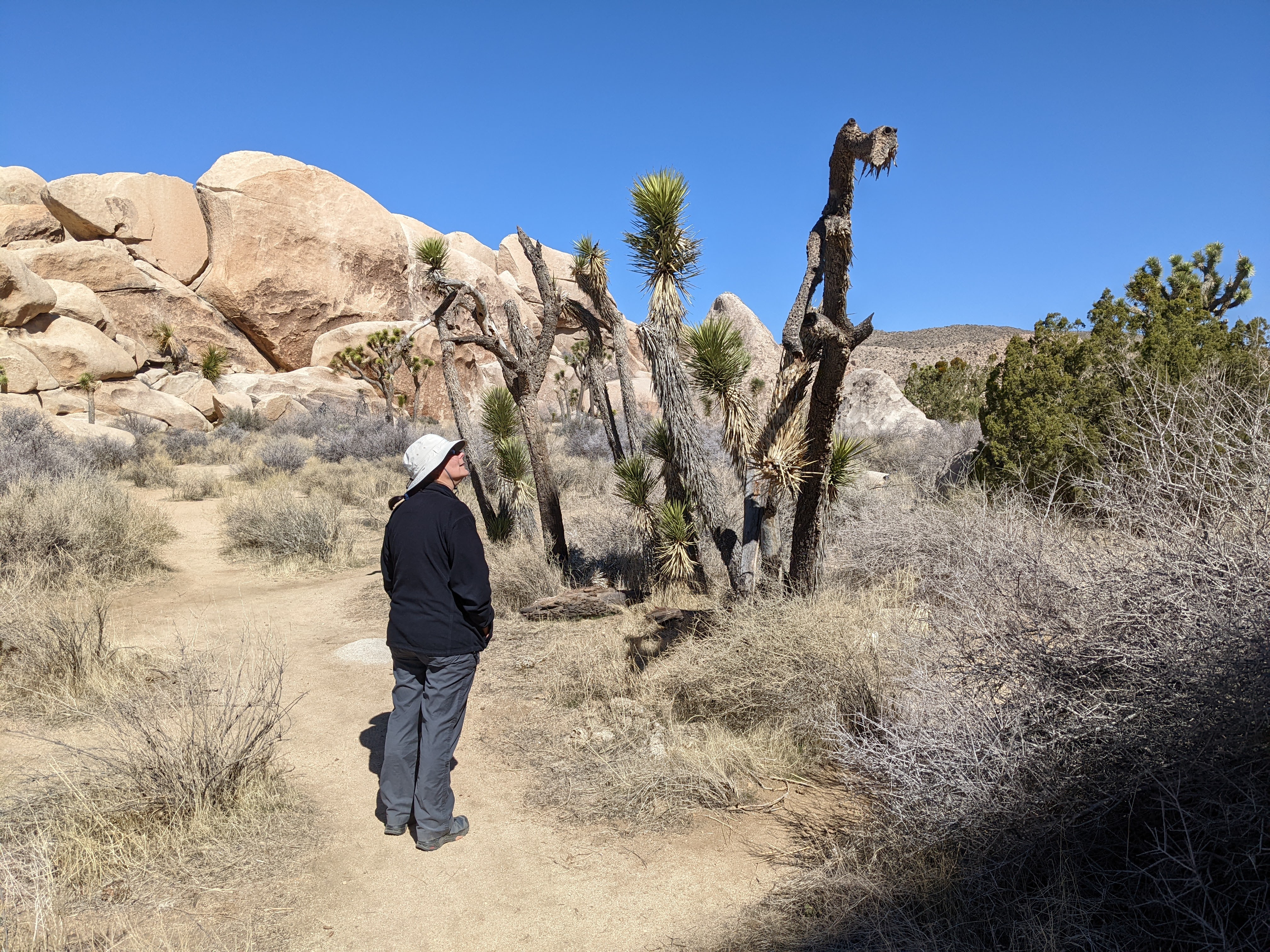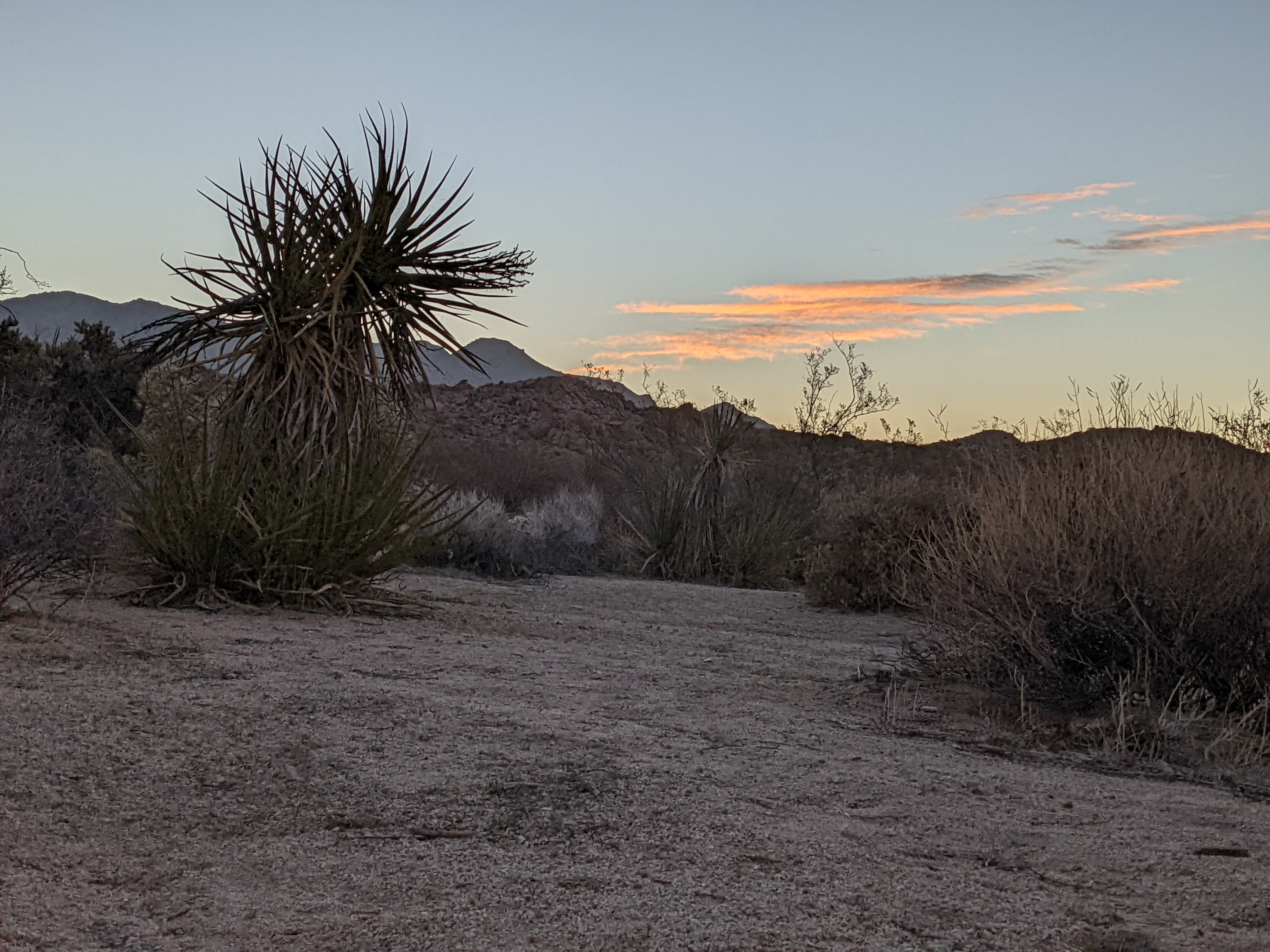 Snuck in a quick morning walk trying to find the Mastodon Peak trail and gave up, but managed to trace a wash to the eponymous cottonwoods. And by then? Well, we found ourselves feeling ready to roll on downhill to what awaits us next. I expect we’ll be back to see more of JT, now that we know what to expect, but there’s so much unexpected still lying ahead…