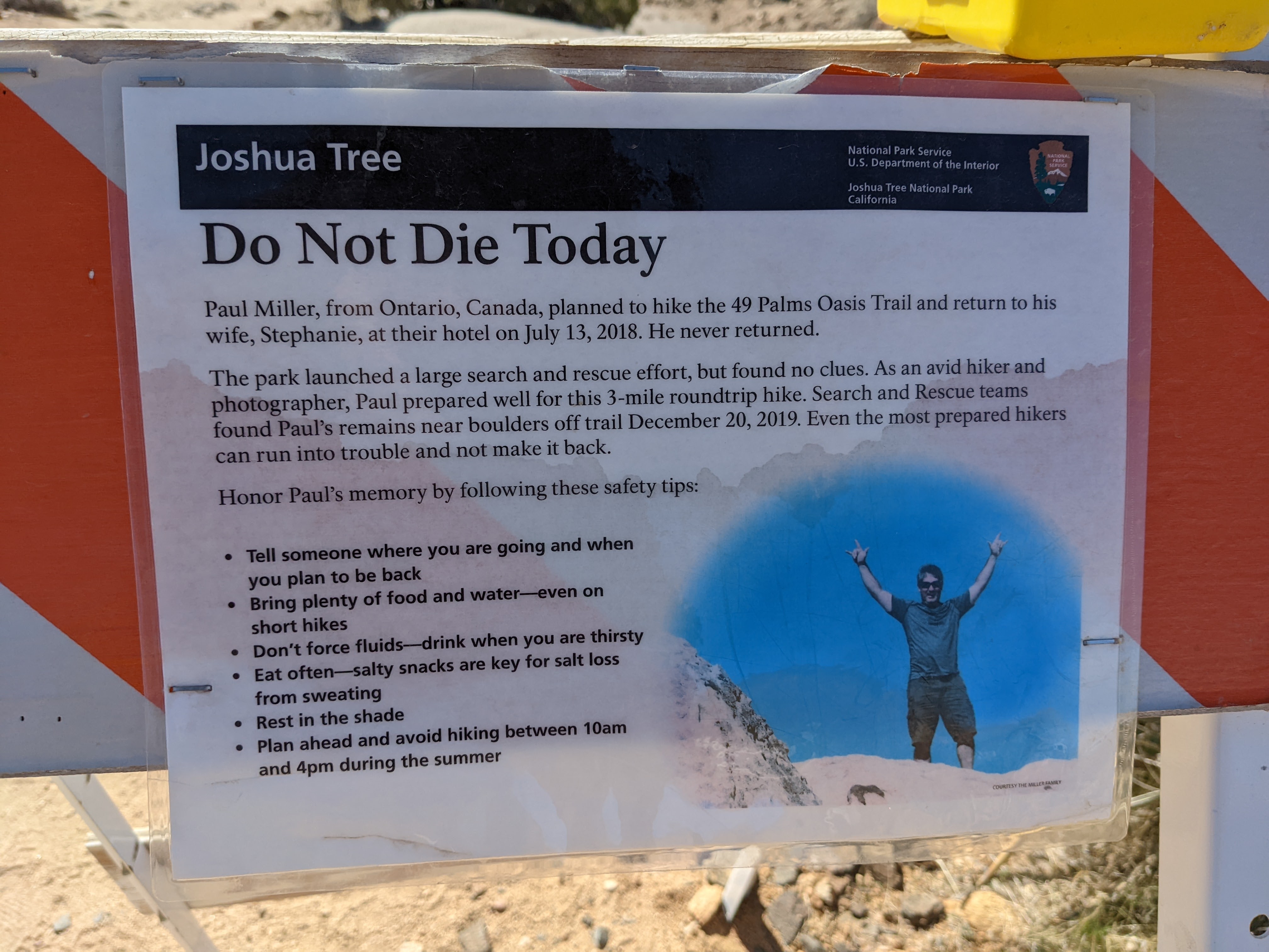 Speaking of 59 year old knees, Devon and I next made an attempt at Ryan Mountain. Not far – something like four miles roundtrip, but set up in the eastern style of trailbreaking: point the trail at the summit of the mountain and go in as straight a line as you can. We got about halfway up before thinking better of spending two miles on a windblown Stairmaster, and retreated to the less threatening “Hall of Horrors.”