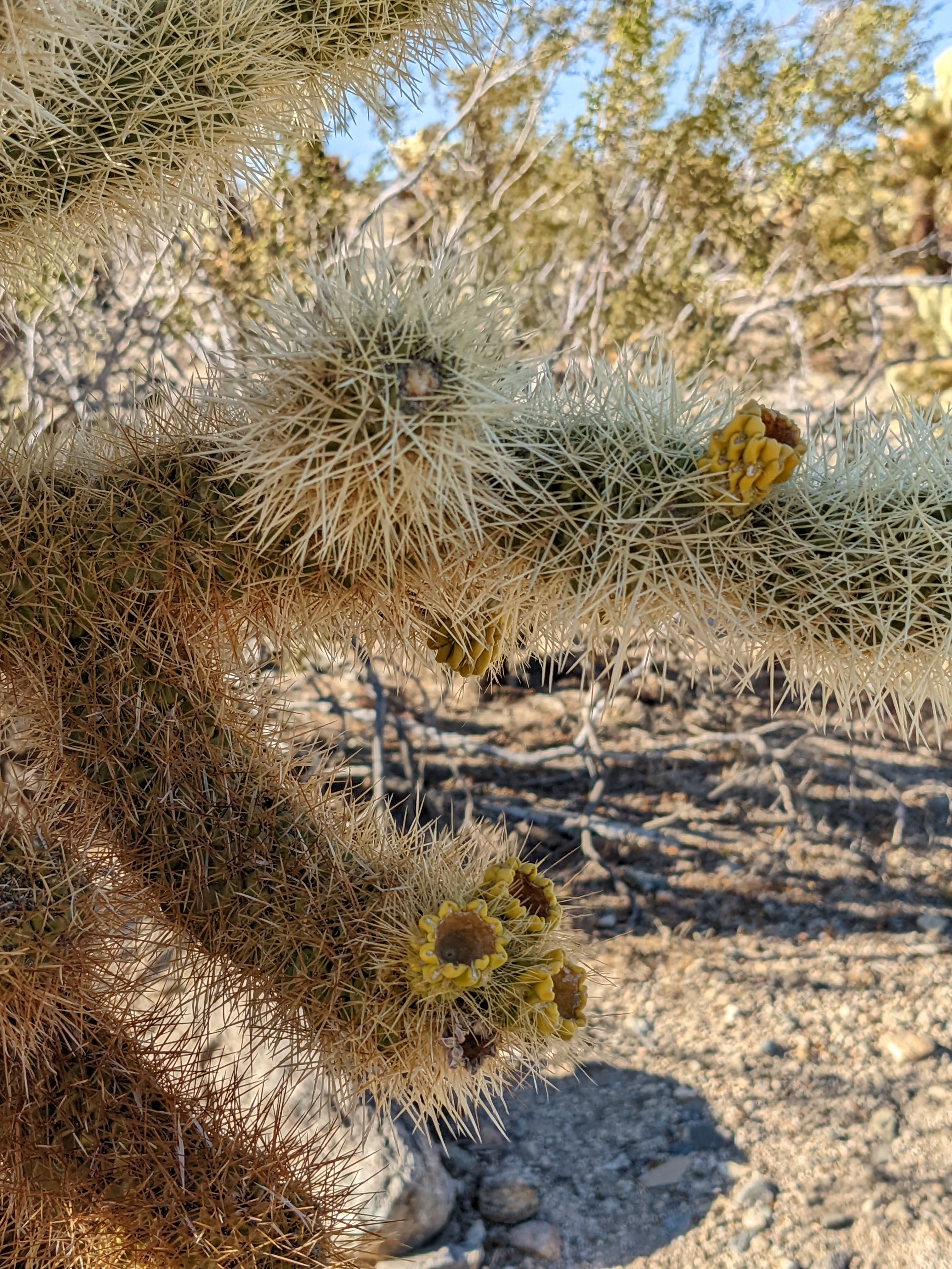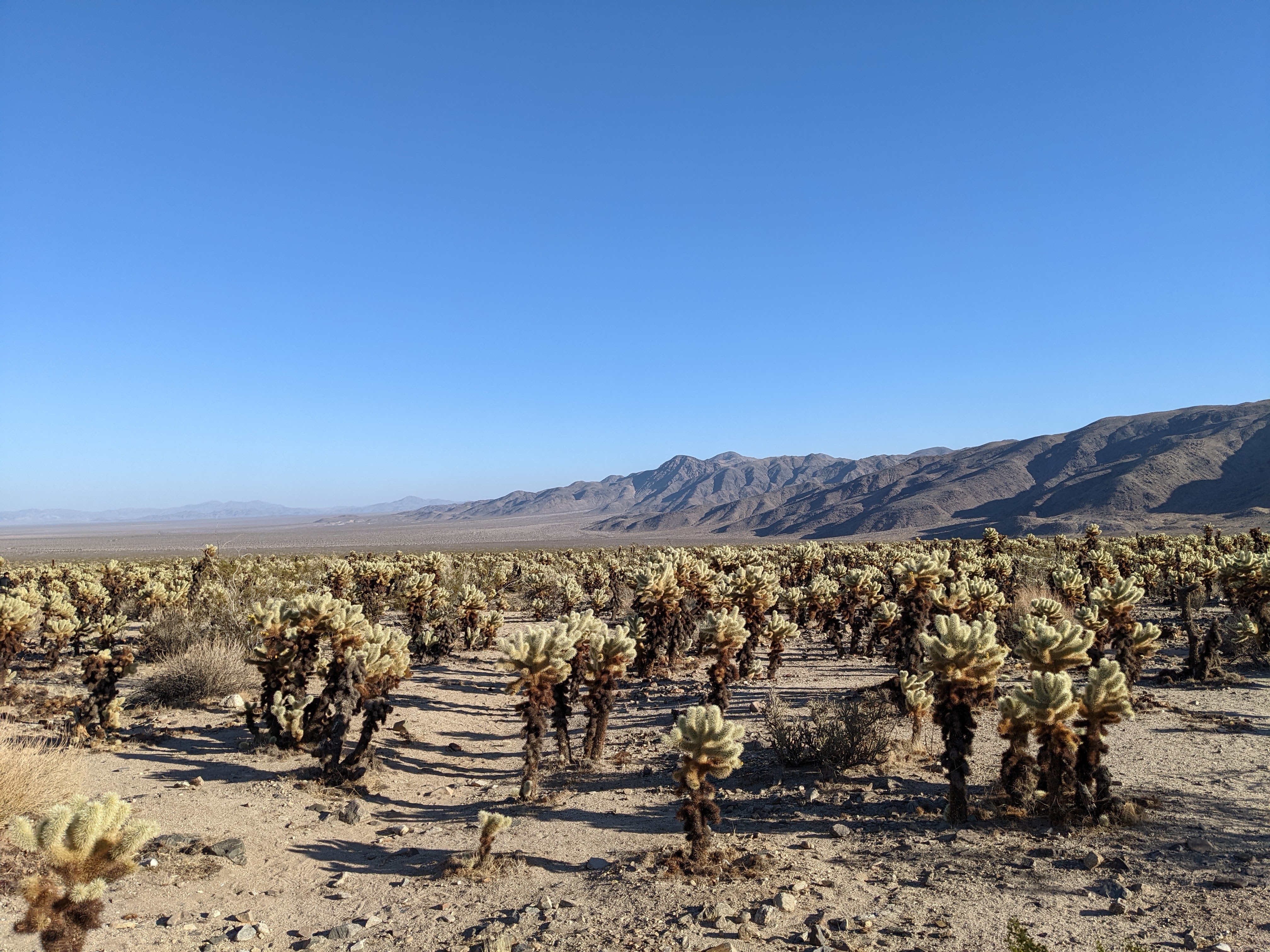 Which isn’t nearly as bad as it sounds. Just some formations popping out of level ground where you can watch rock climbers top-rope what look to be seriously inadvisable routes. We poked around a few other sites and sights in the western (Mojave desert) half of the park before cruising downhill to the warmer and less windblown eastern (Colorado desert) half. Roamed the Cholla Cactus Garden. J. Smeaton Chase, early chronicler of these deserts, is widely quoted as offering, “If the plant bears any helpful or even innocent part in the scheme of things on this planet, I should be glad to hear of it.” But they sure are pretty.