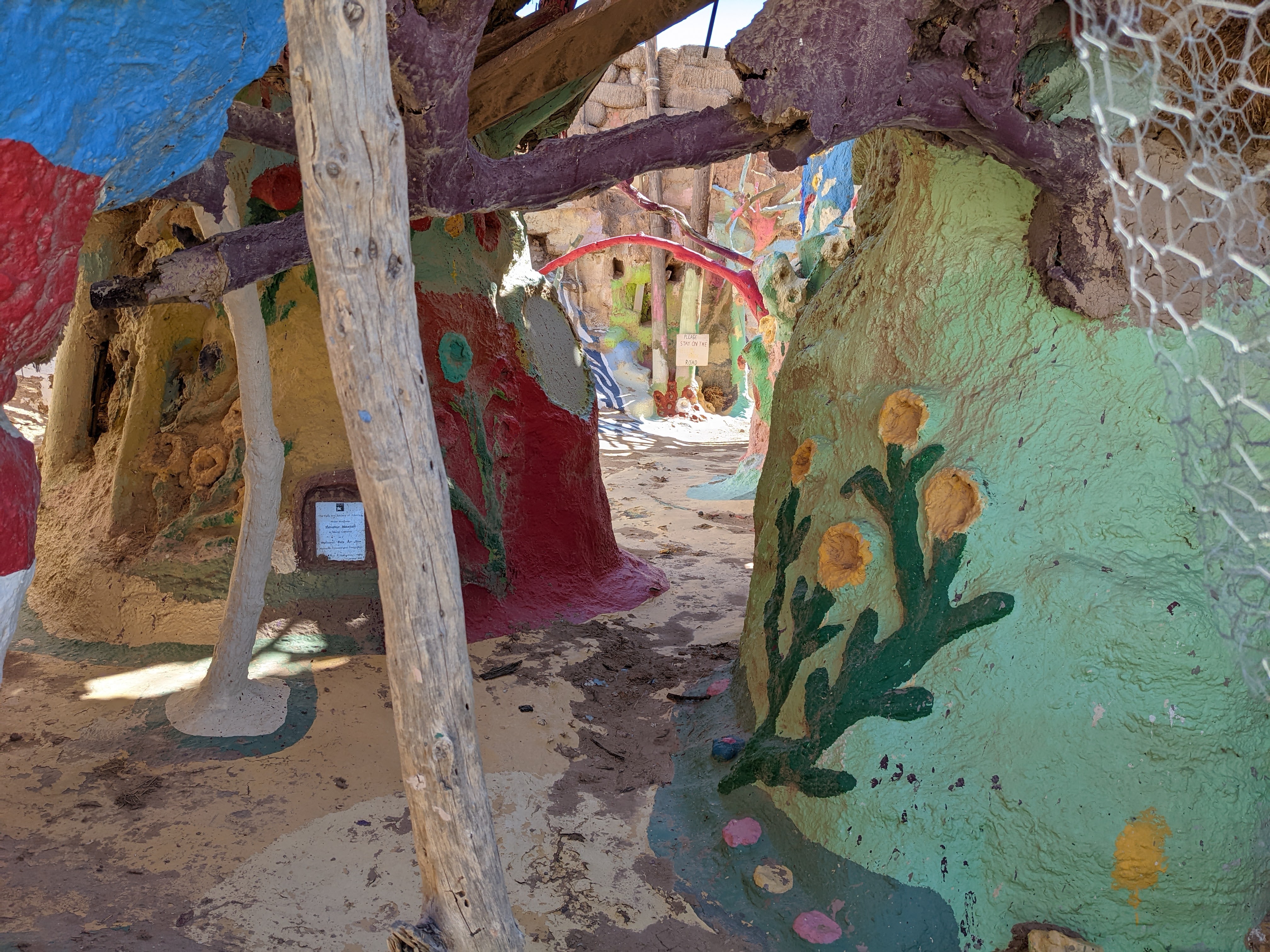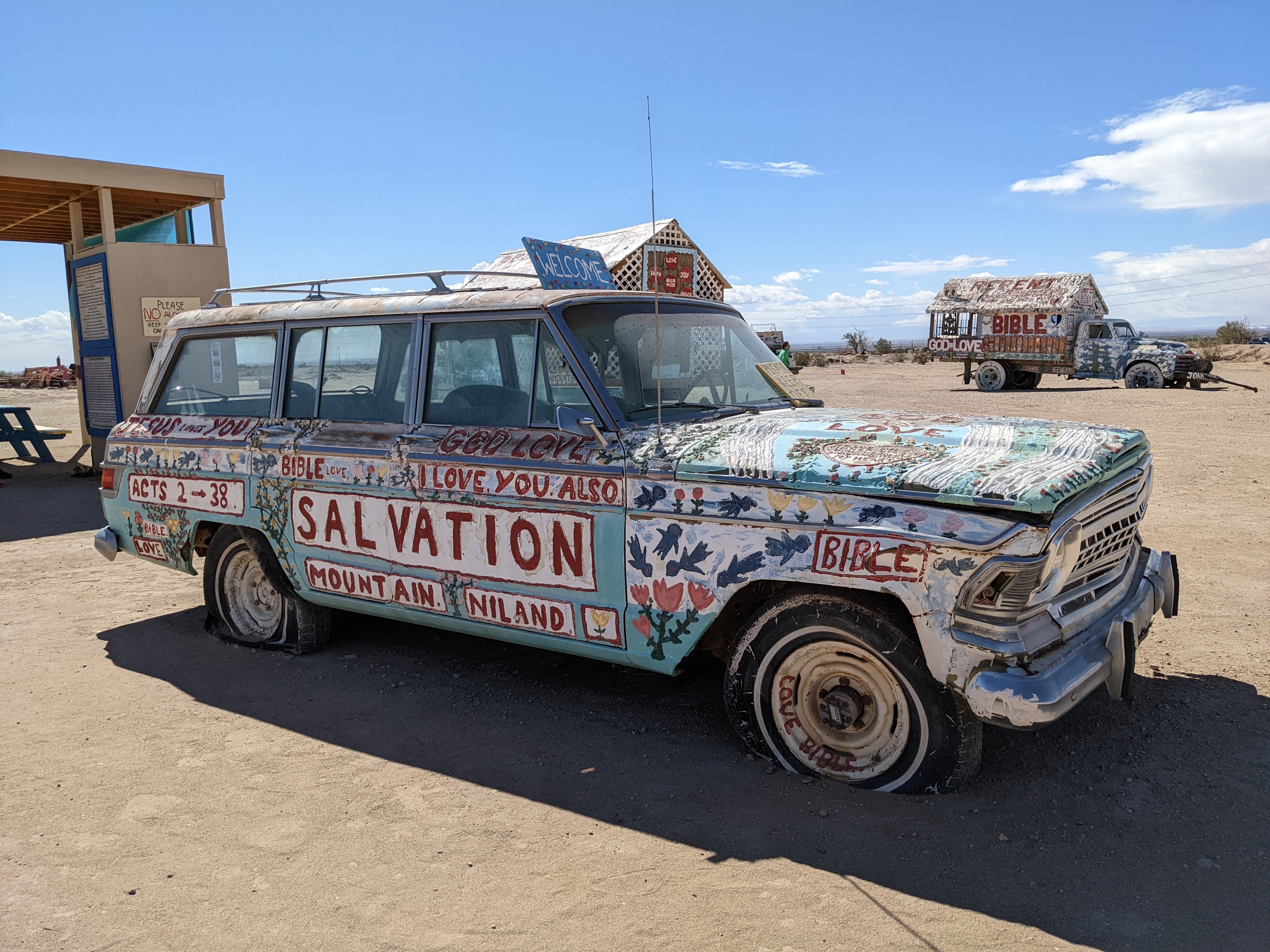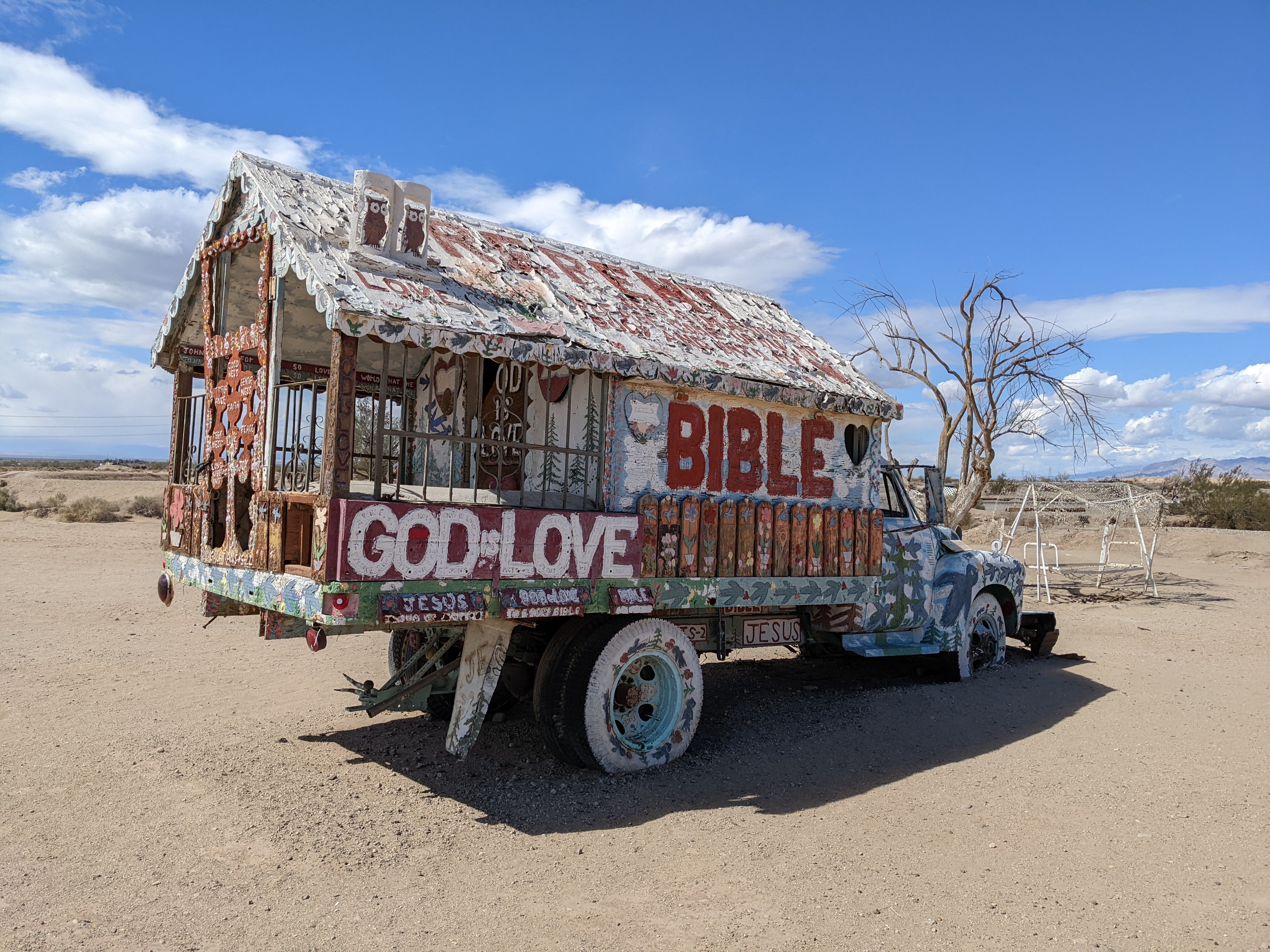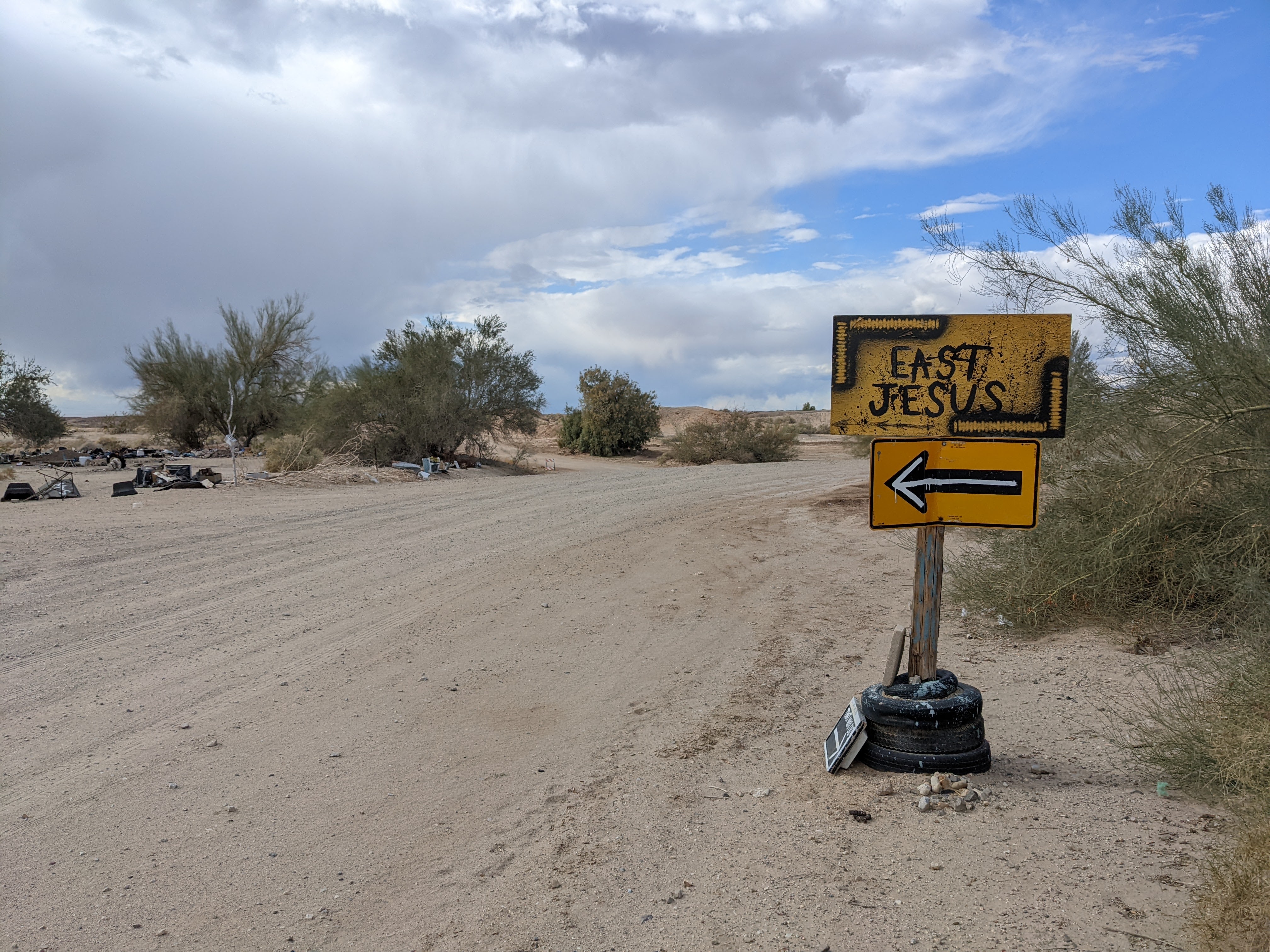 It’s getting late, and I’m still trying to make sense of what I saw at Slab City itself, so I’m going to move on from it to touch briefly on two of the more popular tourist spots on its outskirts. Yes, tourist spots. Ironically, at this point, this “last free place on earth” complaining about government overreach and the capitalist treadmill has developed into a bit of a tourist destination. Tourists (like us!) come by to see what the fuss is all about and take pics of ourselves at East Jesus and Salvation Mountain, both of which take Venmo and PayPal.