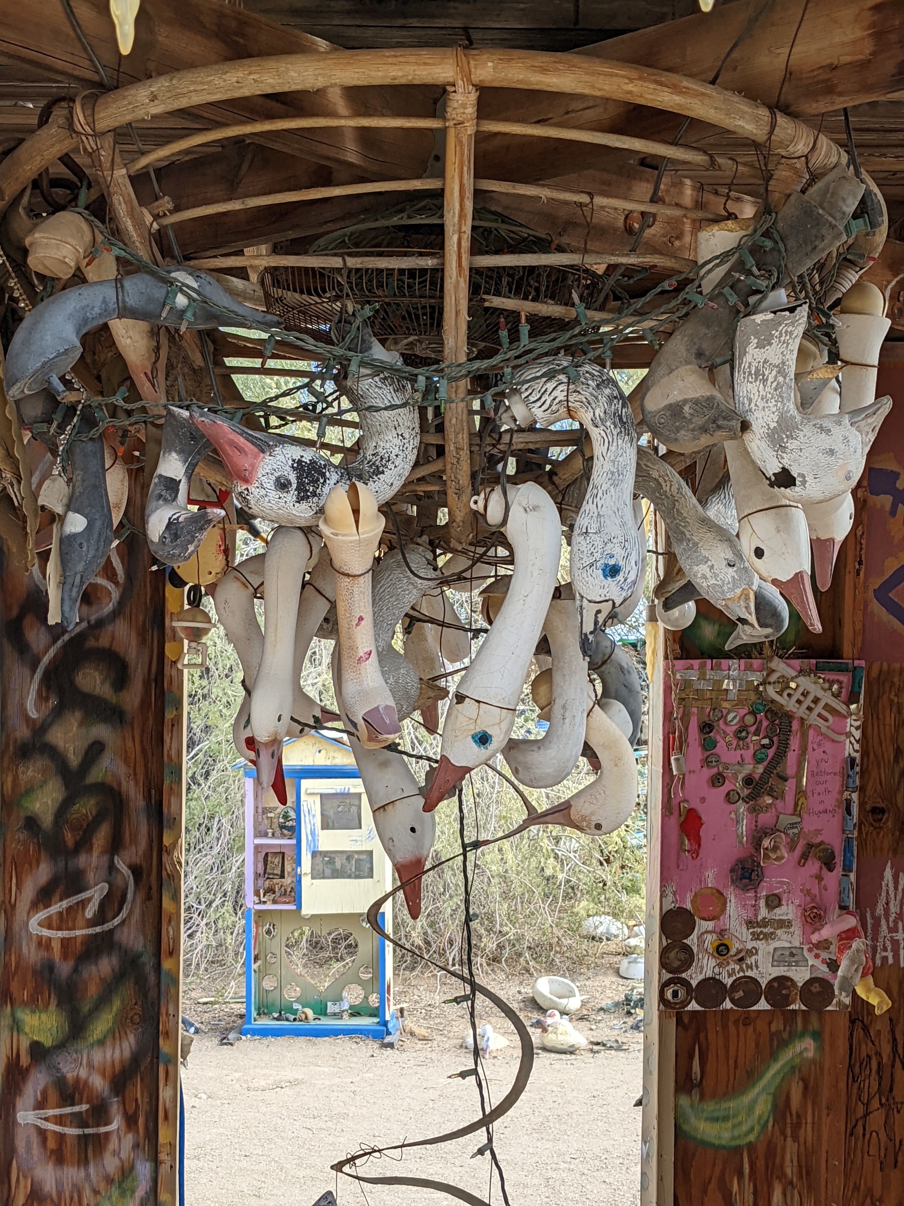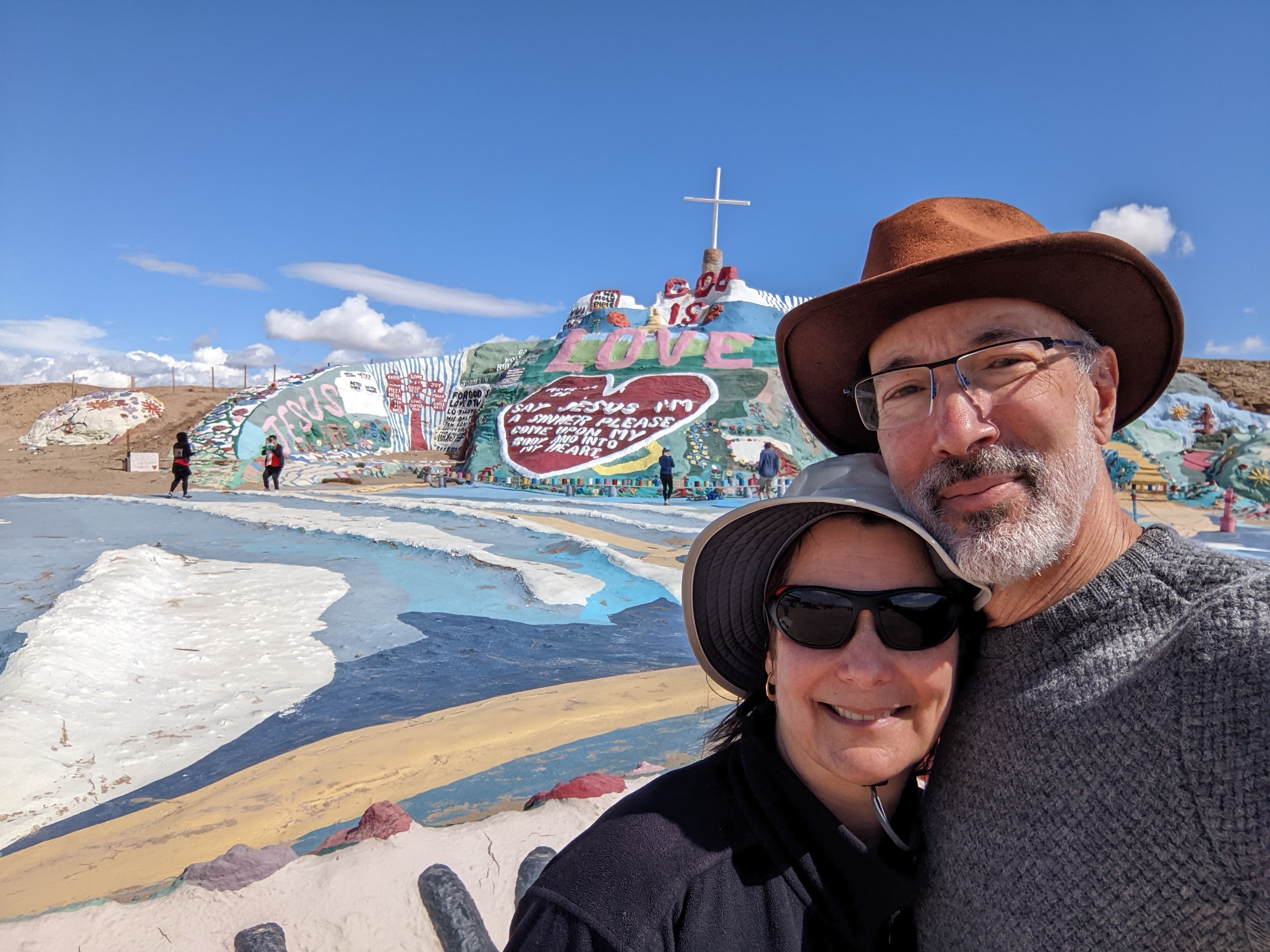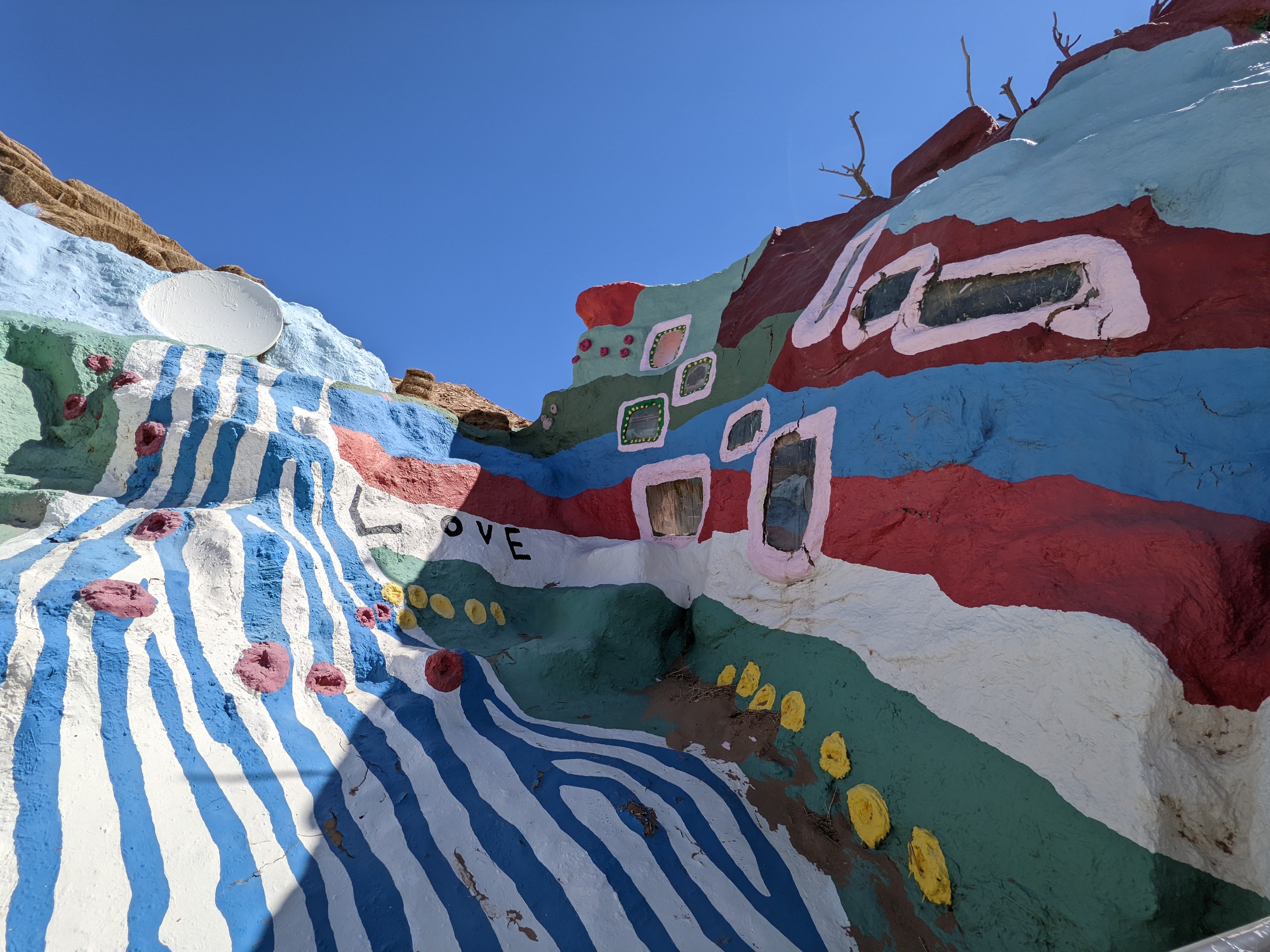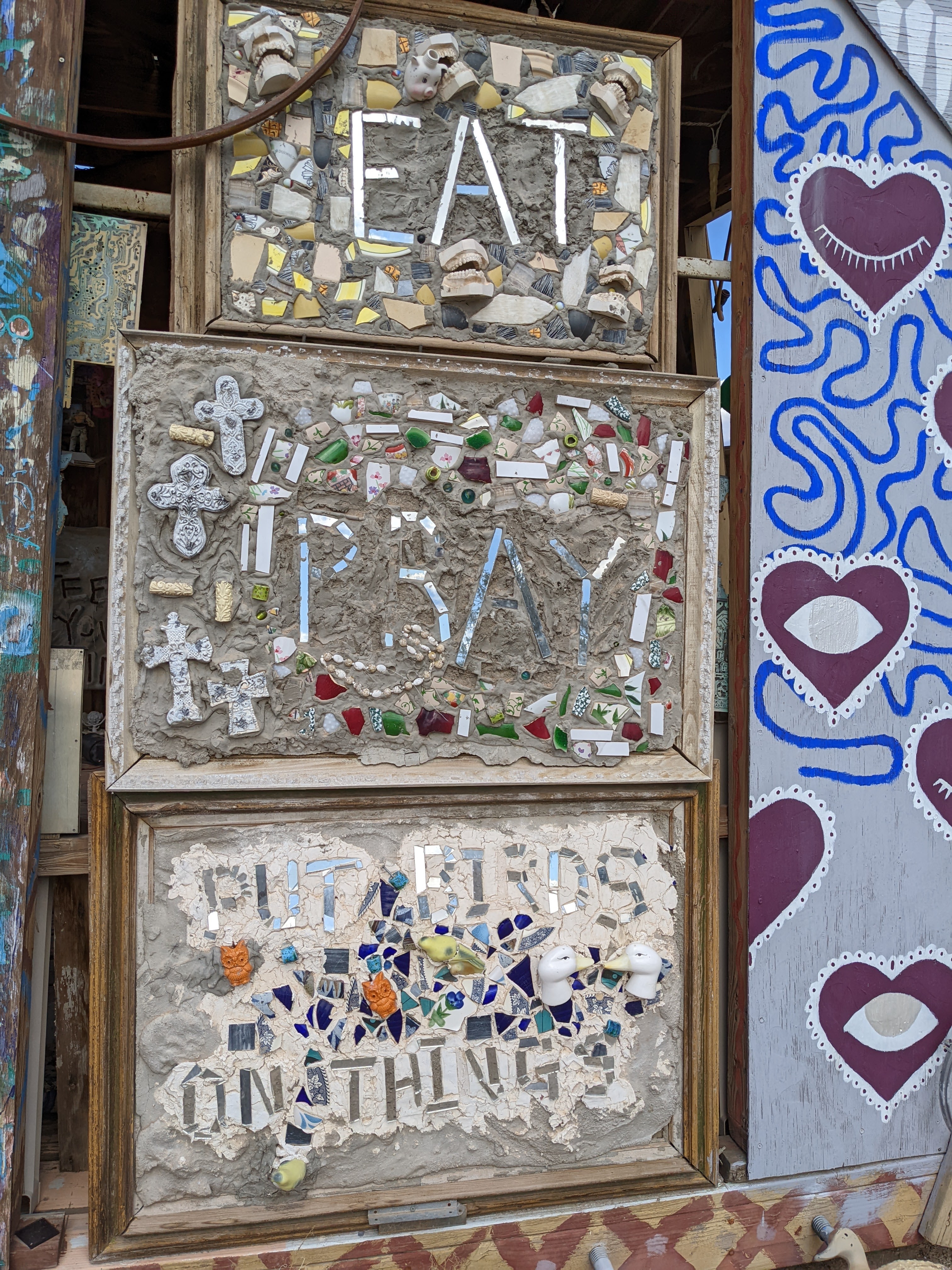 It’s getting late, and I’m still trying to make sense of what I saw at Slab City itself, so I’m going to move on from it to touch briefly on two of the more popular tourist spots on its outskirts. Yes, tourist spots. Ironically, at this point, this “last free place on earth” complaining about government overreach and the capitalist treadmill has developed into a bit of a tourist destination. Tourists (like us!) come by to see what the fuss is all about and take pics of ourselves at East Jesus and Salvation Mountain, both of which take Venmo and PayPal.