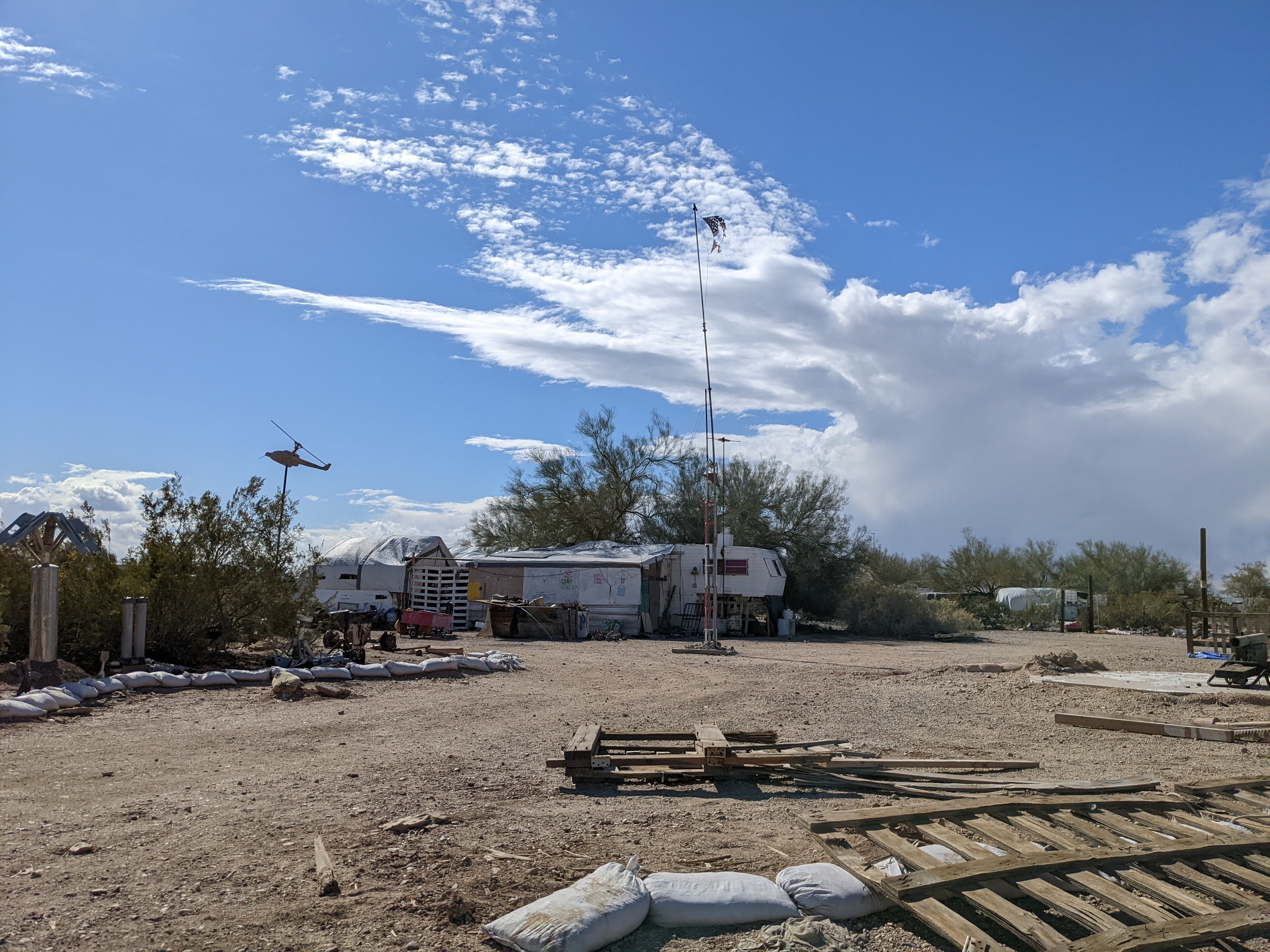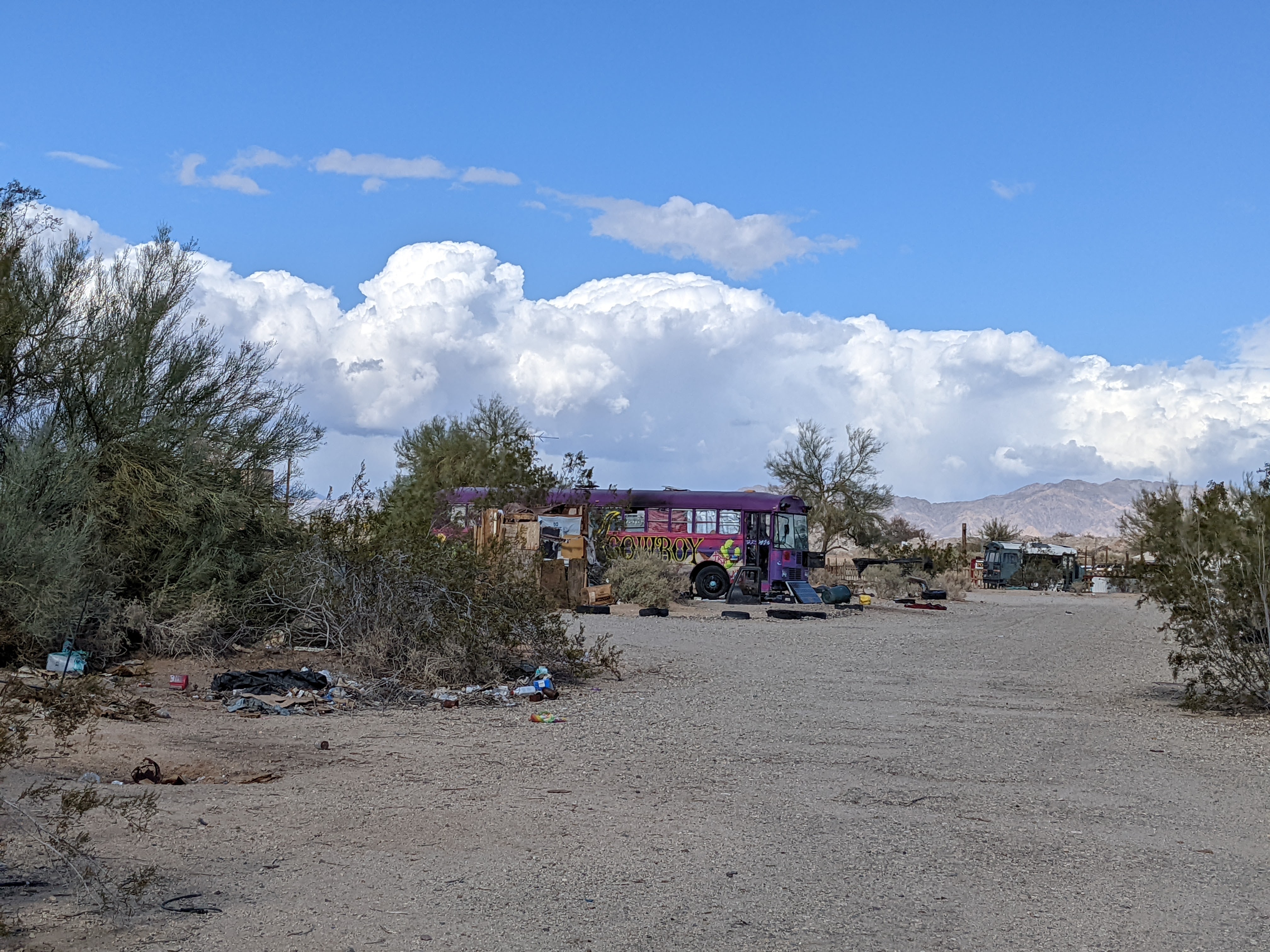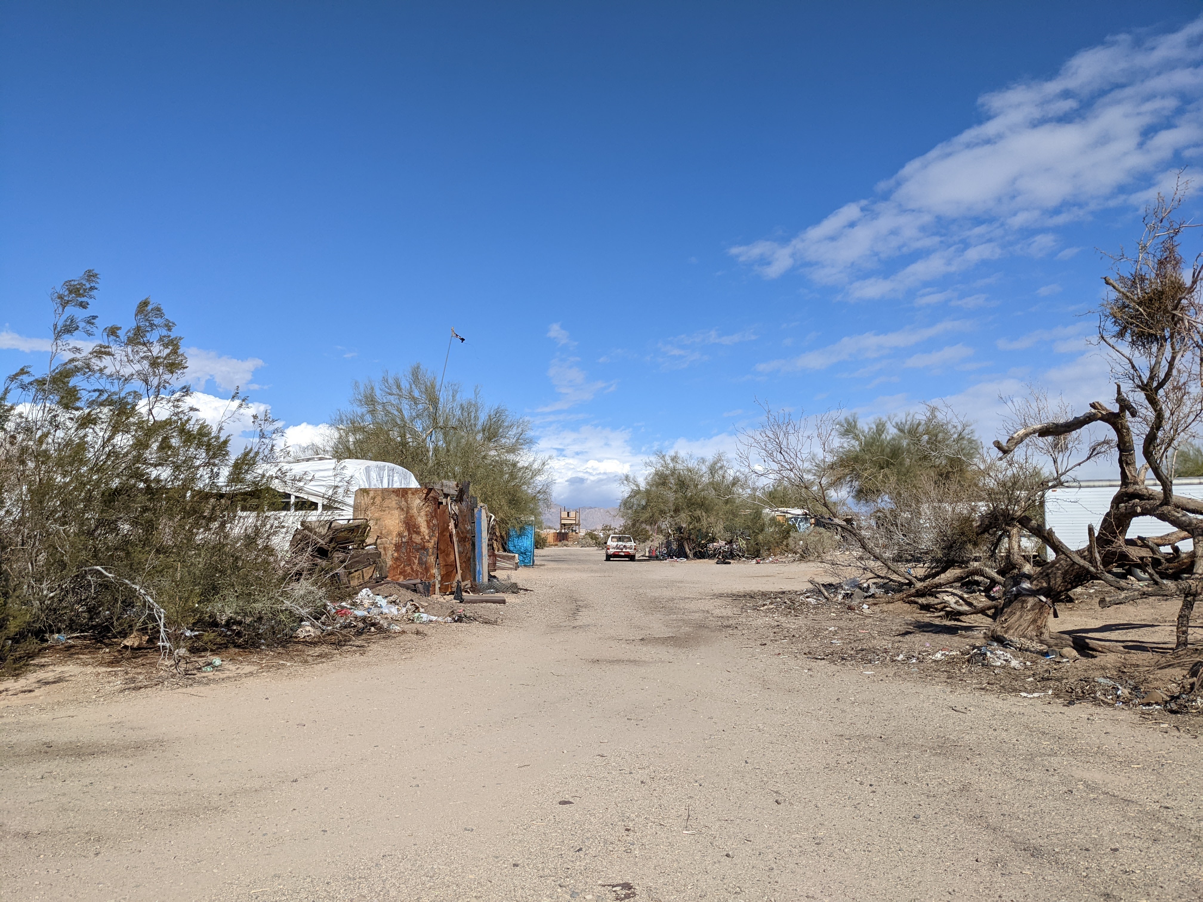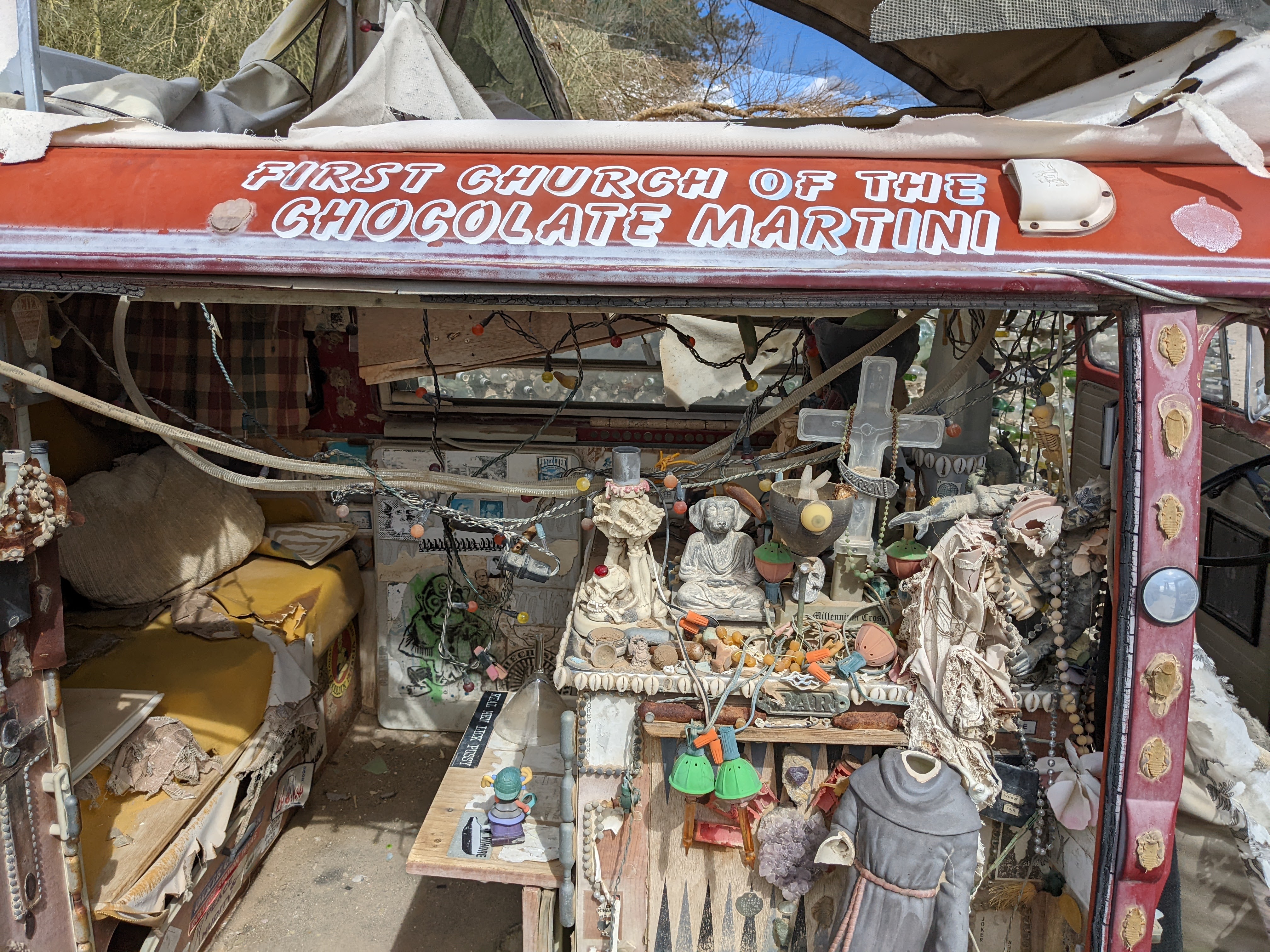 One such local “economy” – and I use the term with caution – is Slab City, a here-and-now embodiment of Crumb’s post-apocalyptic vision of the future. Slab City revels in its self-proclaimed reputation as “the last free place on earth,” and occupies a dusty grid of a half-dozen desert blocks on federal land, populated by a hundred or so folks who like the idea of making and living by their own rules. Visually, it looks much like what you’d expect: a couple of small secluded, well-fenced (geez – razor wire?!?) high tech compounds tucked away from the hoi polloi of half-burnt out school buses-turned residence, sagging campers, torn and battered tarps stretched over pipe frames, rusted shipping containers and cobbled-together wood frame shanties. Trash of all kinds blowing in the wind, with stripped and overturned cars marking street corners.