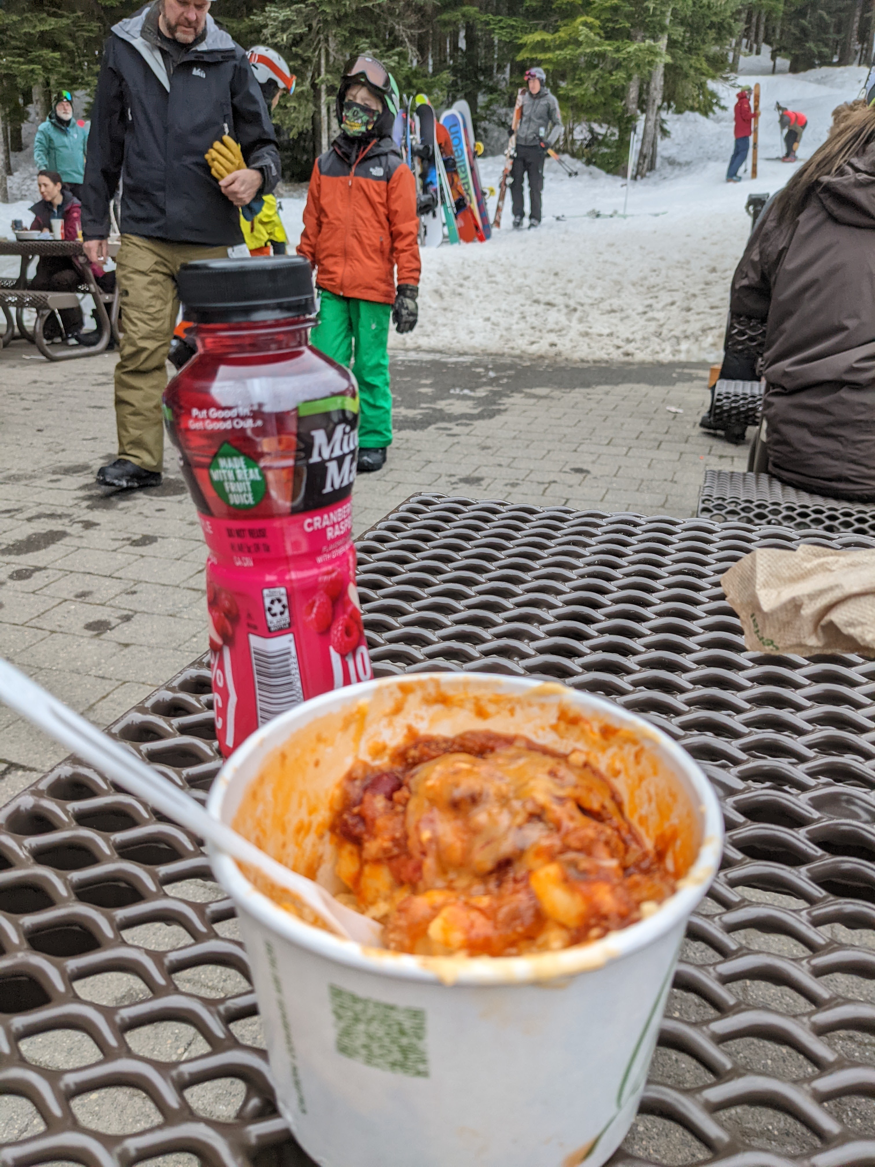 Even the food servers – for some reason I have come to expect the kids stuck behind the food service counters at ski areas to be surly – were almost unnaturally cheerful. I’d masked up and waited through the line to discover that the offerings were a bit sparse: mac and cheese, chili, or teriyaki chicken. I was feeling wild and asked the young lady if maybe they might be able to see their way to doing some sort of half-mac-and-cheese half-chili thing. “Chili-Mac?” she said, “Totally!” and threw a knowing look at the woman running the crock pot like they’d both been waiting for someone to make this very request. Honestly, the whole day felt a little like that dance scene from 500 Days of Summer.