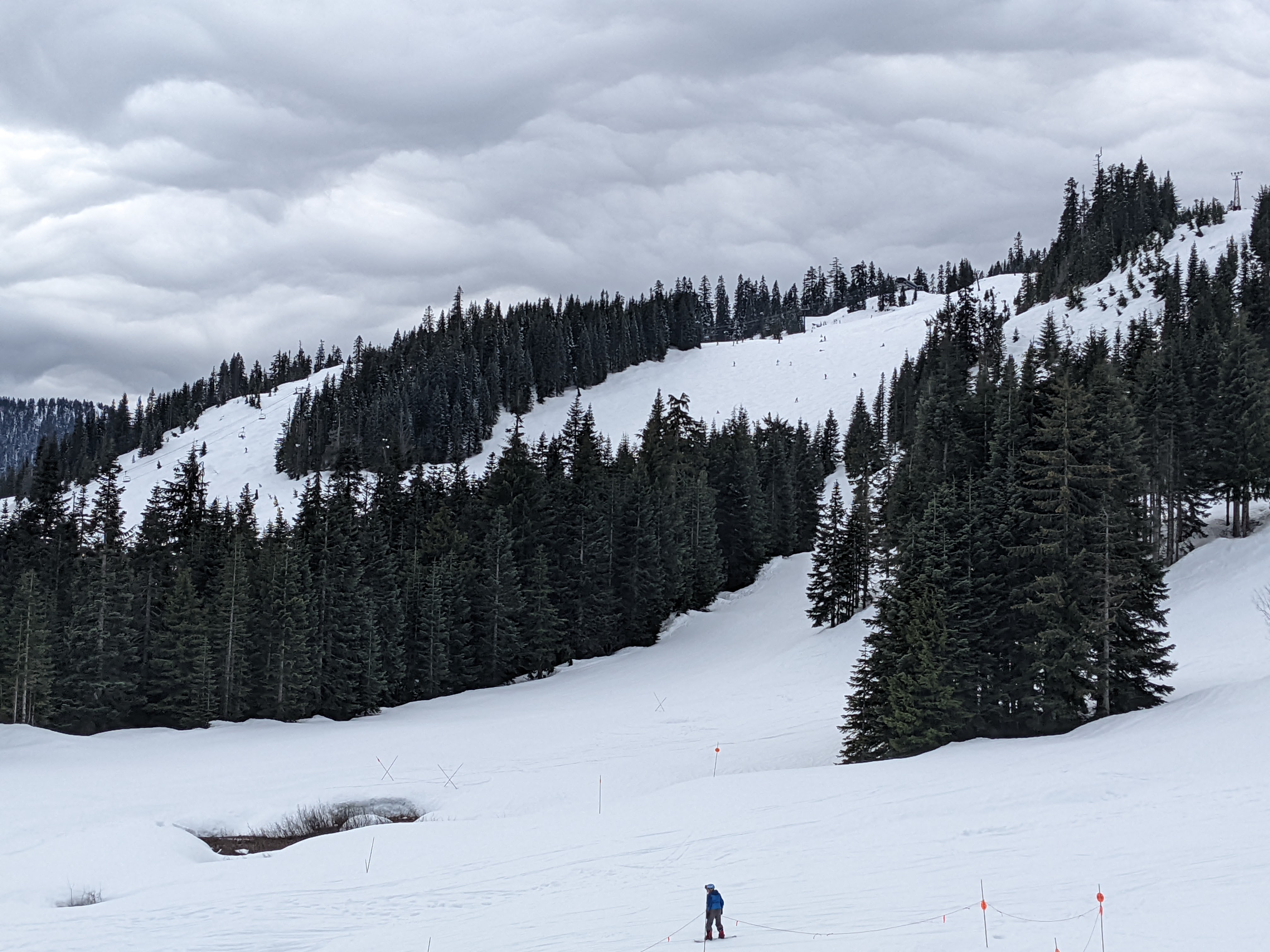 And yet, this morning, having had a shower and leisurely breakfast at home, I found myself barrelling down the slopes at Snoqualmie Pass by about 10. And what a mountain – or, er, bunch of mountains – it is. Mind you, it’s not huge, but with more than a dozen lifts distributed between the east, central and west summits, and more tucked around the corner at Alpental, it was a total all-you-can-eat snow day. Spring conditions – soft, still-plentiful snow, and temps in the upper 30’s. Almost no lift lines – don’t think I ever waited more than 30 seconds to load – and everyone dialed in really nicely, checking in on COVID protocols: “Double up with you?” “Sure – actually, let me drop back and ride with this guy so we’ve got more space.” It felt more like one of those family operations from years gone by than some modern Epic Megapass Resort Experience. Lift attendants wanting to know how your run was, and offering recommendations they’d picked up from other skiers.