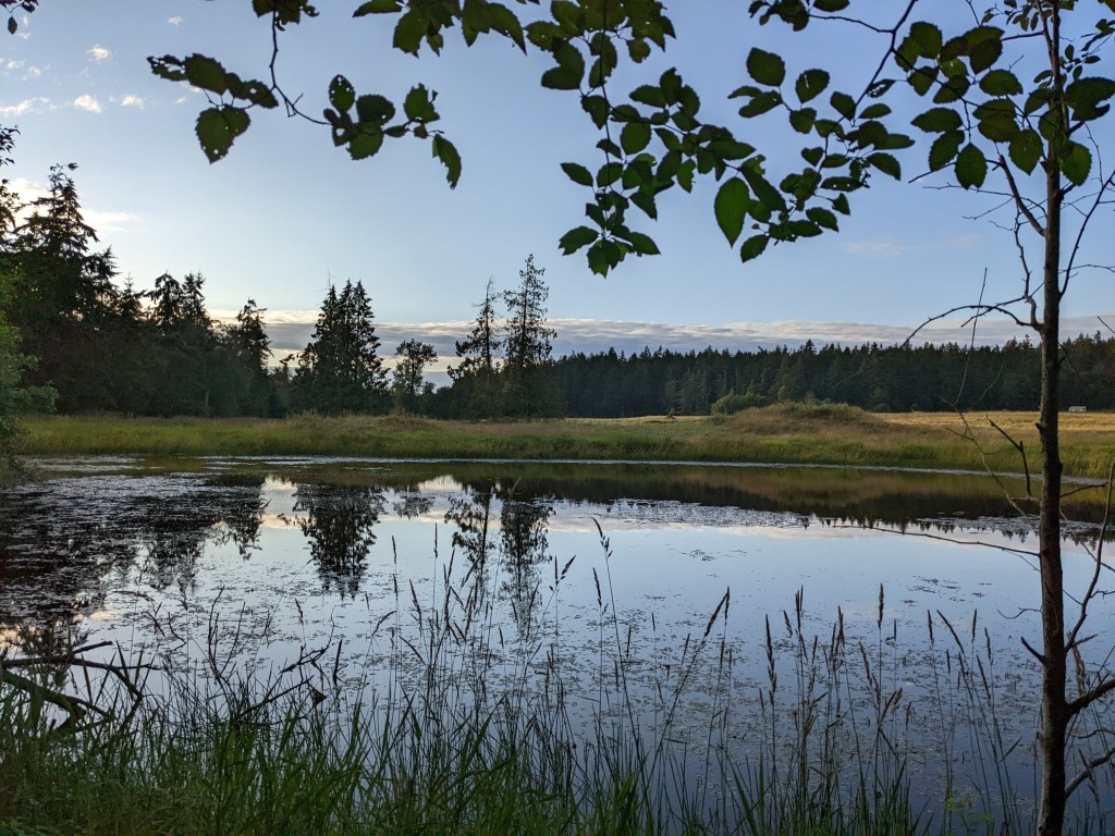 I was lying on my back in the brush pasture at dusk last night – when’s the last time I did that? I mean, just plonked onto my back, in the grass, in the woods, even? Said, Hell with the mosquitos (yes, I’m regretting having worn shorts) and surrendered to gravity, to the lack of gravity of the moment and just put yourself down against the waiting earth? I didn’t know why I did it just then, but there I was. Maybe it was the late bluing sky as the last of the day’s overcast melted, flat light from the west running the earth’s greens and golds and browns bright and fast across the land, shadows looming and spreading in their wake. Maybe it was the sound of birdsong, urgent, mysterious and everywhere around me. Or the smell of hay. We’d not hayed the brush pasture, but from below, where the horses used to graze, the windblown remains of windrows seeped the scent of a later time in summer from uneven, golden phonograph grooves.