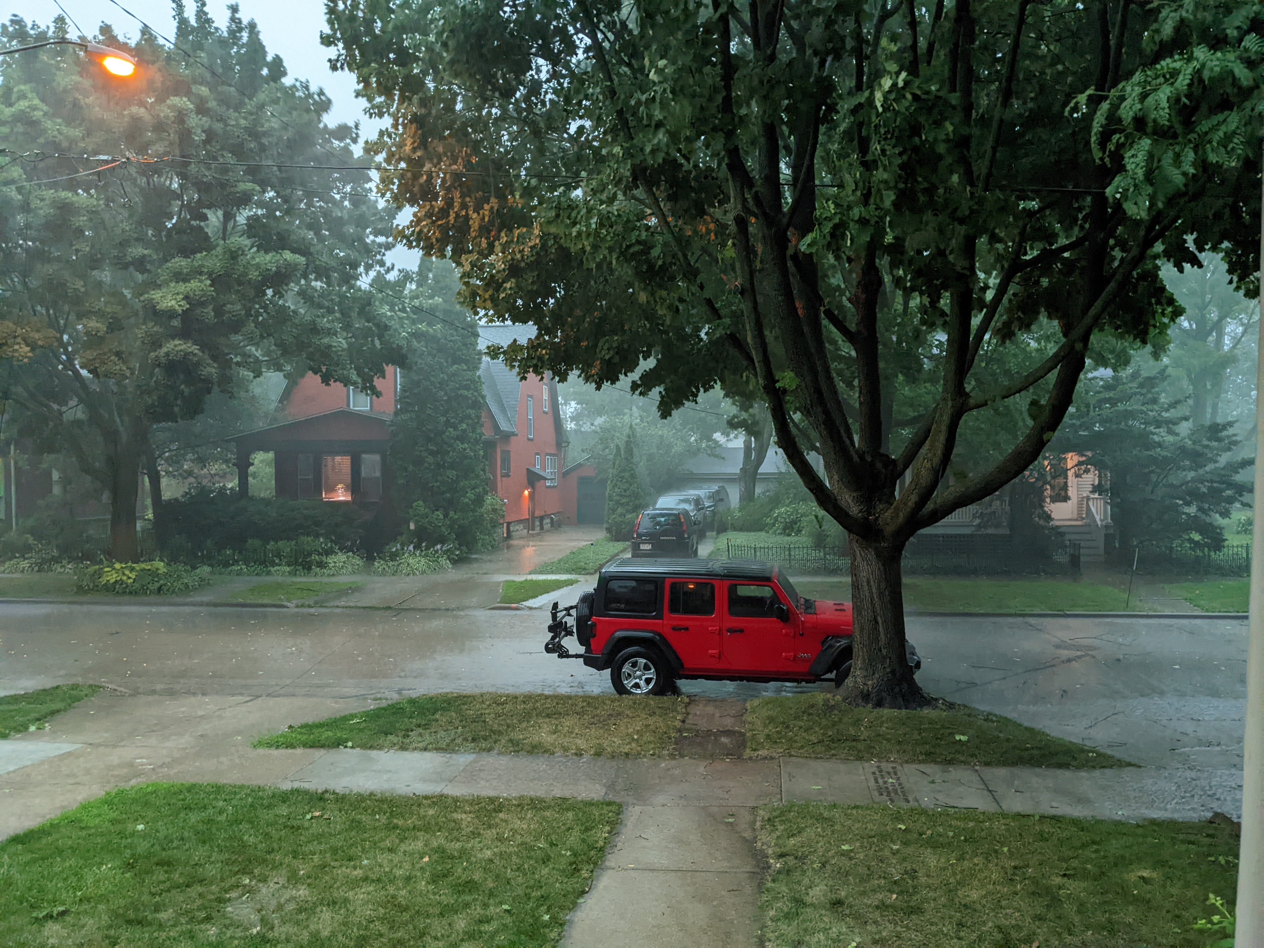 You see, we (by which I mean Ellen) cleverly timed our visit to overlap with Appleton’s annual “Art in the Park” thing, a two-day art, food, music and thunderstorm extravaganza laid out half a block from her house. The thunderstorm wasn’t part of the planned activity, but this is Wisconsin in July, so it was gonna come, invited or not. But aside from the evening downpour, there were amazing kinetic sculptures, broad wall-spanning watercolor landscapes and tiny ones painted on paint chips, esoteric woven baskets, pottery, glass, donuts, gyros and of course (remember: Wisconsin) cheese curds served up on almost every corner in configurations a non-mid-westerner would be hard pressed to describe.