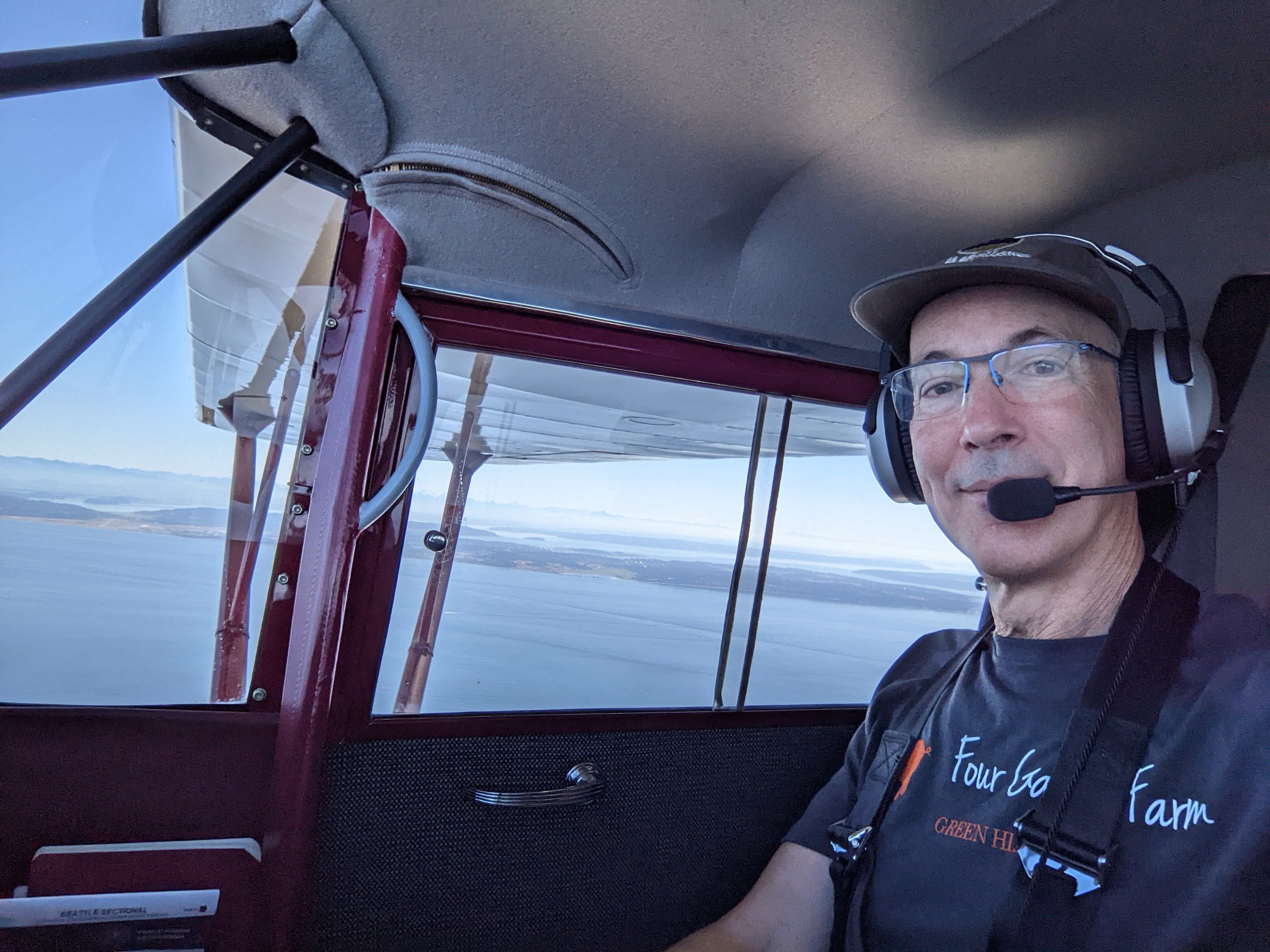 Stopped on Orcas Island and hitched a ride into town for coffee and pecan sticky buns, then walked the back way back to the airport. Came back low over the water, rocking my wings at sailboats and cavorted in the late afternoon thermals rising off the fields once I made landfall.