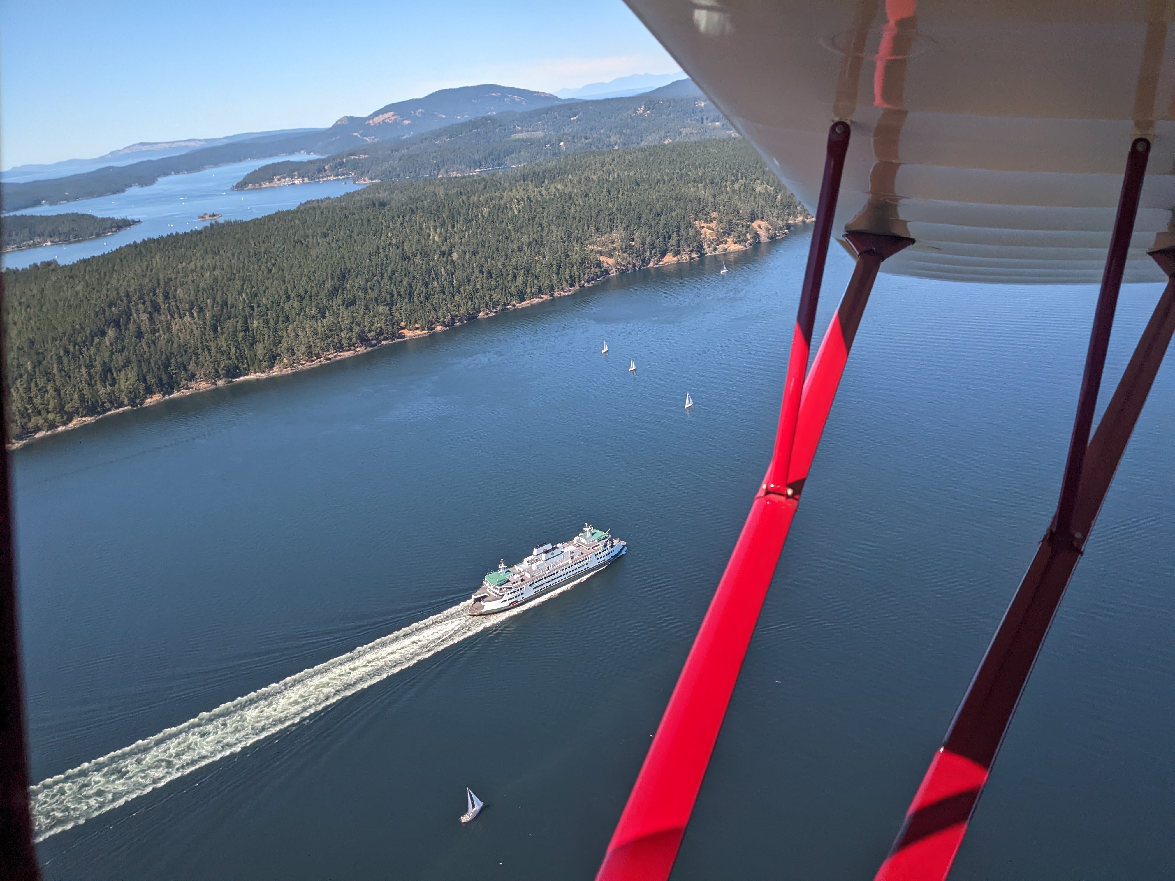 But delicious as market is, there always comes a point in the morning when I run short on social energy and need to retreat. Given the blue skies and fair winds – and the fact that it had been close to a month since I’d been in an airplane where me reaching for the controls wouldn’t trigger a federal incident – I headed for the airport. There, in the sky, puttering along, alone in the air banking over islands and bays, I am also at home. The mountains beckon, the grass fields below call to me. The inter-island ferry – one of the few things I can outpace in our trusty, if sedate little Skyranger – steamed along to its next stop. Race you?