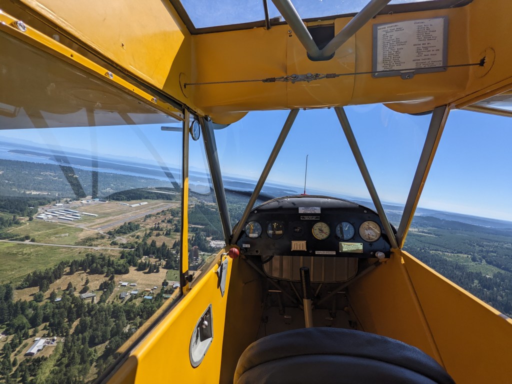 [Note to non-pilots: the Cub is a quirky plane – when flying solo, you fly it from the back seat, so yeah, in that first picture, the front seat is empty. It’s supposed to be empty.]