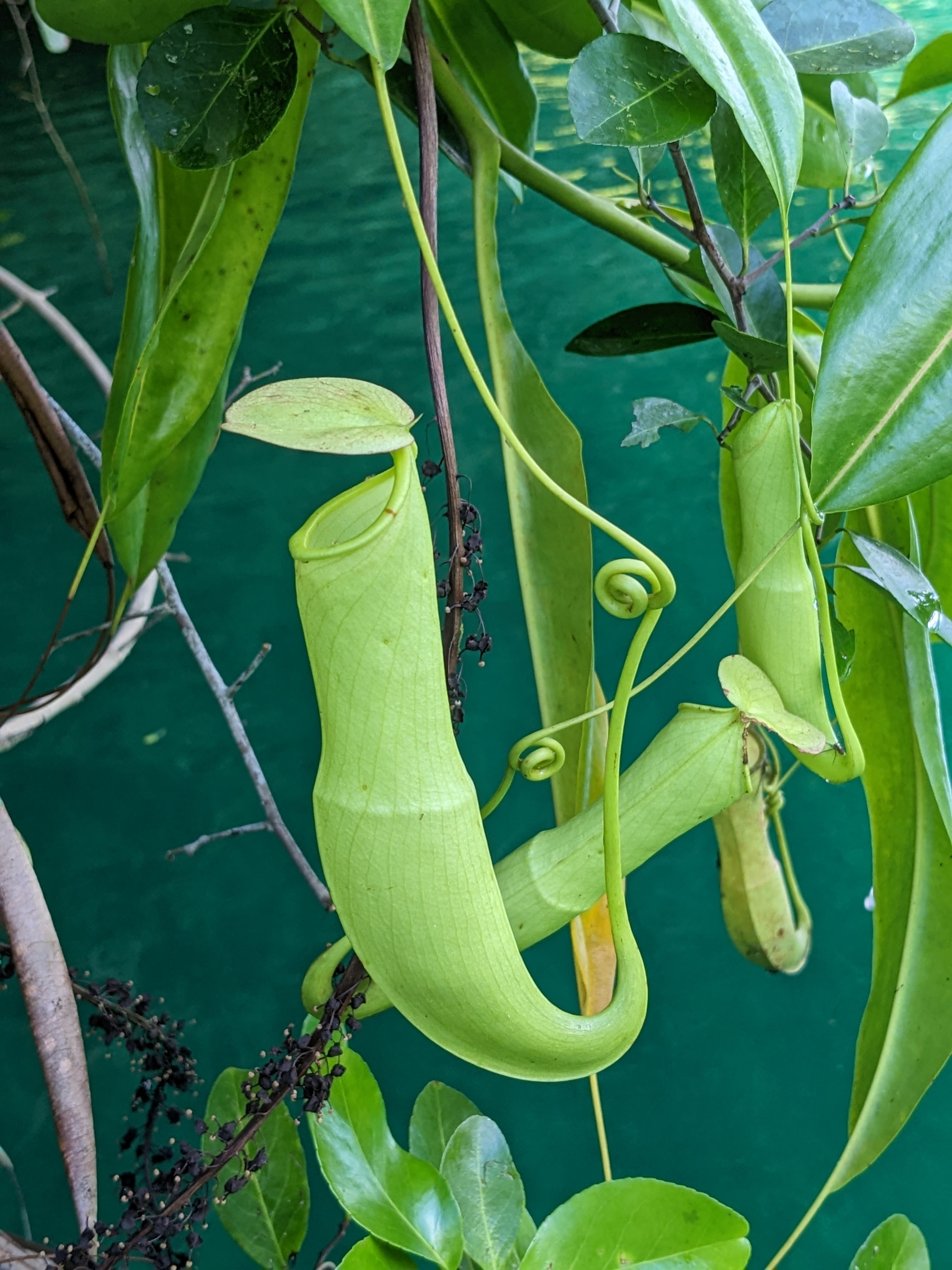 Of course the lake itself was spectacular, damn-near vertical walled, like everything else in Palau. We followed, tucked as much as we could into the ever-present rock overhangs, crowding in to hear Mac’s discourse on the zebrawood tree, the pitcher plant, the elegantly-flowered fish-poison tree and dozens of others that lined the lake. Or we drifted back to bask in the unearthly silence of the place.