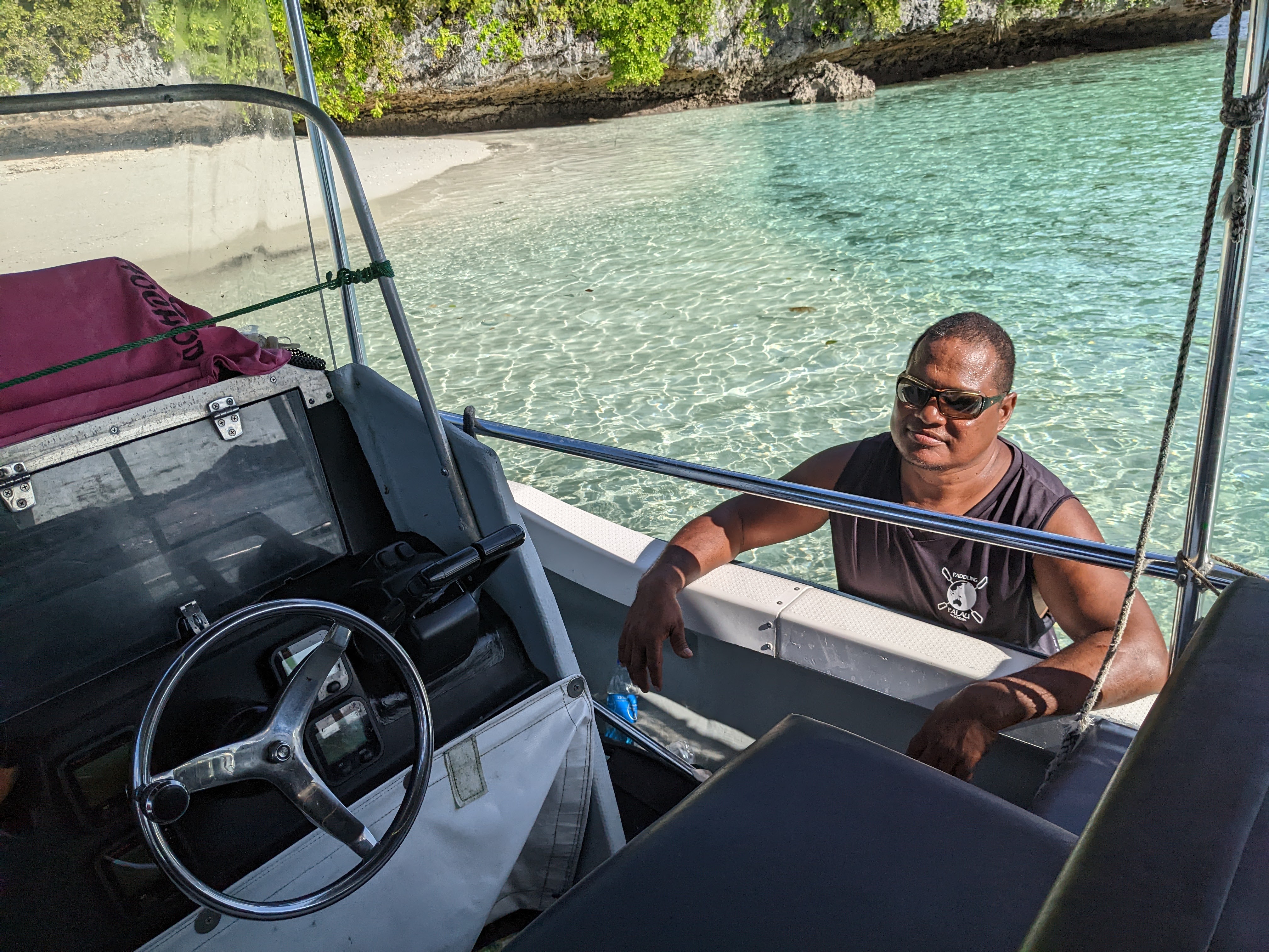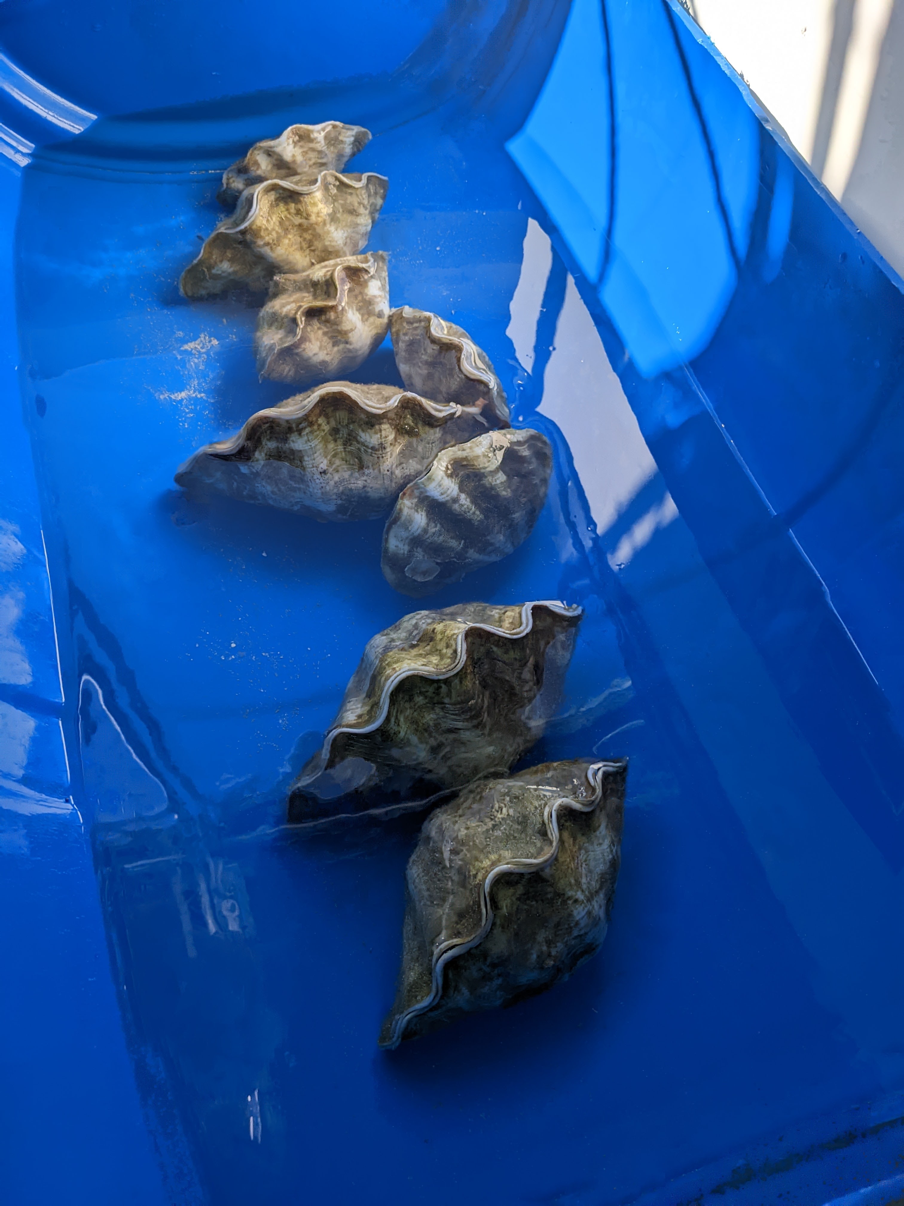 That’s a new thing that Paddle Palau is doing on their trips: planting baby giant clams. The not-so-baby giant clam can grow to over 400 pounds and live over a hundred years. But they, um, can take a hundred years to do that, and they’re apparently rather tasty (more so, I expect than sea cucumber). So to stave off their becoming endangered, some groups have begun farming anbd planting juveniles back into the wild. Mac had acquired eight of them – one for each of us, to place at some appropriate depth in the sand around the cove during our post-prandial snorkelings.